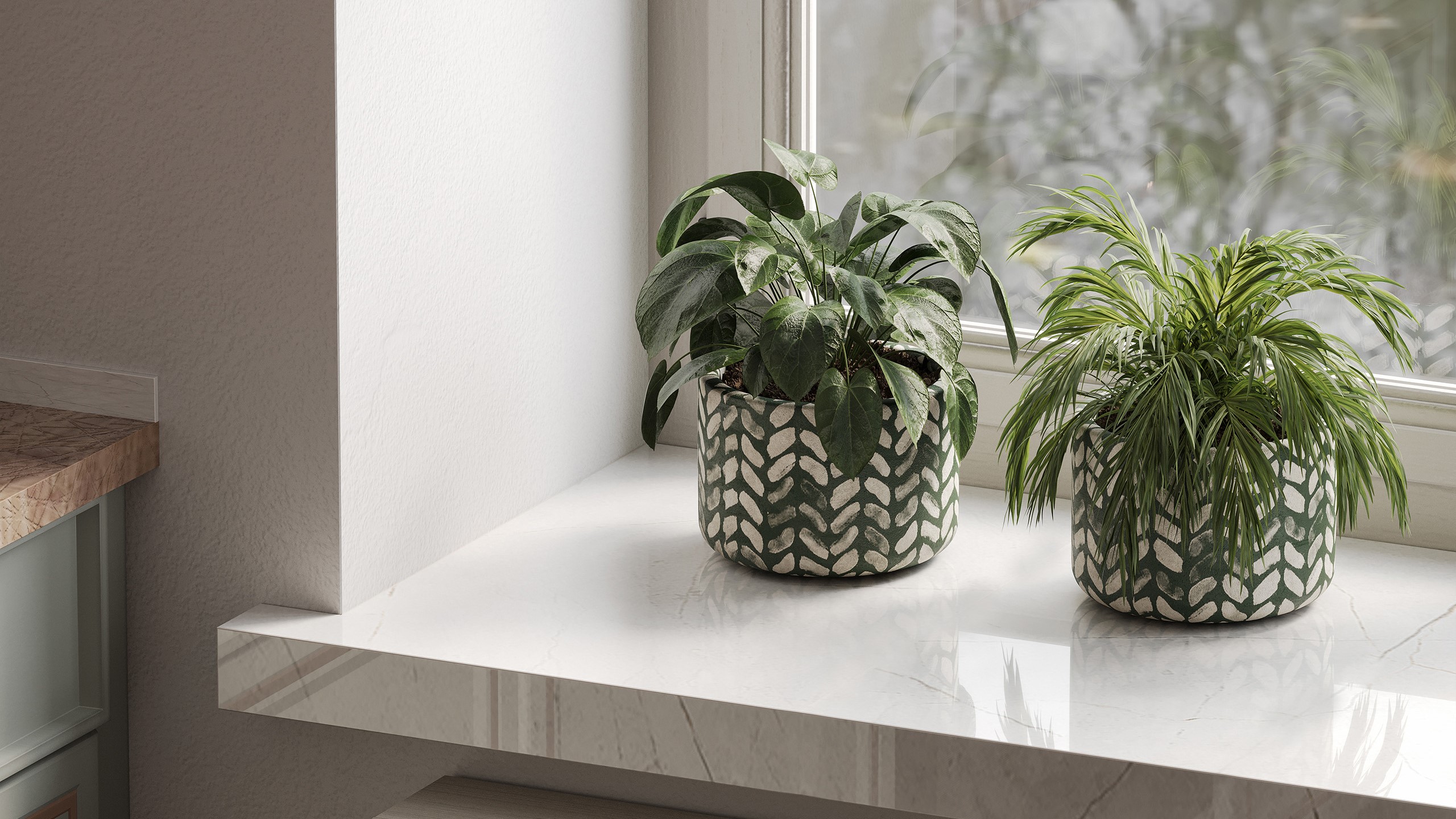 Подоконник из керамогранита устойчив к механическим повреждениям, солнечному свету и влаге. Поверхность не выгорает, не травмируется и не впитывает загрязнения. К тому же керамогранит доступен в разнообразных форматах и текстурах — от имитации натурального мрамора до бетона или дерева.
