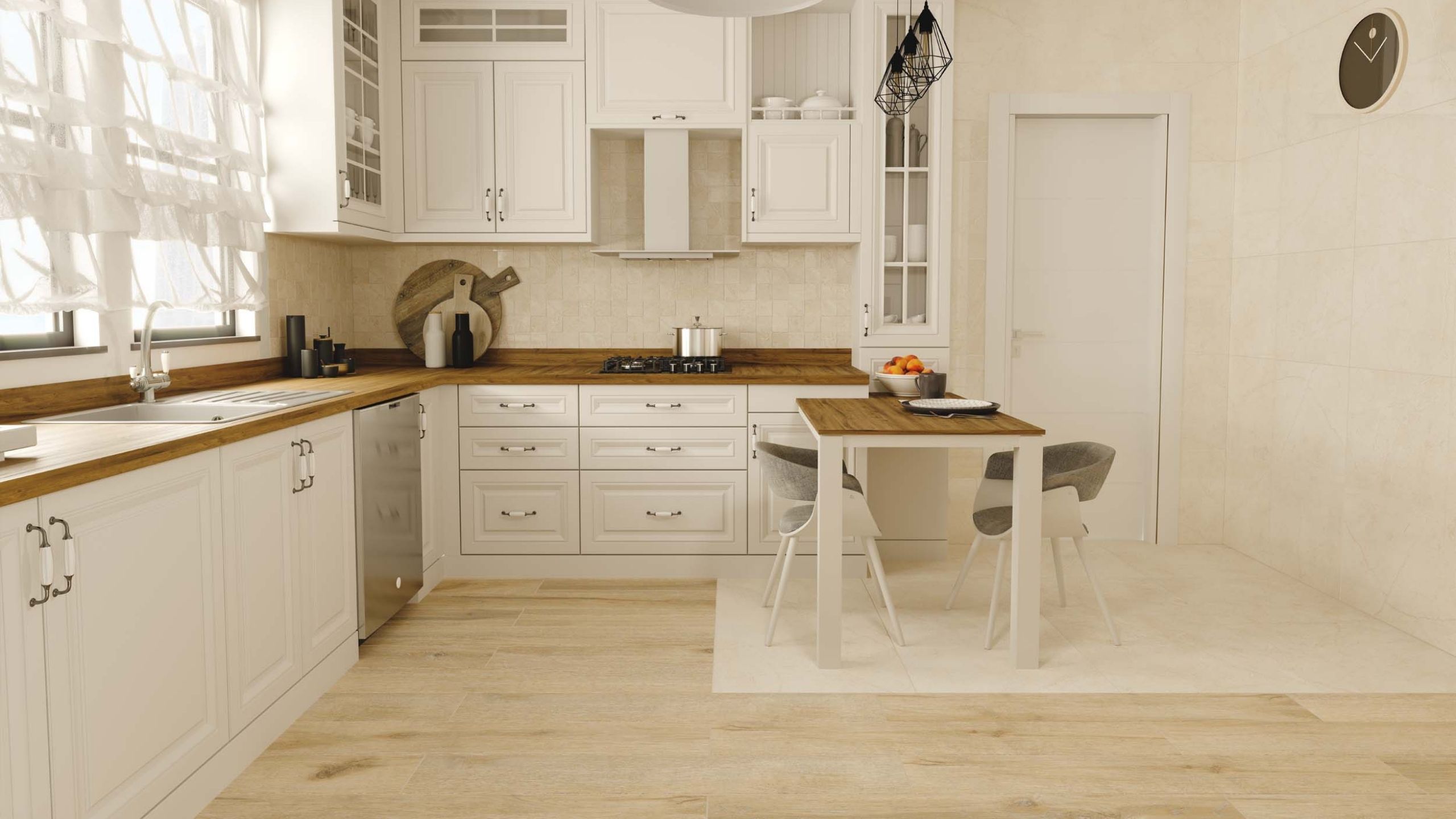 Для гармоничного сочетания отделки в кухне рекомендуется использовать универсальный керамогранит (подходит и для пола, и для стен) одной коллекции, например: