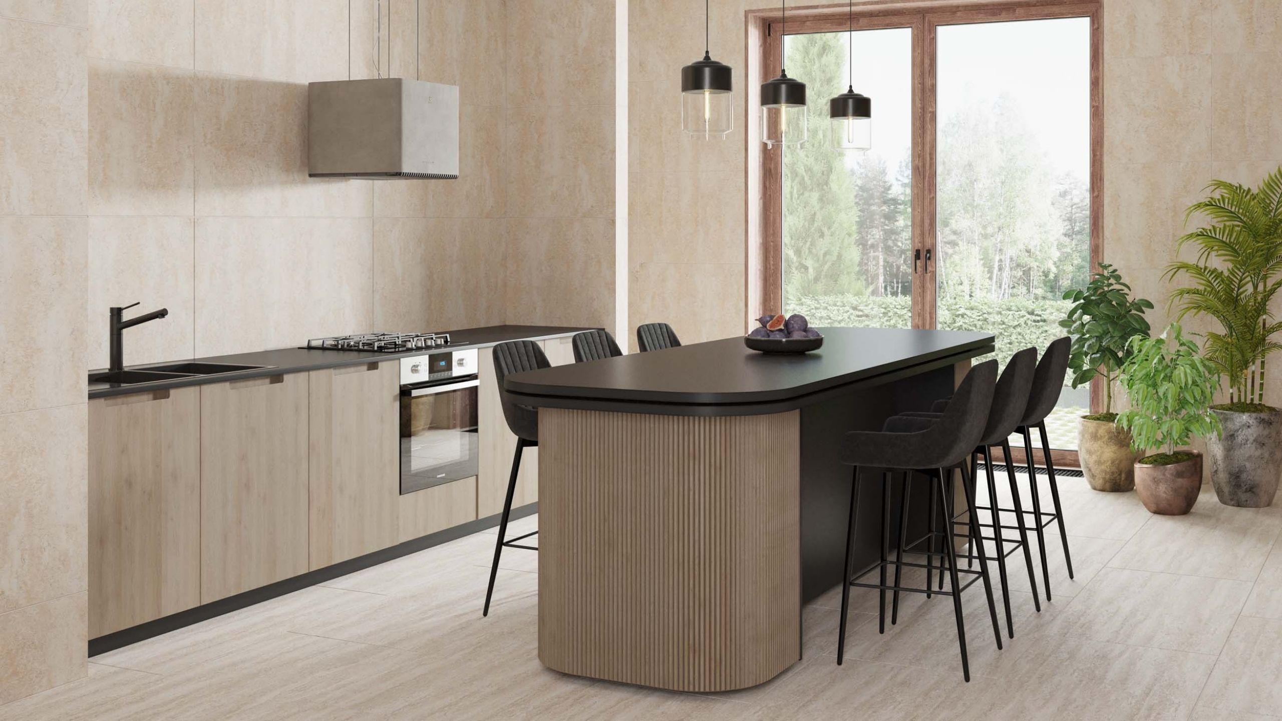 Среди всех облицовочных материалов для кухни керамогранит хорош и тем, что с его помощью можно организовать полностью все пространство, чтобы каждый элемент от пола до мойки дополнял и подчеркивал общий стиль помещения. При этом необязательно, чтобы они были в одном цвете, главное — сам материал.