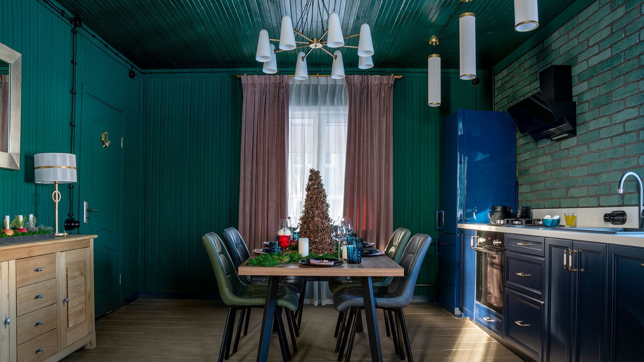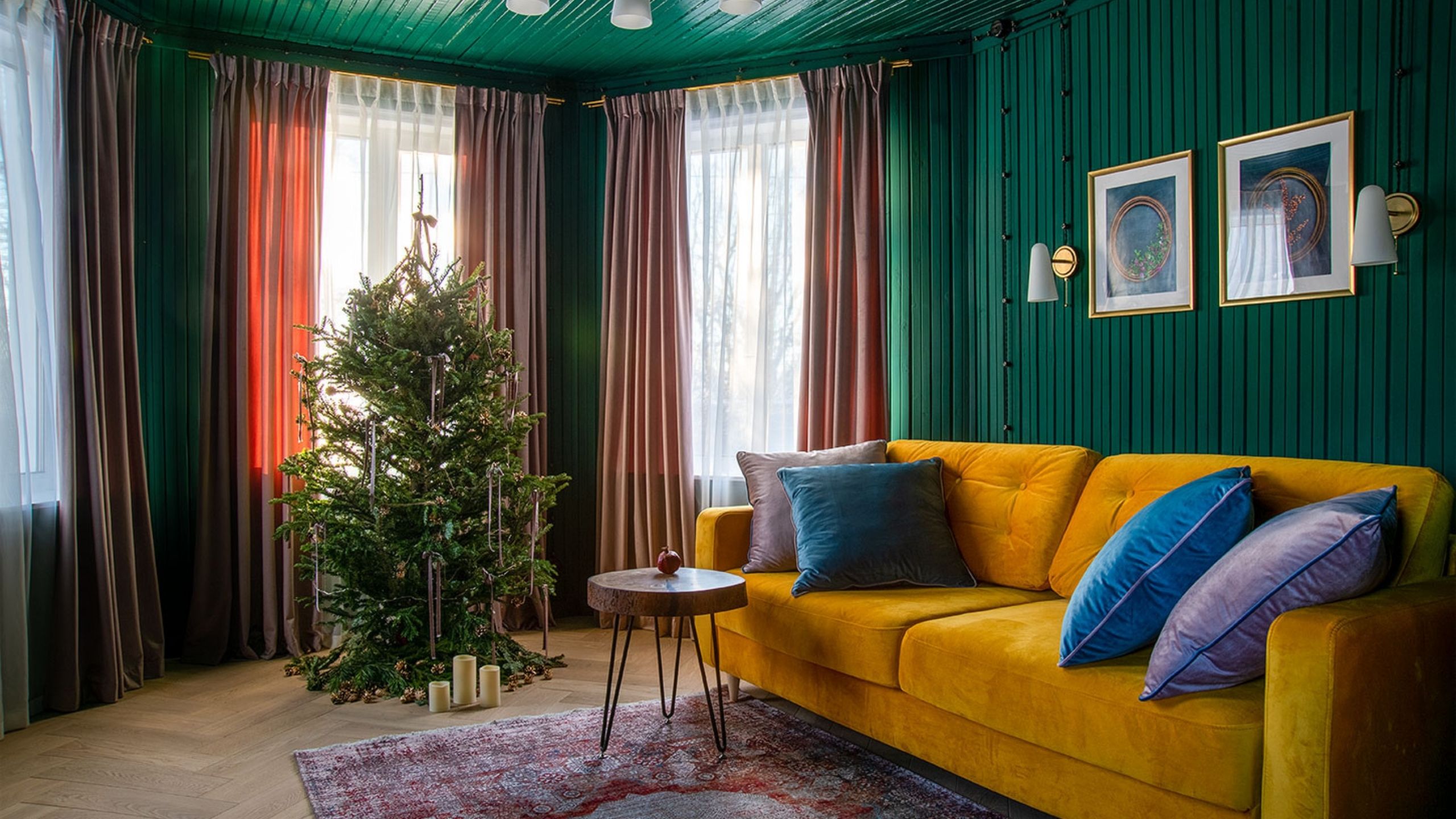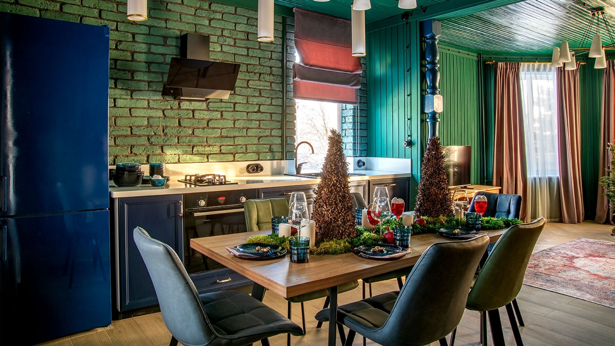 Дизайнер Дарья Пак переделала дачную гостиную для большой семьи на новогодний лад. Отделку стен и потолка оставила прежней, лишь перекрасив в насыщенный зеленый цвет. А в качестве напольного покрытия выбрала керамогранит под натуральное дерево из коллекции Classic Wood. Дизайнер зонировала пространство, выделила его часть под комфортную кухню с большим обеденным столом, чтобы места хватило всем. От традиционных и так любимых многими пастельных тонов отказалась: стены зелёные, диван ярко-жёлтый - смелое решение для дачного интерьера. Обеденный стол и новогоднюю ёлку украсила авторским праздничным декором. Получилось уютно, ярко и стильно.