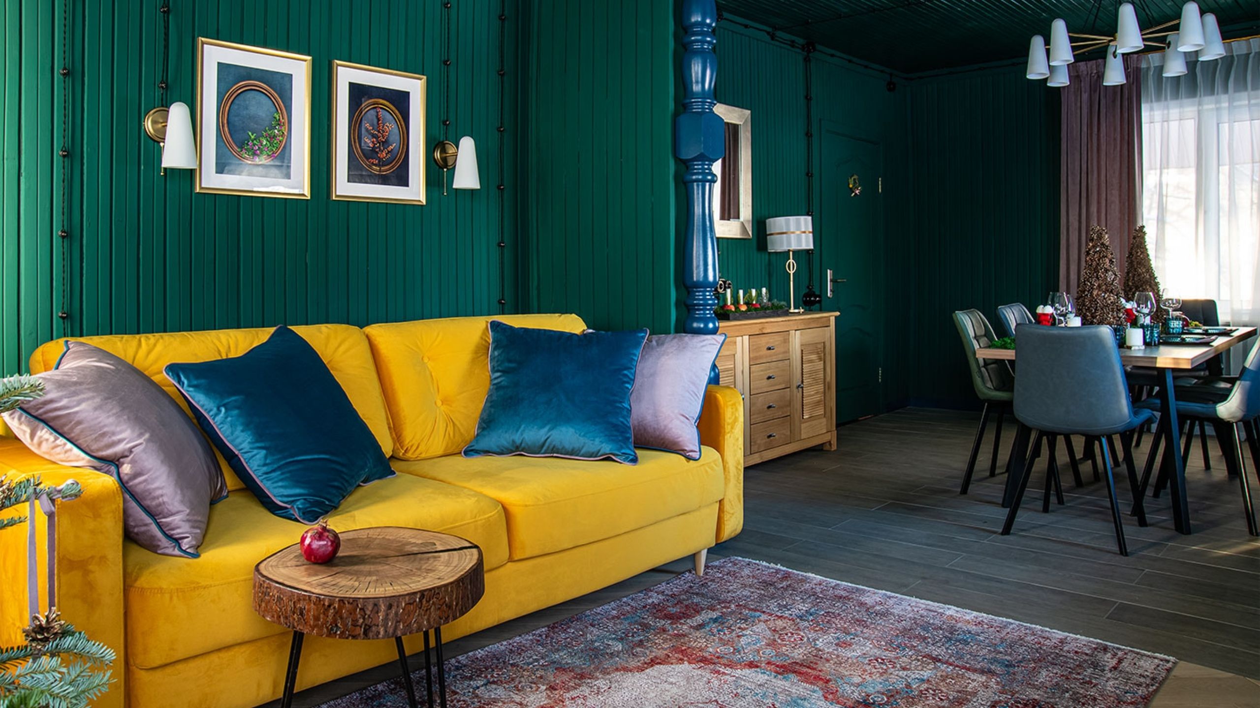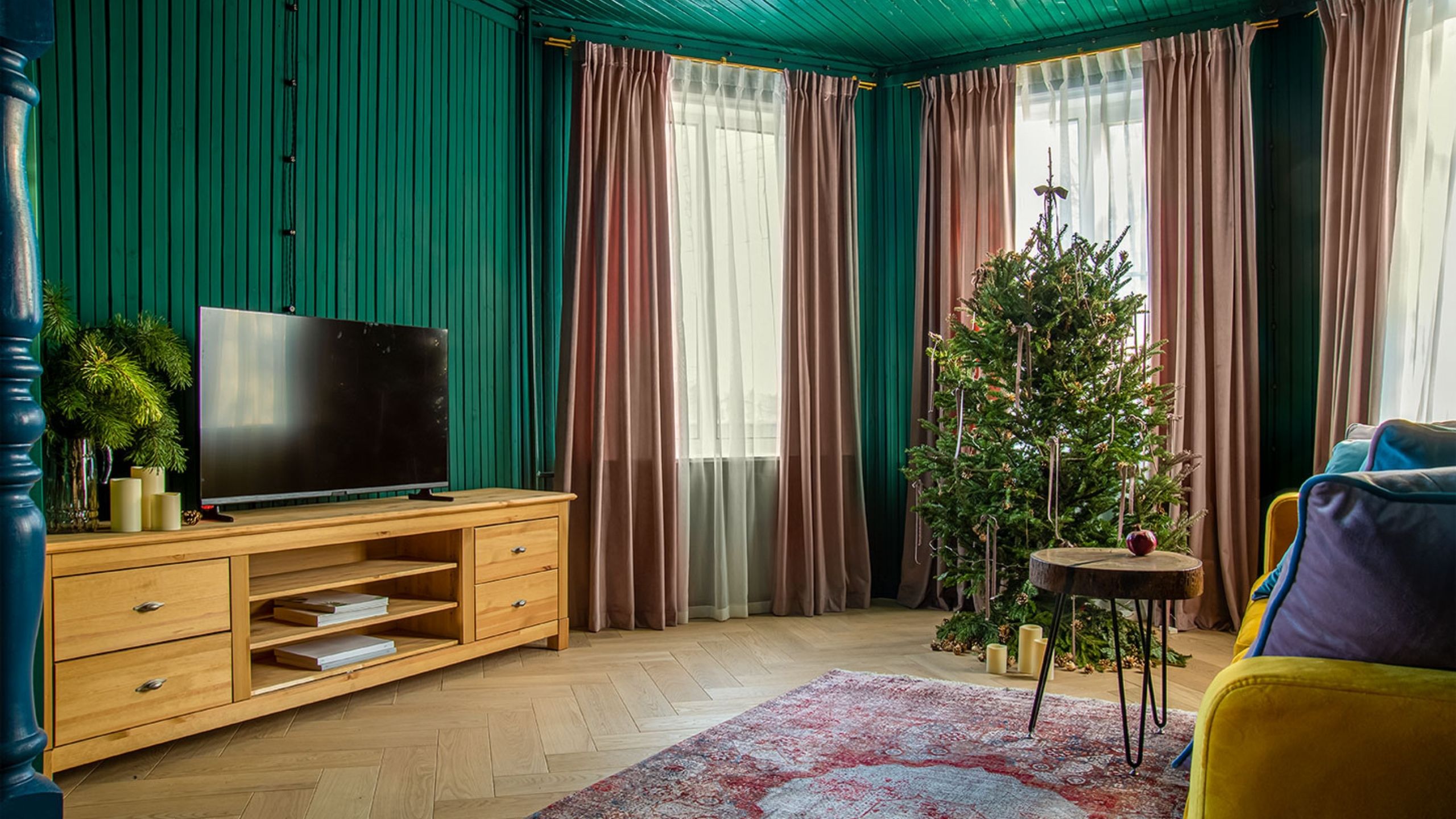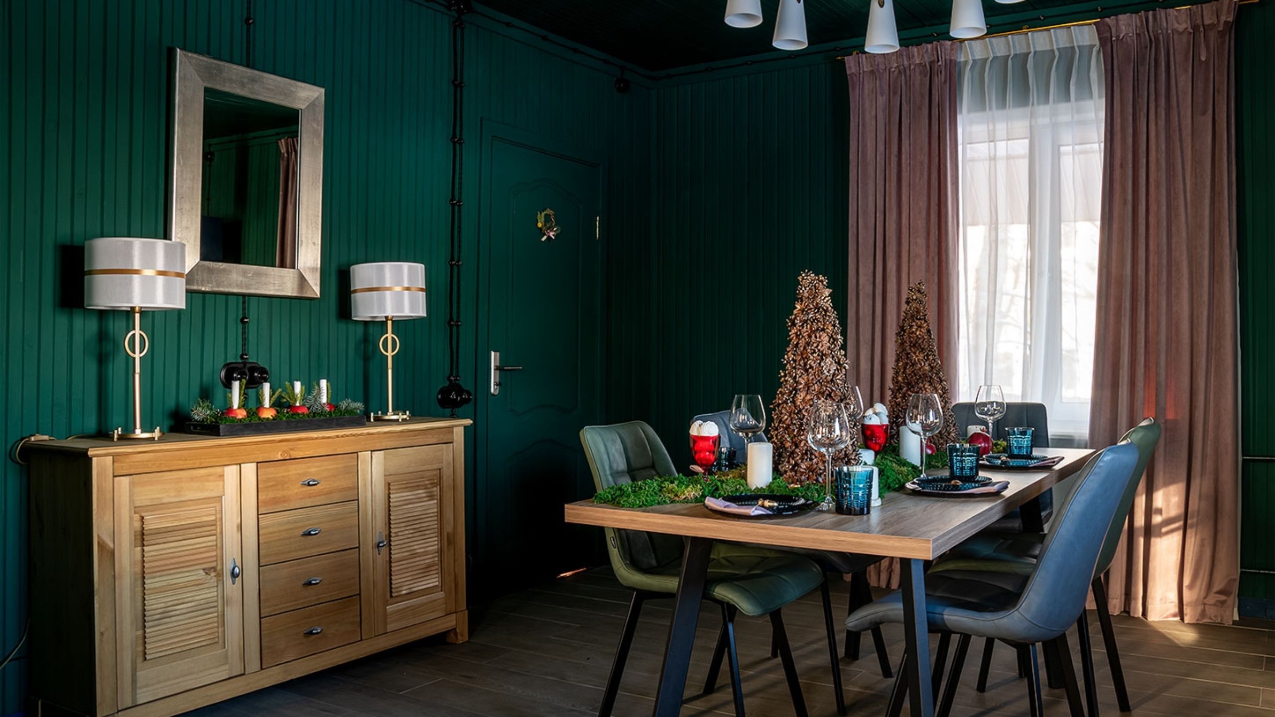 Дизайнер Дарья Пак переделала дачную гостиную для большой семьи на новогодний лад. Отделку стен и потолка оставила прежней, лишь перекрасив в насыщенный зеленый цвет. А в качестве напольного покрытия выбрала керамогранит под натуральное дерево из коллекции Classic Wood. Дизайнер зонировала пространство, выделила его часть под комфортную кухню с большим обеденным столом, чтобы места хватило всем. От традиционных и так любимых многими пастельных тонов отказалась: стены зелёные, диван ярко-жёлтый - смелое решение для дачного интерьера. Обеденный стол и новогоднюю ёлку украсила авторским праздничным декором. Получилось уютно, ярко и стильно.