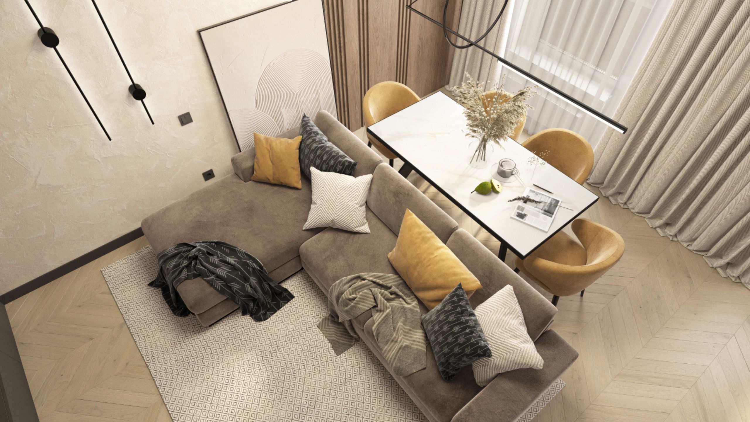 Особое внимание уделяется освещению. Оно несет в себе не только функциональное значение, но и за счет своей формы, расположения, игры света и тени способно менять пространство, добавлять глубину, динамику, формировать равновесие объемов, разделять на зоны и объединять в целое, подчеркивать богатые текстуры материалов, создавать настроение, концентрировать на себе взгляд как на предмете декора.
