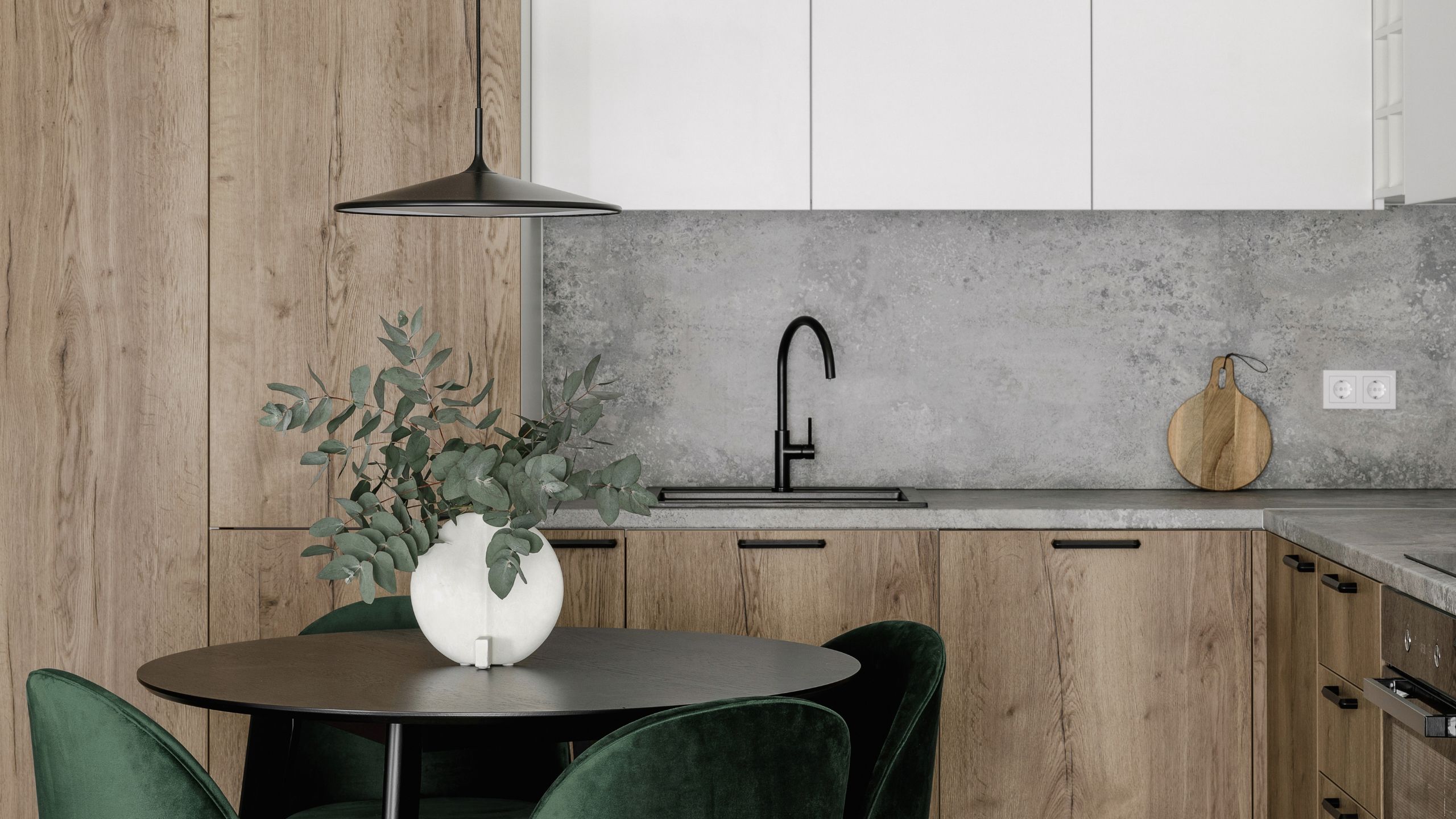 Серый + зеленый. Природное сочетание, особенно выигрышно смотрится с растениями или зелеными акцентами в текстиле.