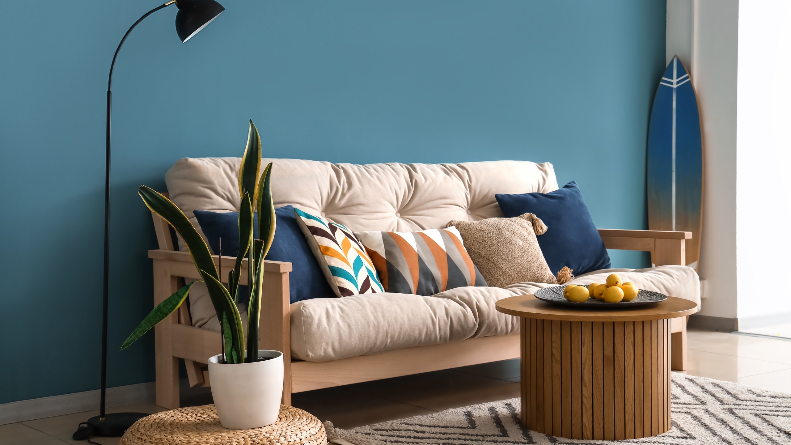 Покрасьте стены в насыщенный синий цвет и поставьте к ним белоснежный диван. Яркости добавят желтые подушки, шторы и постер на стене. Для уюта разбавьте композицию деревянным журнальным столиком и пушистым ковром.