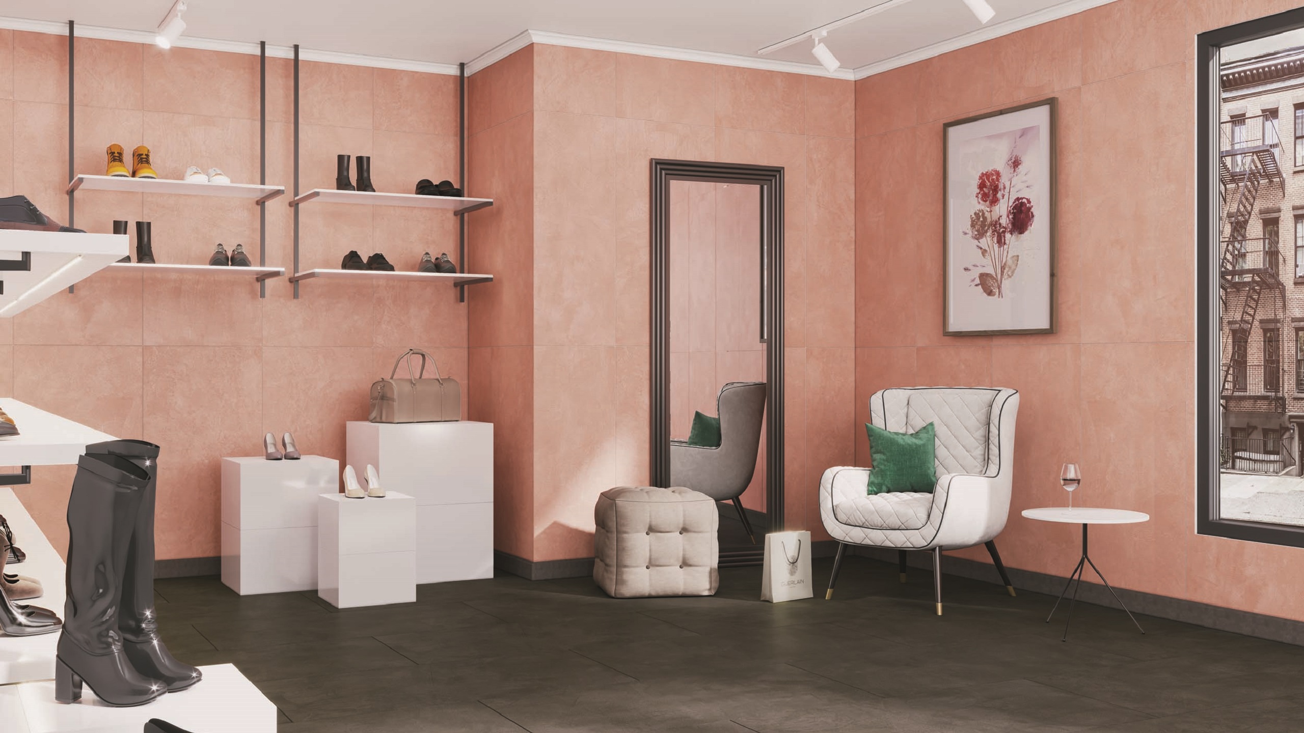 В этом стиле сочетается розовый с серым бетоном, черными линиями и графичными элементами. Керамогранит Patina поможет подчеркнуть природную фактуру и создать контраст.