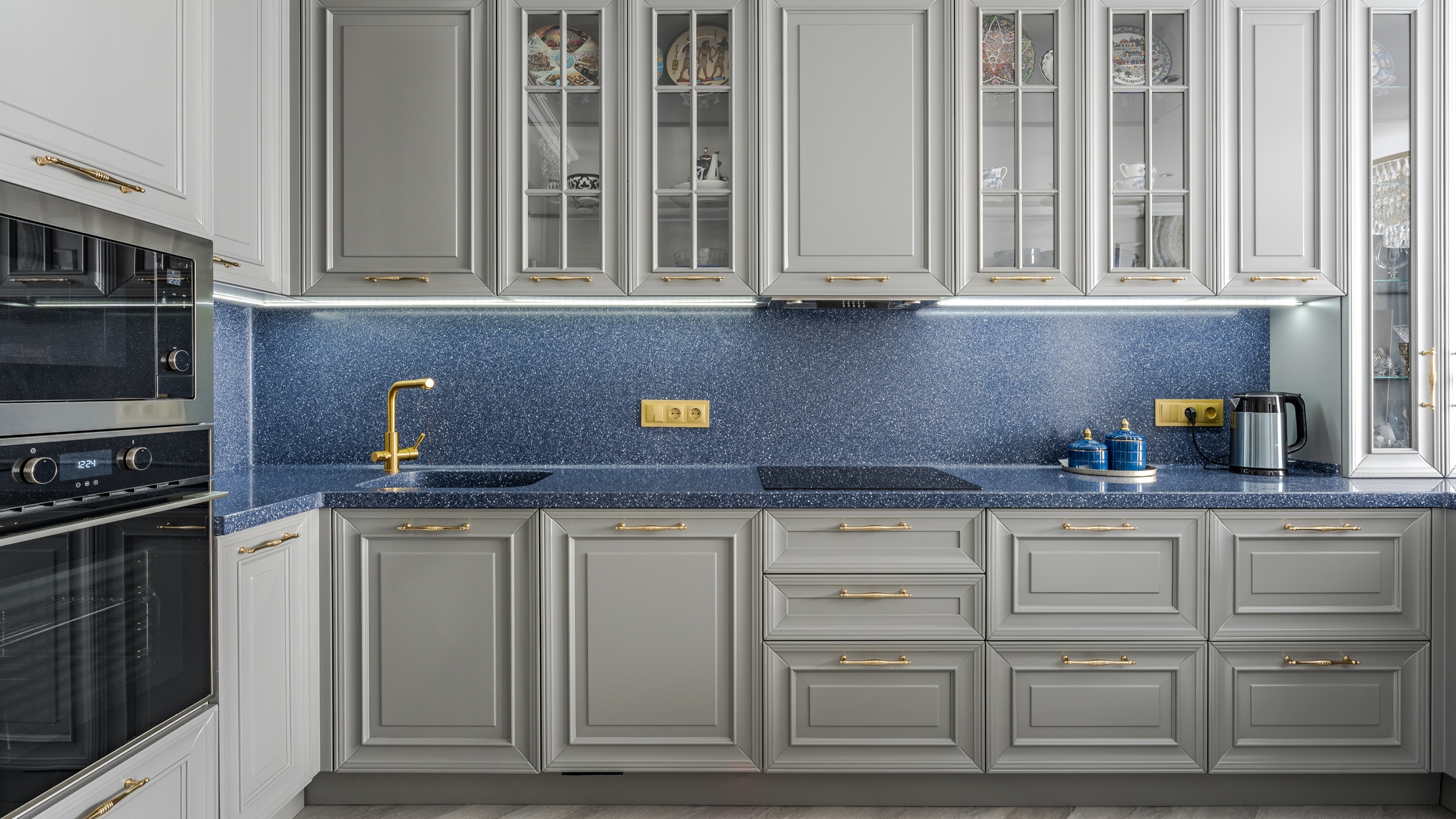 Уместными будут как современные кухонные гарнитуры с минималистичным дизайном, так и более «нарядные»: с декоративной резьбой и необычными «ножками». Фасады же выбирают матовые — с рельефом, узорной фрезеровкой или рейками по краям. Столешница может быть и из натурального, и из искусственного камня, массива дерева.