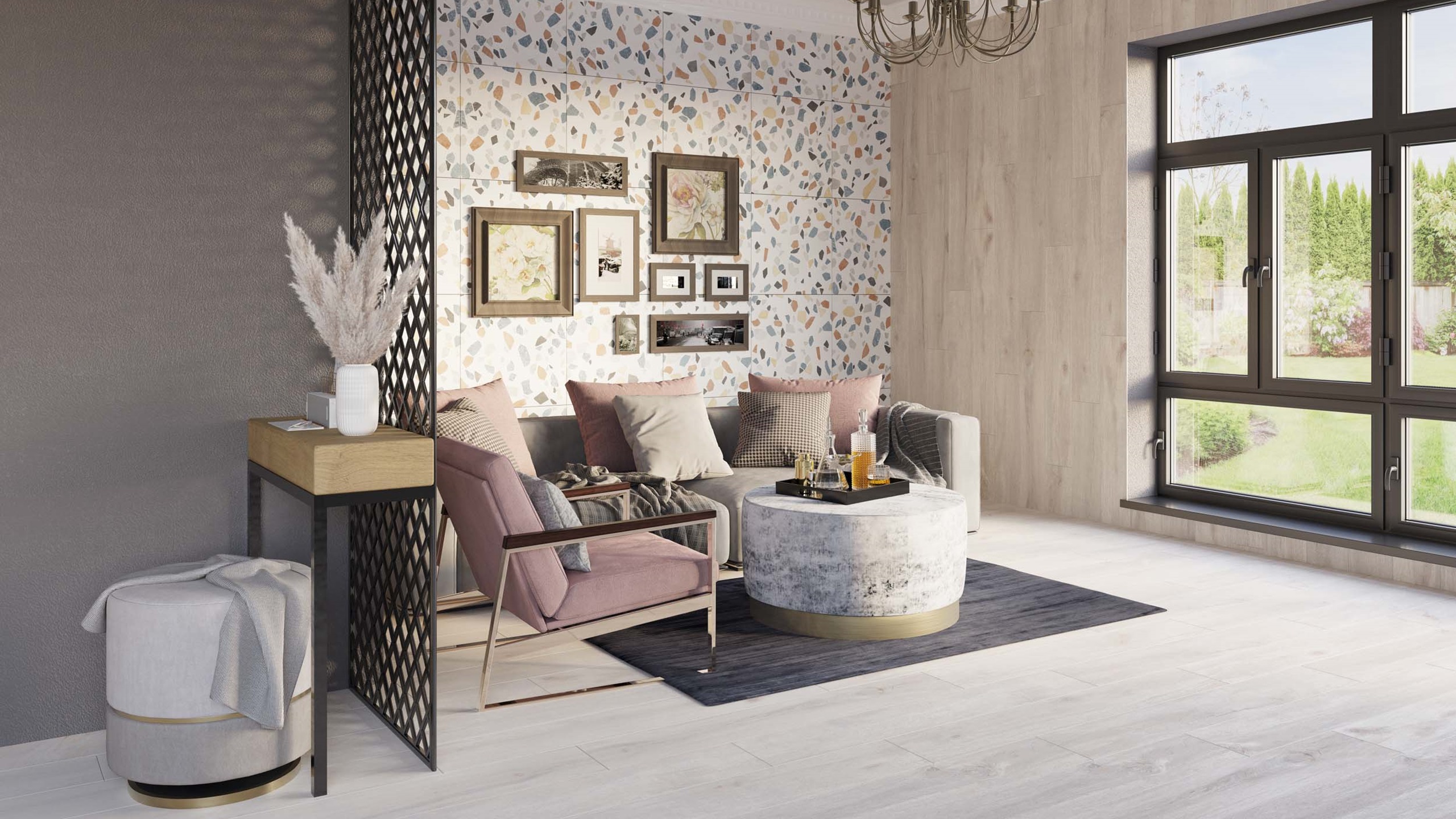 Неоклассический стиль светлой гостиной — что-то среднее между строгой классикой и современным минимализмом. Дорогой декор сводят к минимуму, а вместо изобилия натуральной древесины такой дизайн предполагает качественный ее заменитель. Например, для отделки пола в зале подойдет керамогранит из коллекций Alavesa, Artwood, Brigantina, который напоминает структуру дерева.