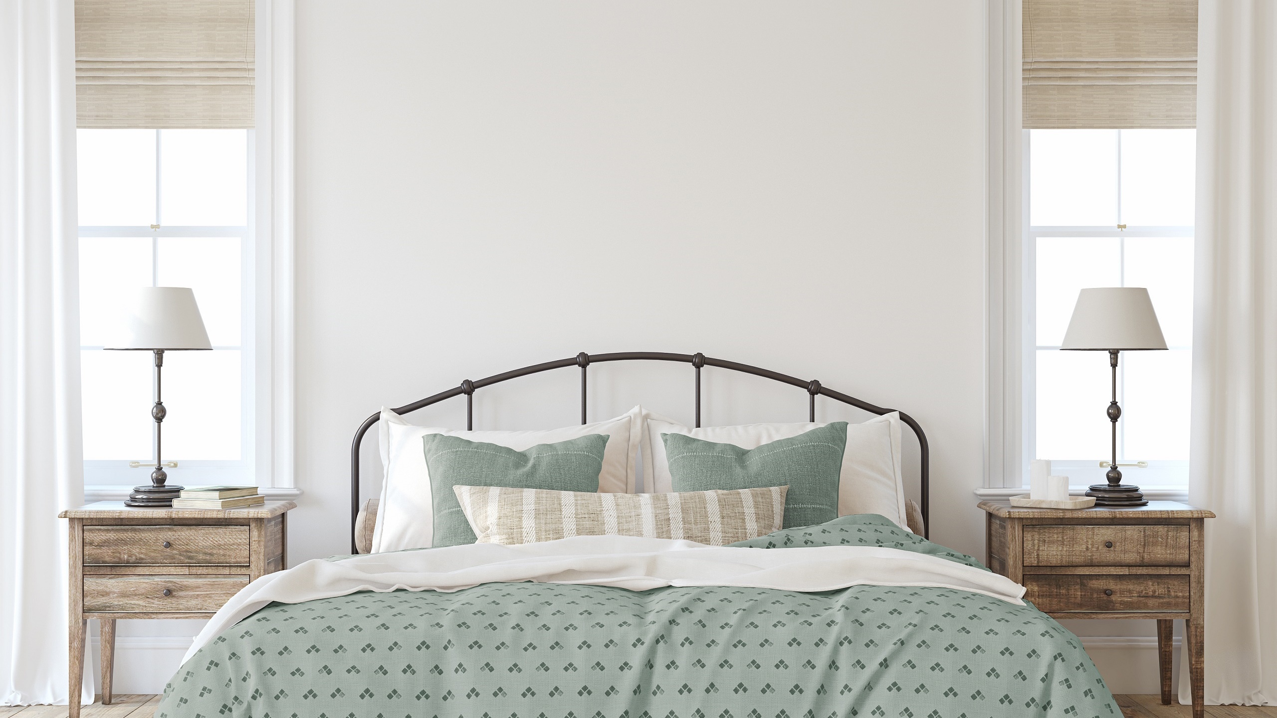 Центром композиции делают кровать. Но только в этом дизайне она легковесная и изящная. Нередко ее украшают балдахином. Постельное белье для спальни в кантри подбирают в оттенках бежевого, голубого и лавандового, возможные принты — узоры с птицами, цветами и лепестками растений. Хорошо смотрится кровать, застеленная белоснежными простынями, и подушки с рюшем им в тон. Дополняют такую композицию плотным одеялом с узором из полевых цветов и виноградной лозы или однотонным пледом пыльно-голубого цвета.