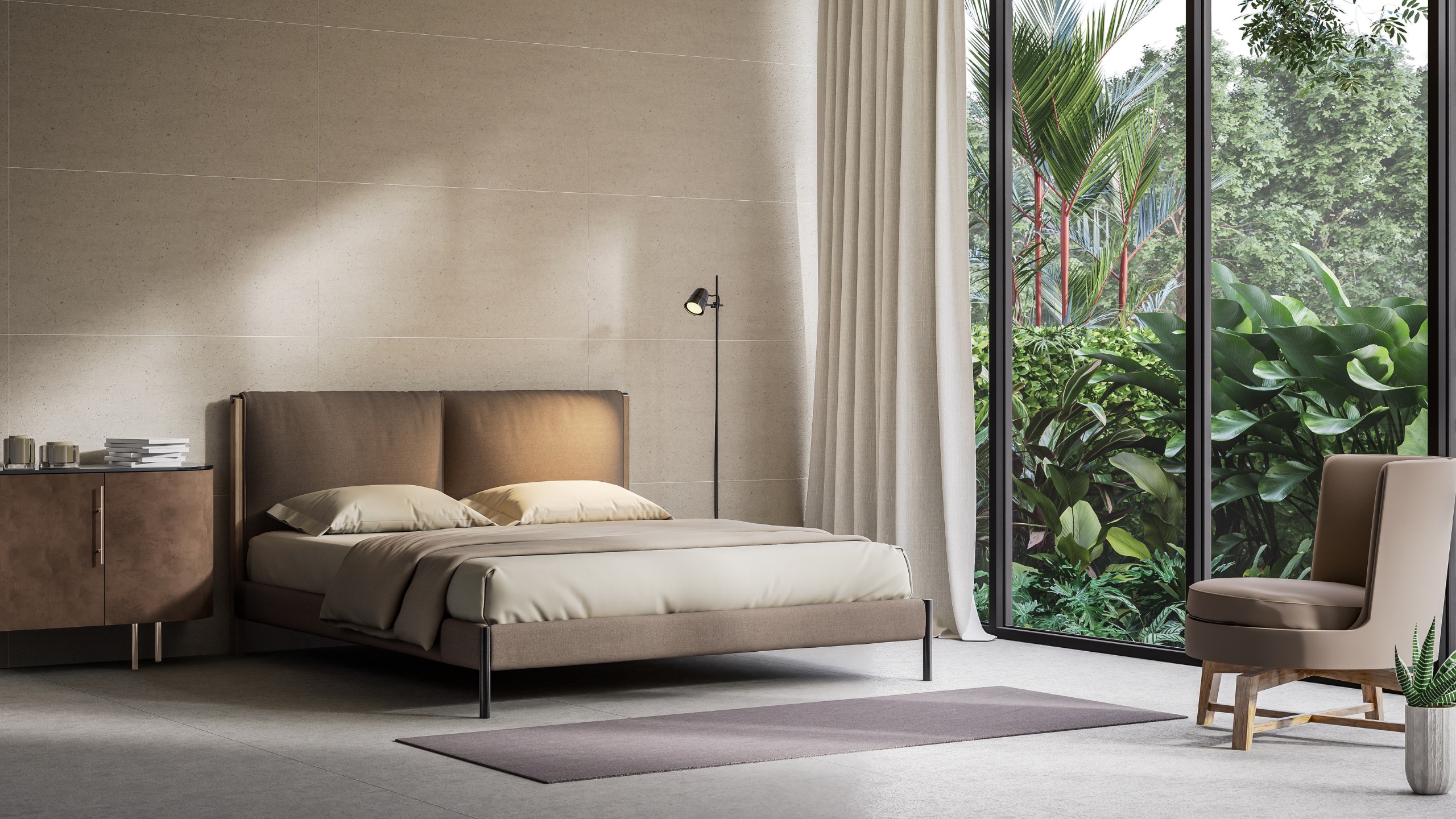 Для спальни подойдут нейтральные оттенки: белый, бежевый, серый. Они присутствуют в отделке стен, потолка или напольного покрытия. Для пола подойдет керамогранит из коллекций Artwood, Brigantina или Classic Wood, которые напоминают дерево.