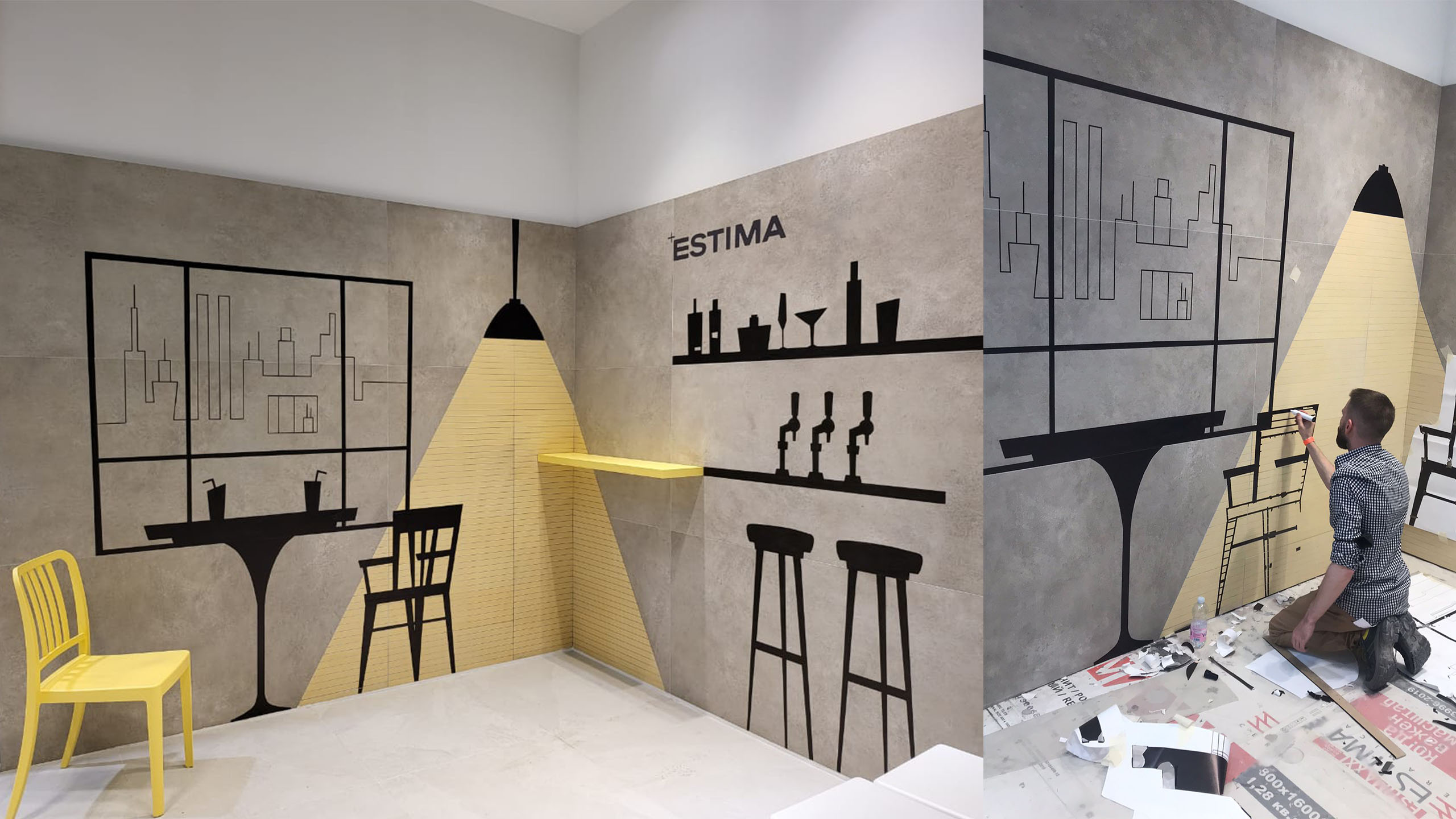 На стенде вы сможете увидеть гостеприимную фотозону, дизайн которой выполнен в формате барной стойки, ведь бар - это место неформальных встреч коллег, друзей и товарищей. Для фотозоны была использована новинка линейки Ametis by Estima - коллекция Spectrum, а также коллекции Traffic и классика лофт-дизайна. В оформлении фотозоны задействована ручная работа - рисунки наносились специальным маркером самим креативным дизайнером компании Estima.