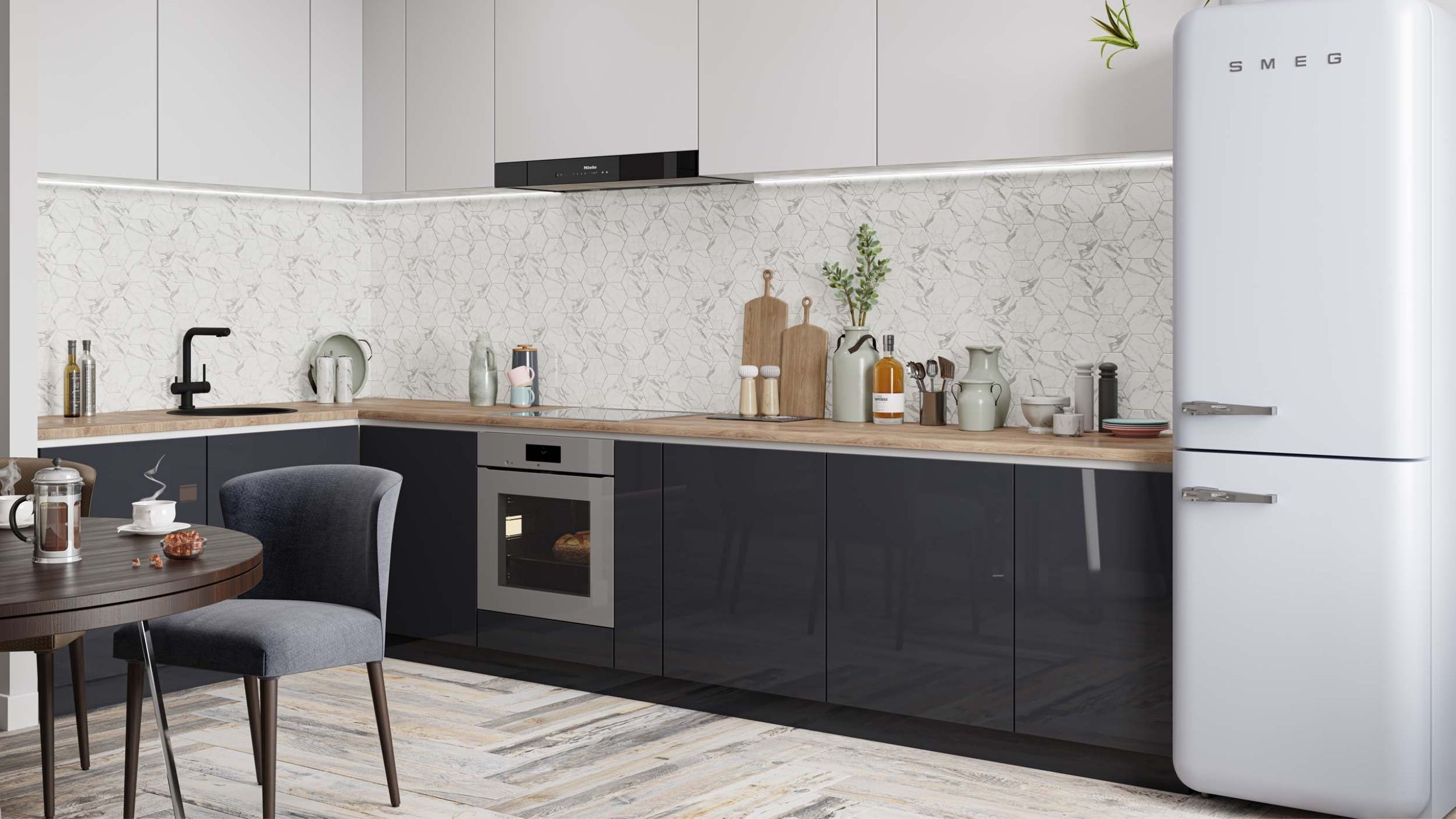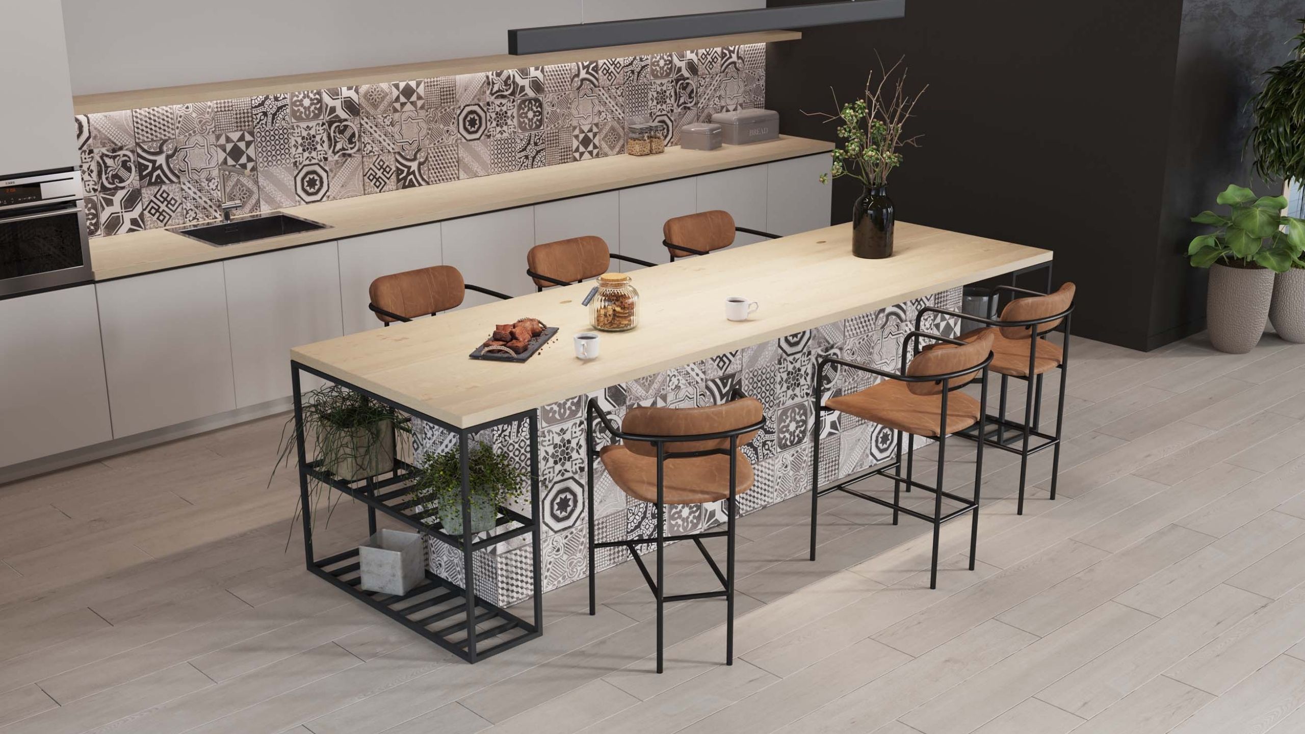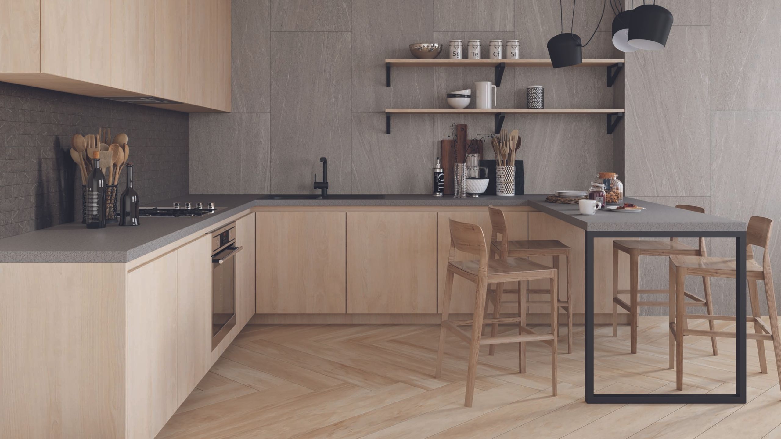 Керамическая плитка и керамогранит — это основа, с которой придется работать. Выберите подходящую текстуру по мотивам вашего интерьера. Например, для лофта — цемент, бетон и металл, в скандинавском стиле — древесина и камень. Для столешницы используют плитку, которая гармонирует или органично контрастирует с остальной отделкой. А среди керамогранита от компании Estima можно выбрать также дизайнерские коллекции для самых смелых решений. Например: Spectrum, Comfort, Cosmos, Chambord.