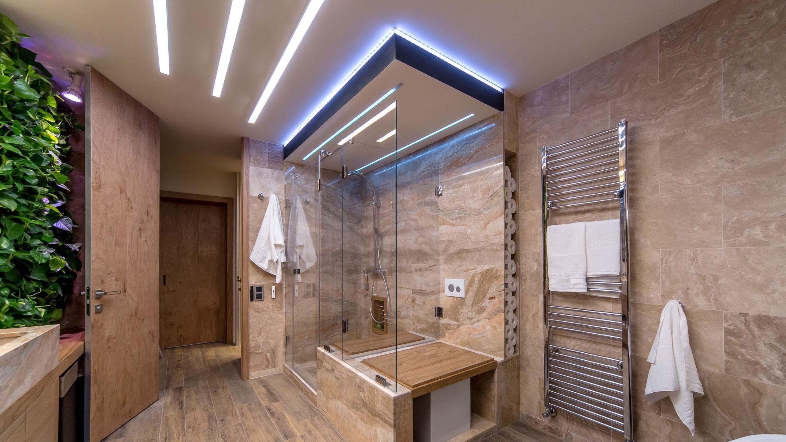 В просторных ванных, вдалеке от воды (душа, раковины) можно клеить тематические моющиеся обои. На стены в ванную крепят ПВХ-панели или облицовывают деревянными панелями. Недорогим, но эффектным материалом для отделки помещений считается водостойкая фактурная штукатурка.