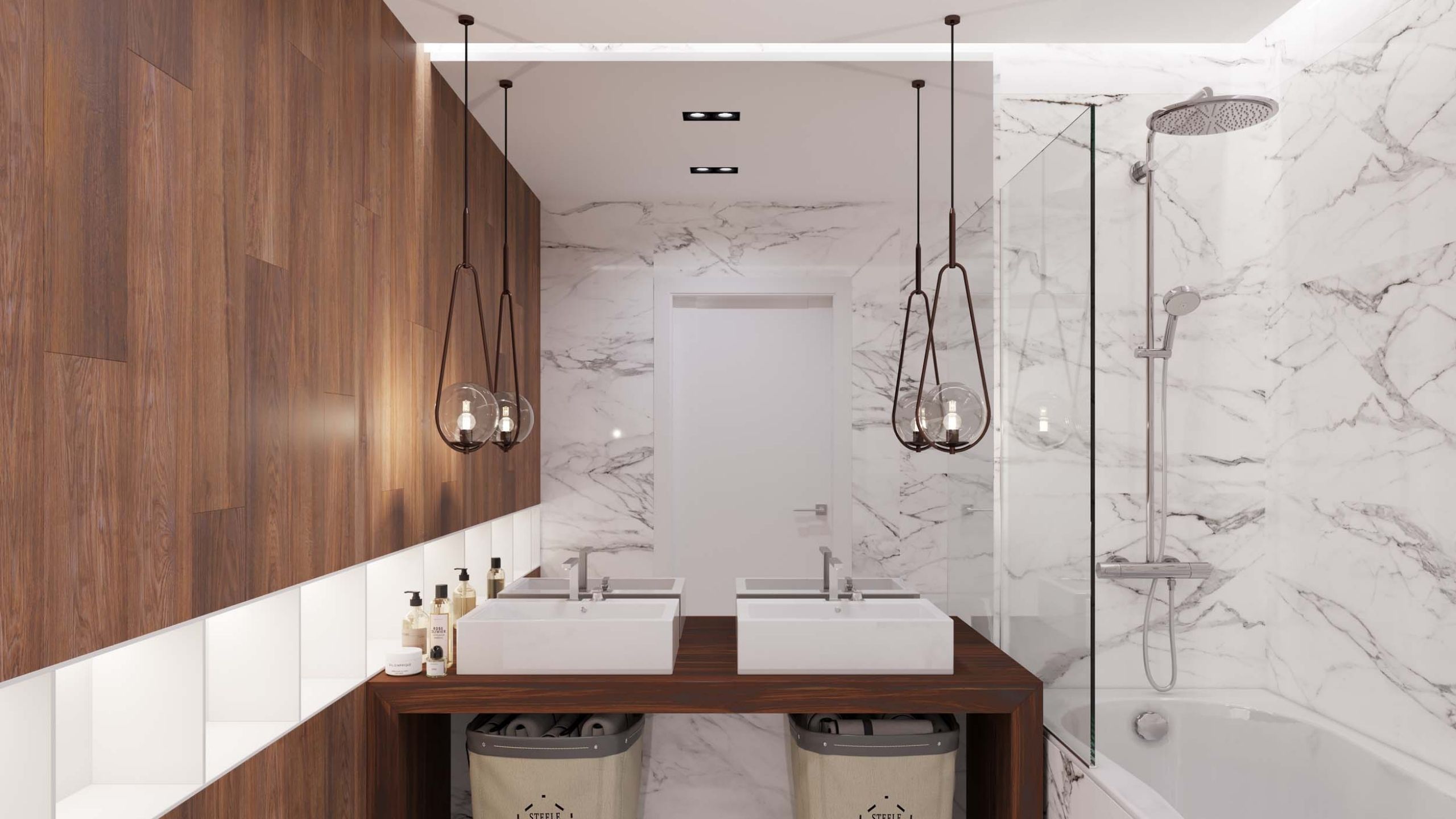Специалисты рекомендуют цветовую температуру для ванной 5500 К с индексом цветопередачи 90. Для небольших помещений не стоит выбирать холодный дневной свет более 6500 К. В качестве осветительных приборов подойдут: