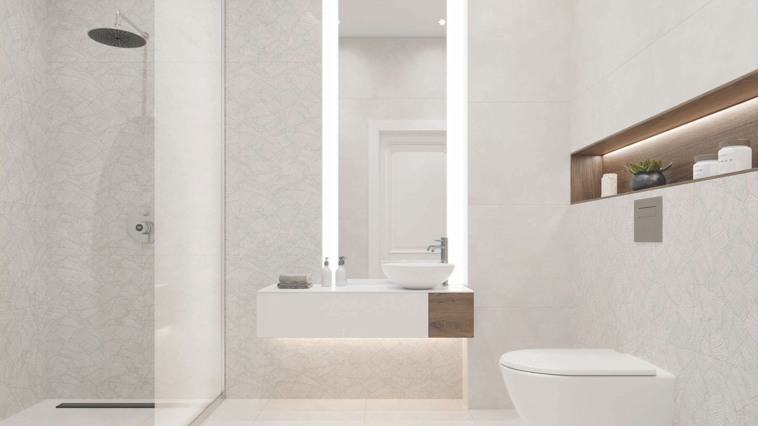 При выборе материала для отделки ванных комнат следует помнить об особенности помещения — повышенной влажности. По этой причине оптимальной станет укладка керамогранита. Широкий ассортимент по орнаменту и цветам от компании Estima позволит следовать основополагающей тематике ванных в скандинавском стиле. Долговечность и высокие эксплуатационные качества, превышающие свойства натуральных материалов позволят забыть о необходимости повторного ремонта на долгие годы.