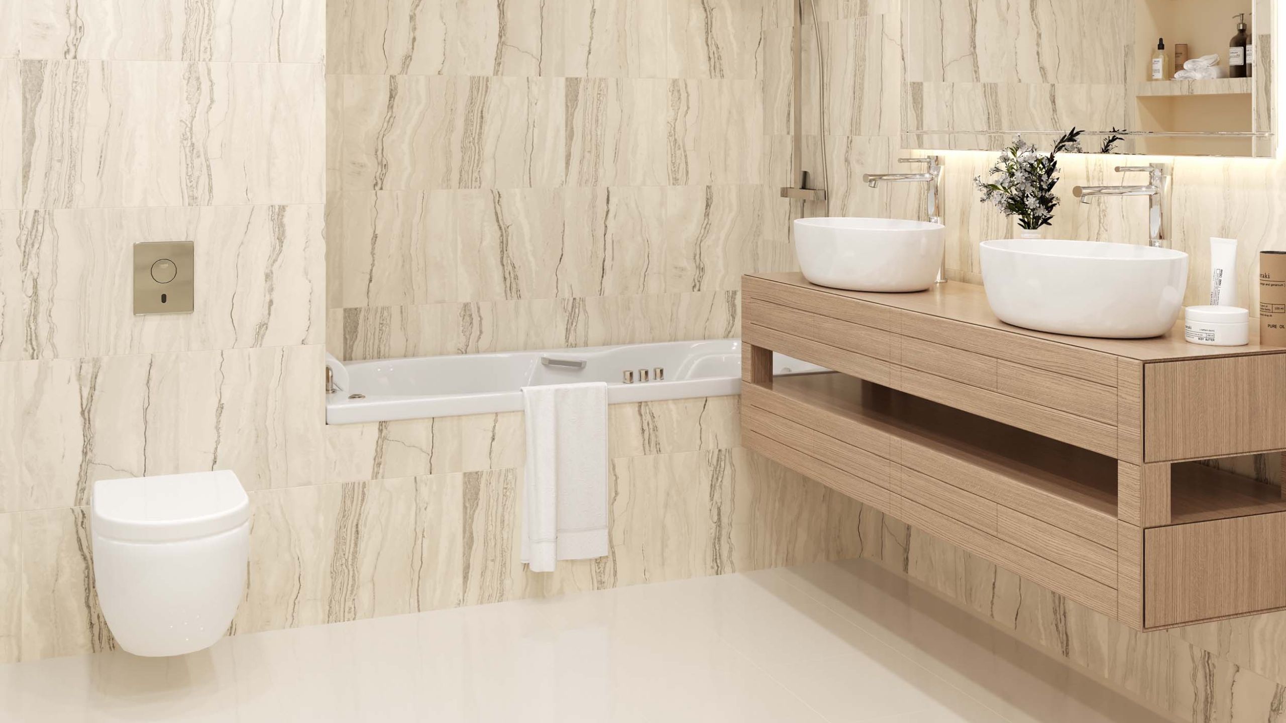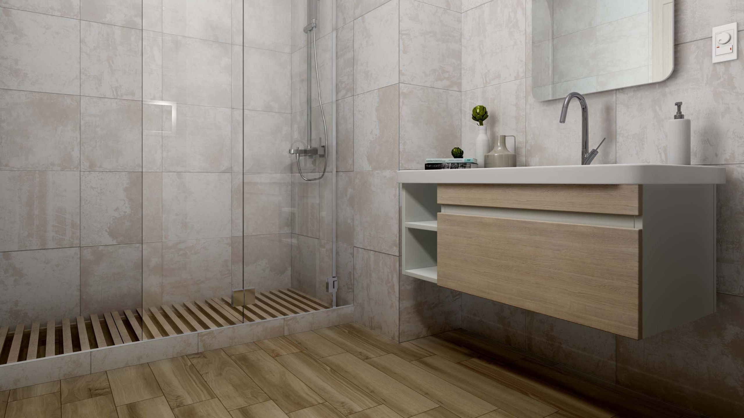 - Теплоту придадут материалы под дерево от светлых до темных тонов. Оживить интерьер ванной и придать ему больше уюта можно с помощью керамогранита с рисунком древесины.