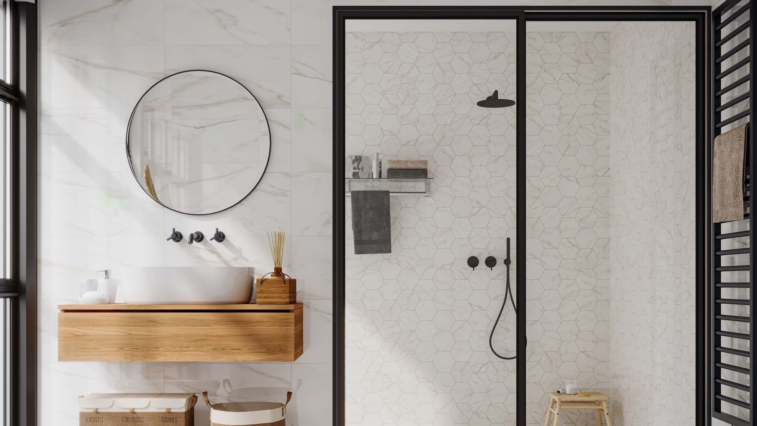 - подходящий принт в ванную комнату — цветочный, небольшие геометрические узоры, клетки, полоски;