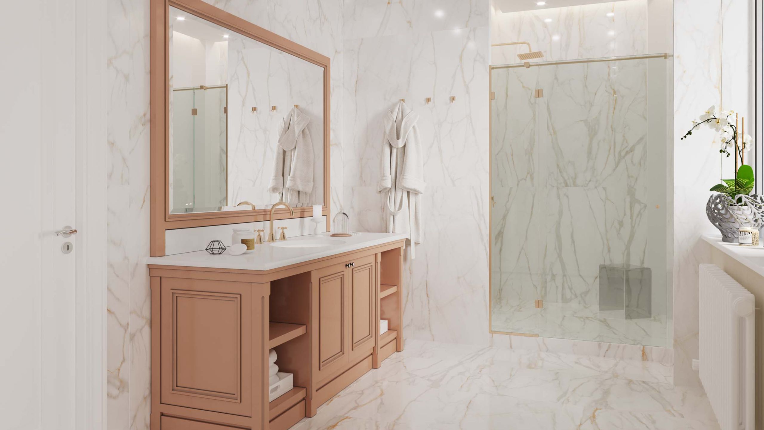 Замените натуральное дерево в ванной на керамогранит, который повторяет фактуру дерева. Современные технологии позволяют производить плитки, которые даже при прикосновении создают эффект деревянной поверхности. И их сложно отличить от натурального материала по фото. Но за такими поверхностями в ванной в стиле неоклассика легко ухаживать и можно не бояться что-то разлить, уронить, а мокрая поверхность не скользит, не гниет, не разрушается.