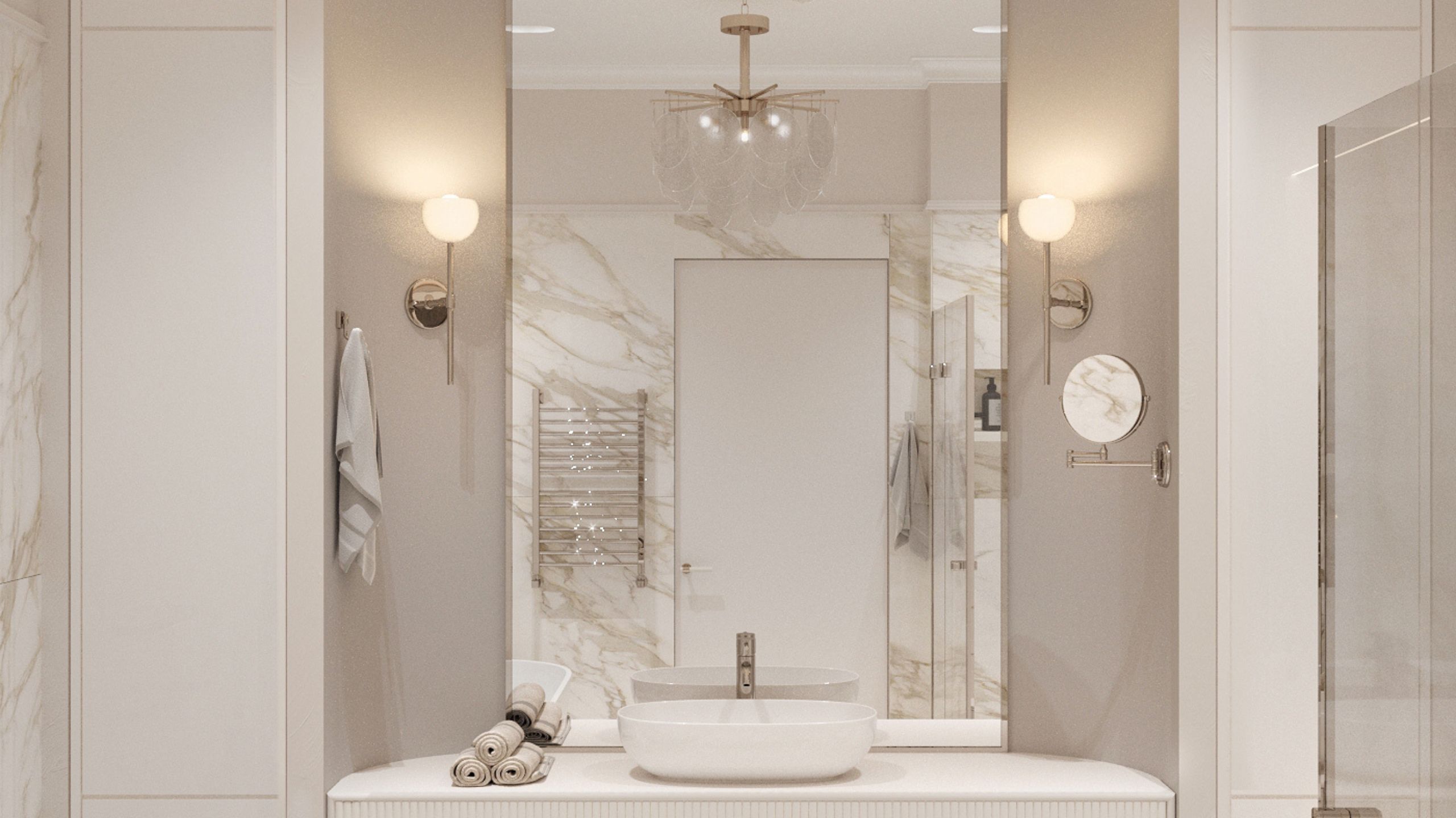 Если не нравится лепнина, то добавить классических элементов в декор ванной помогут молдинги. Такие накладные планки придают ванной в стиле неоклассика выразительность, добавляют роскоши и аккуратности. С помощью молдингов можно спрятать шкаф, акцентировать внимание на зеркалах, визуально увеличить пространство.