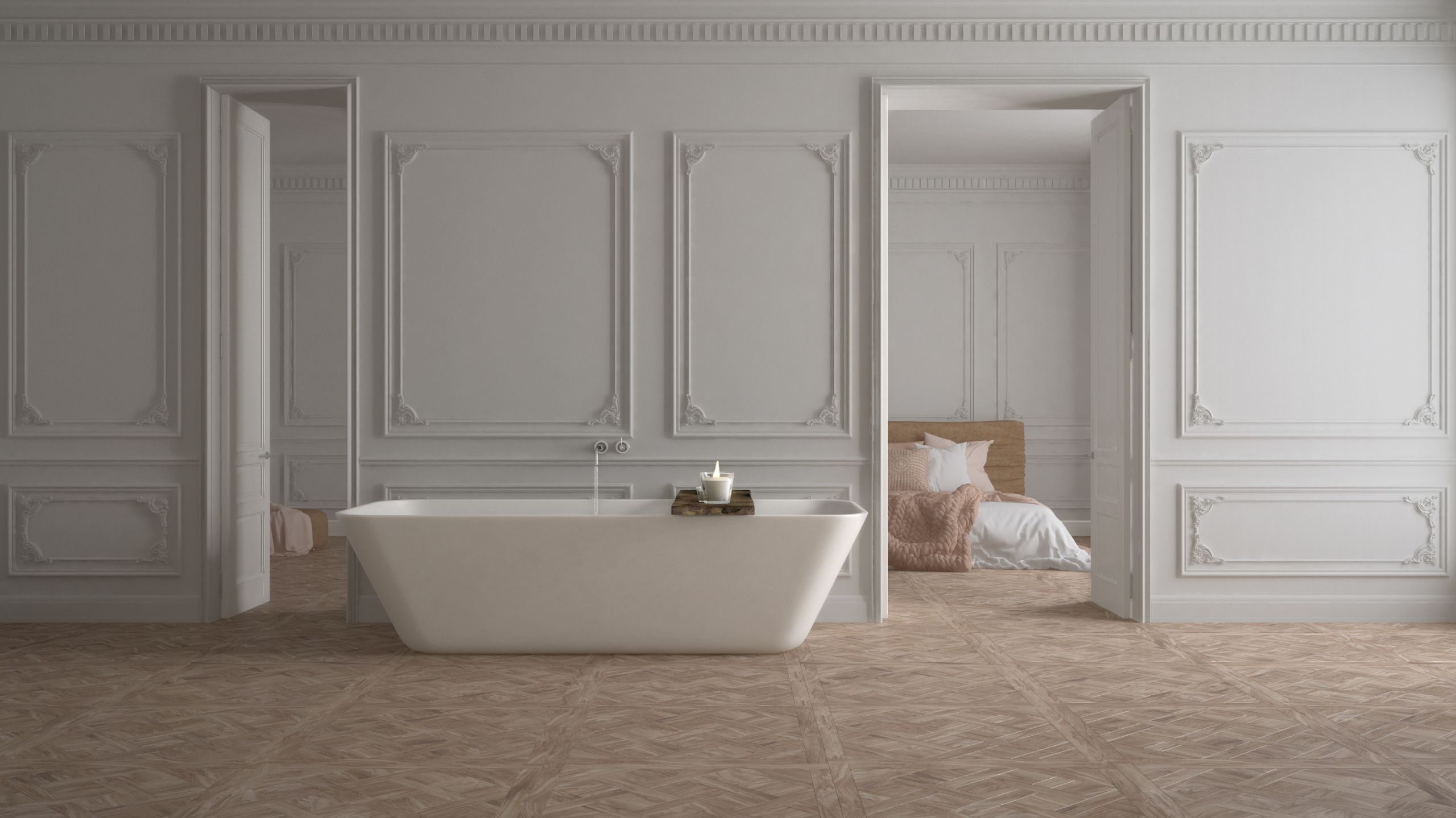 Неоклассицизм предполагает использование натуральных материалов — паркет в качестве напольного покрытия, деревянная мебель с резьбой для придания помещению антуража. Но в ванной комнате повышенное содержание влаги. Поэтому требуется применение специальных технологий обработки, постоянный уход. Затратно? Требует много сил и времени?