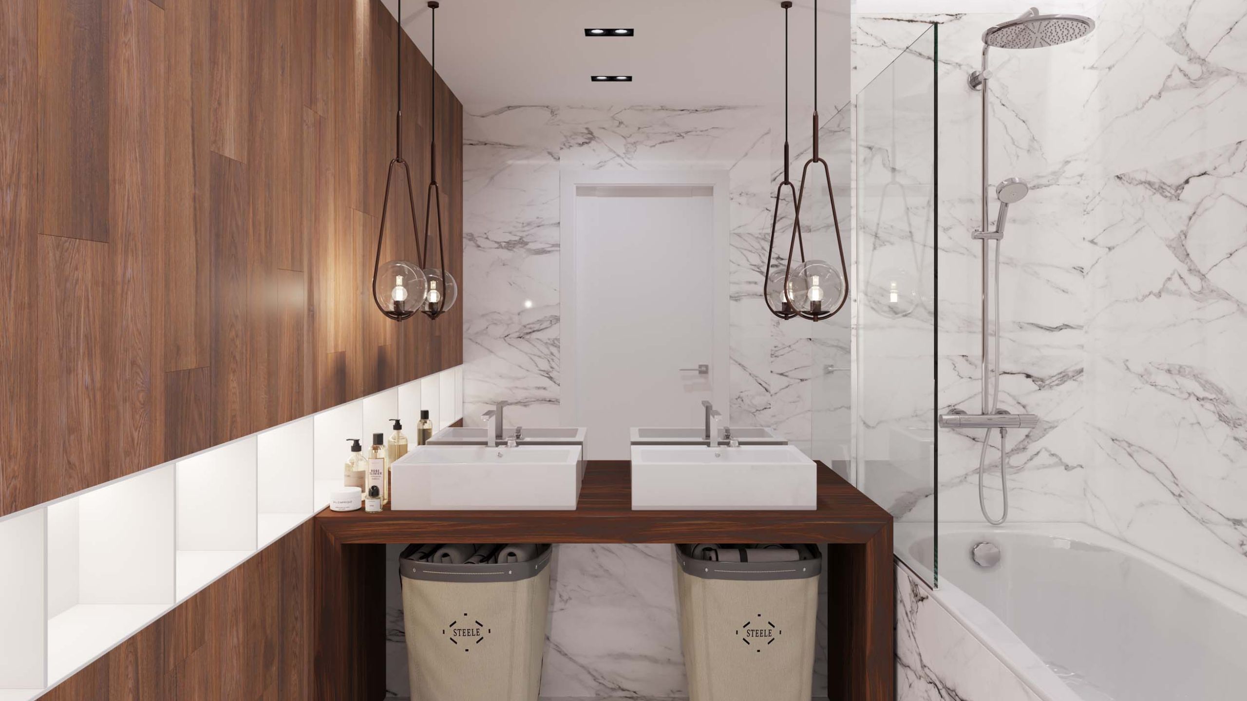 Такой стиль подходит для ванной любого объема и планировки. С ним легко работать, так как он одновременно соединяет в себе черты других стилей — модерн, классика, и в то же время не требует больших финансовых вложений.