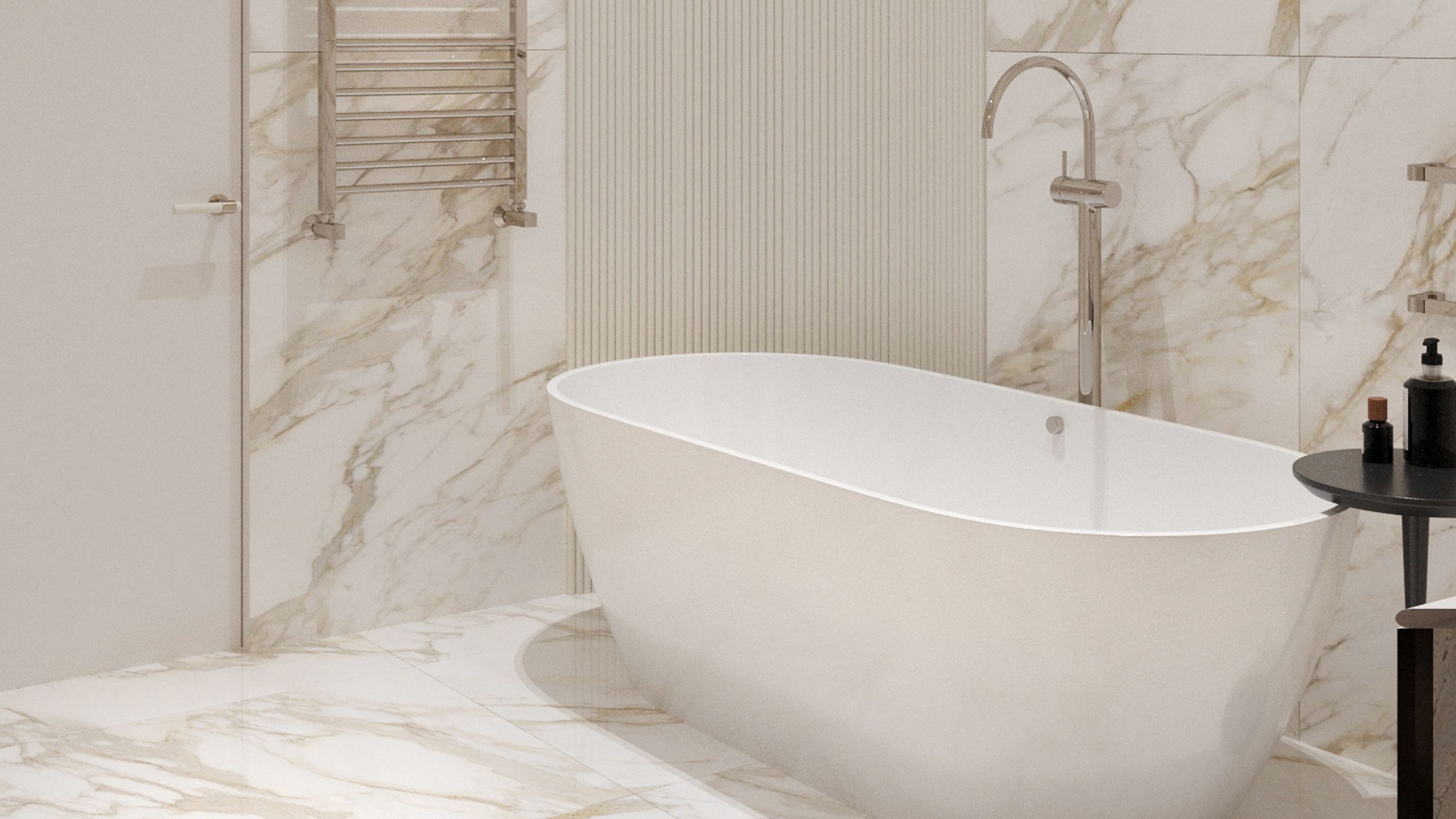 Продукция торговой марки Estima представлена линейками и коллекциями для отделки ванной комнаты в стиле неоклассика. Подчеркнуть роскошь поможет керамогранит под мрамор премиальной линейки Ametis by Estima в коллекции Supreme. Посмотрите на фото. Это изысканная белоснежная плитка с платиновыми и золотистыми венами или светло-серый мрамор.