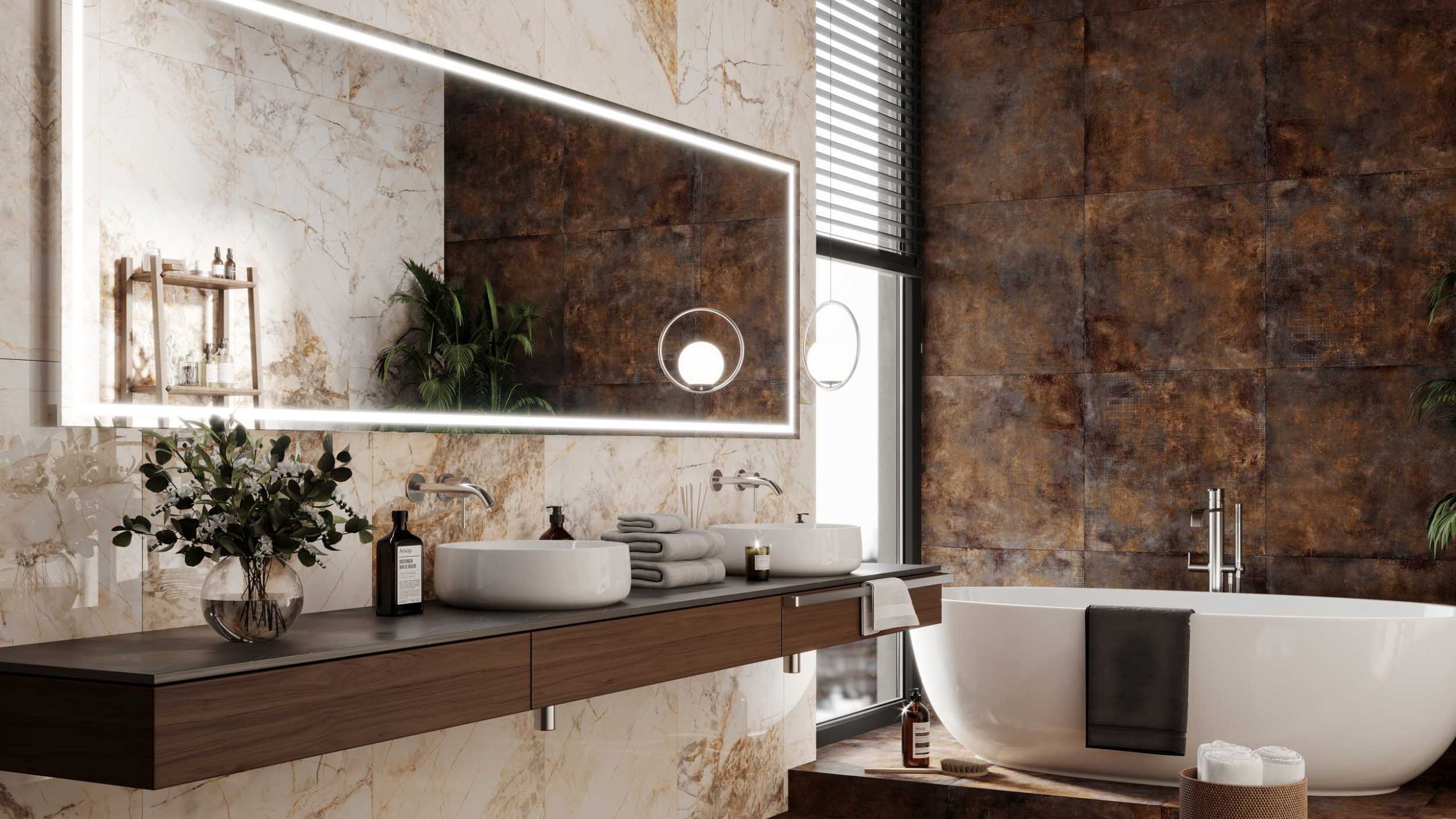 - Натуральные материалы. Так, для отделки пола и стен ванных применяют керамогранит, который по своей структуре и оттенку схож с натуральным деревом, камнем, мрамором. Можно добавить роскоши за счет использования плиток от торговой марки Estima. В линейке моделей представлен керамогранит для ванных, который разработали с учетом особенности помещения. Только взгляните на фото в каталоге на сайте. В них сочетается утонченная красота, благородство и высокое качество. При выборе обратите внимание на линейку Ametis by Estima, в которой совместили красоту природы и высокое качество материалов. А линейка Estima XXL открывает новые возможности за счет широкоформатного исполнения.