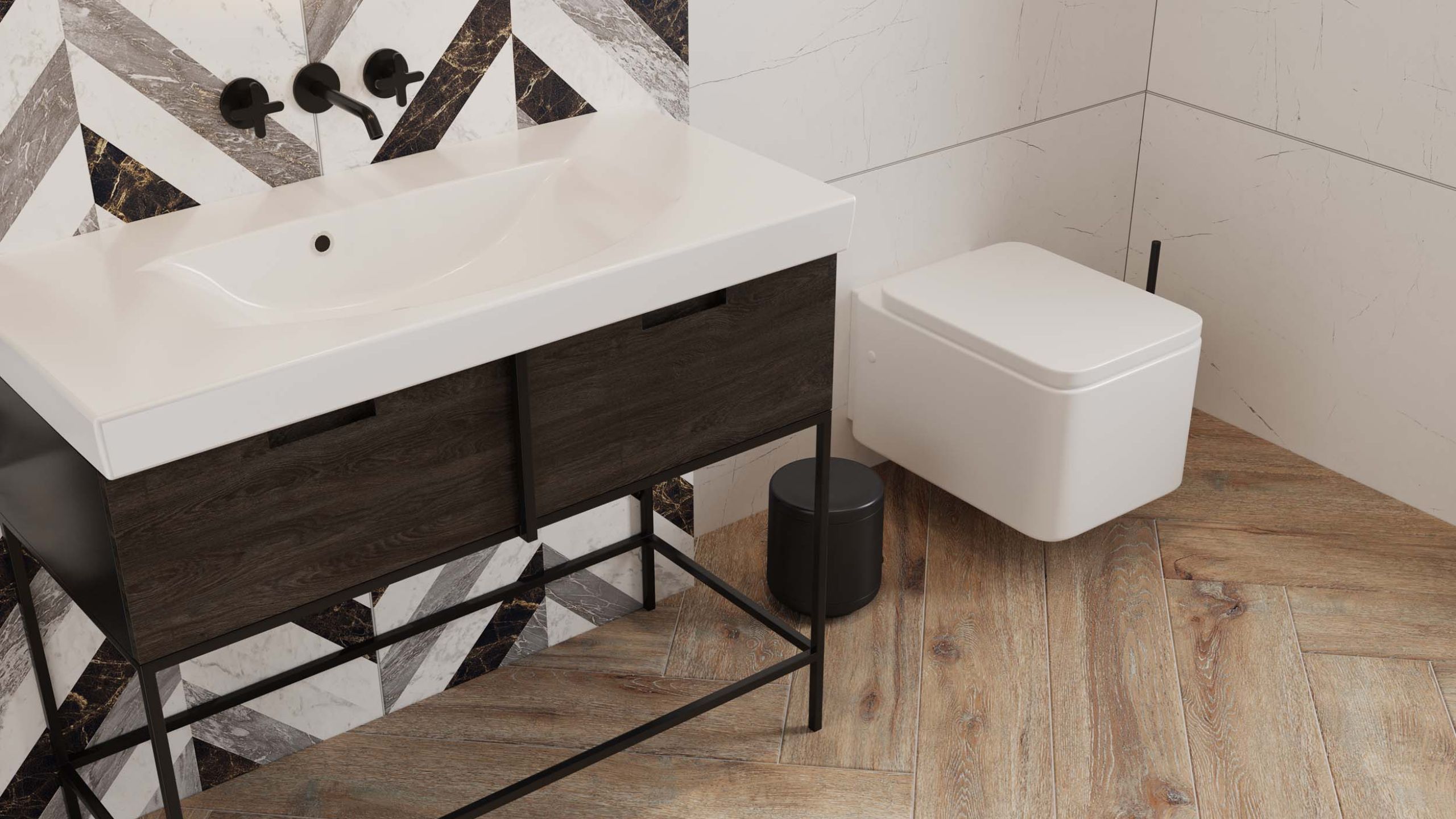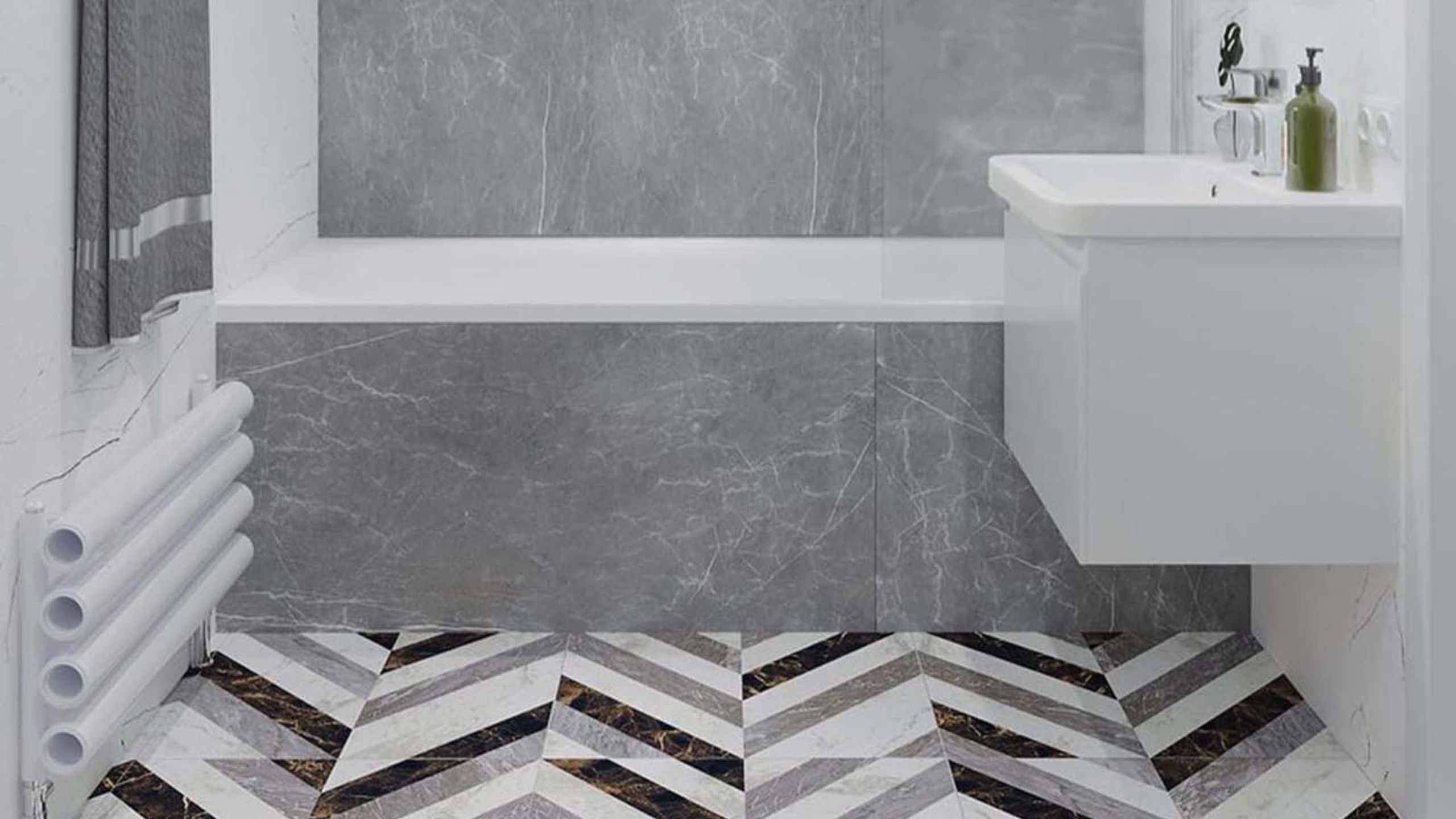На стенах принтованная керамика? Тогда напольное покрытие нейтрального оттенка. Если есть сложные геометрические узоры, многоцветная динамичная гамма — это должен быть яркий акцент в помещении, а не полная отделка всего пространства. Иначе взгляд просто будет рассеянный и перегружен.