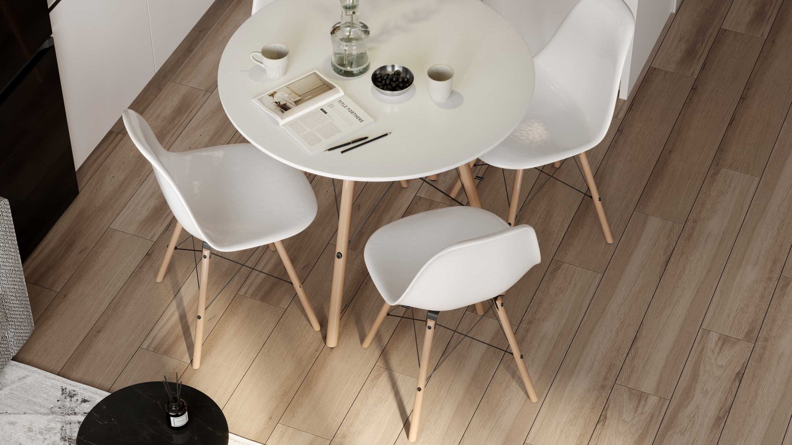 Пол в таком дизайне используют деревянный, что непрактично на кухне, поэтому идеально подойдет керамогранит под дерево — одно из самых прочных и износостойких покрытий. Отличные варианты представлены в коллекциях Brigantina, Spanish Wood, Sherwood, Artwood и Classic Wood.