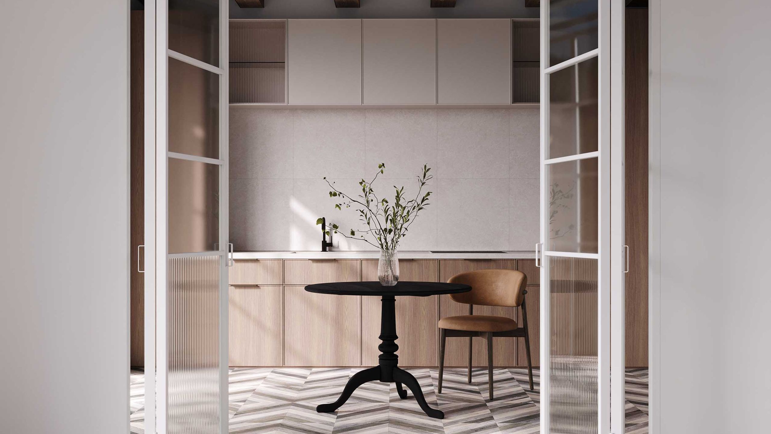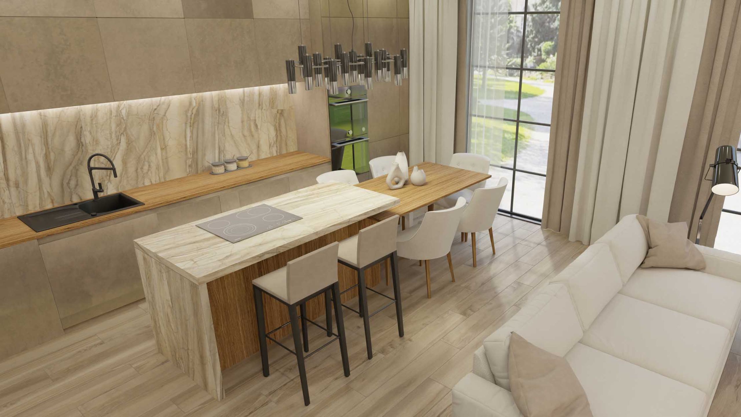 Интересным решением будет также сделать акцент на мраморном фартуке — керамогранит из коллекции Alba с нежным рисунком идеально для этого подойдет.