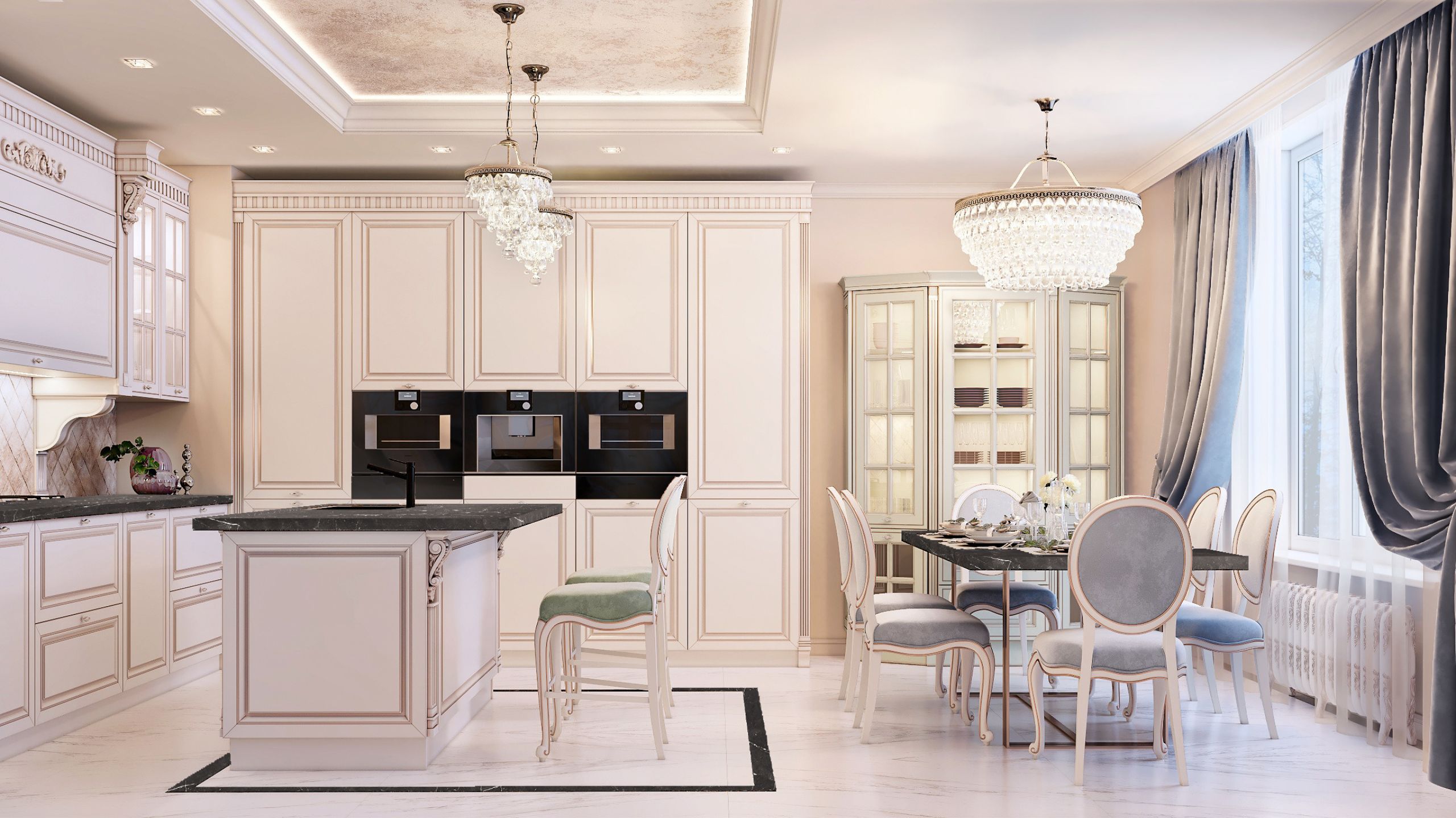В интерьере таких кухонь используют 2–3 спокойных монохромных цвета, поэтому классика никогда не надоедает и не раздражает глаза. Также добавляют благородные детали в виде позолоченных или посеребренных элементов — ручек, петлей, рейлингов, смесителей, рисунков на мебели.