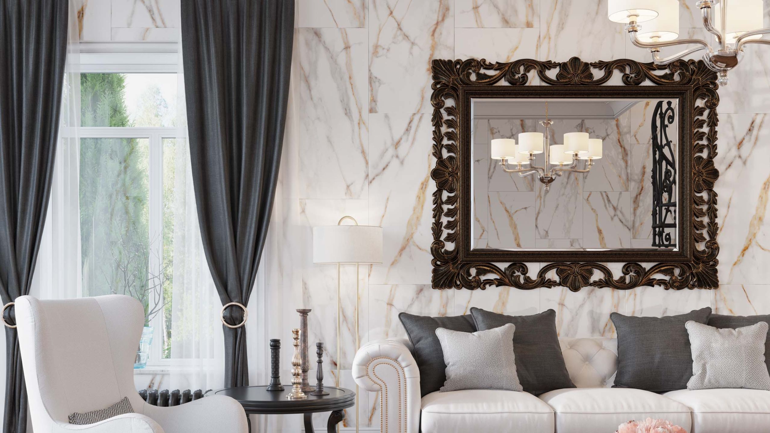 Через большие окна заходит достаточно естественного света. А для искусственного освещения подойдут настенные и настольные светильники, торшеры, большие люстры, канделябры.