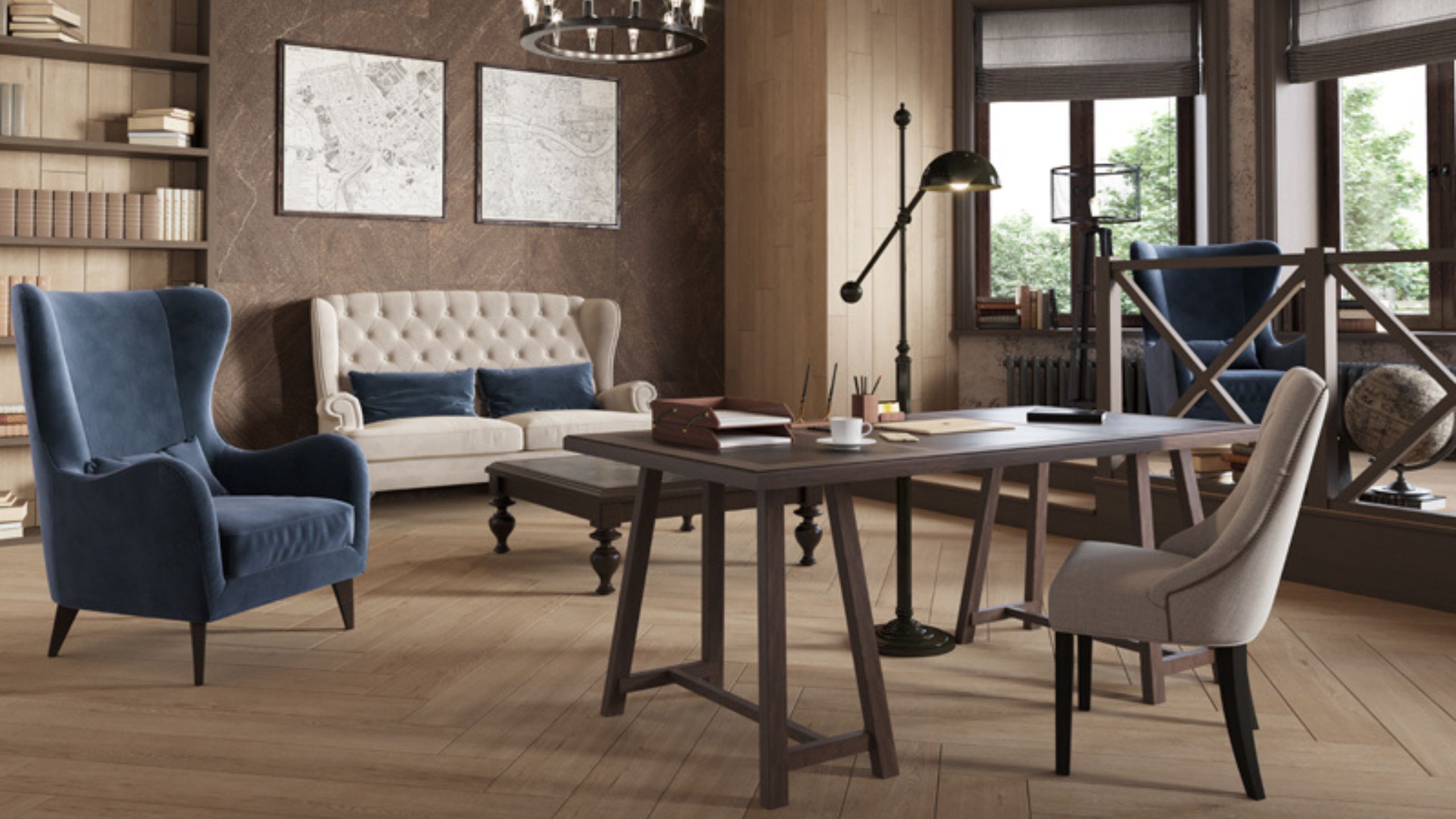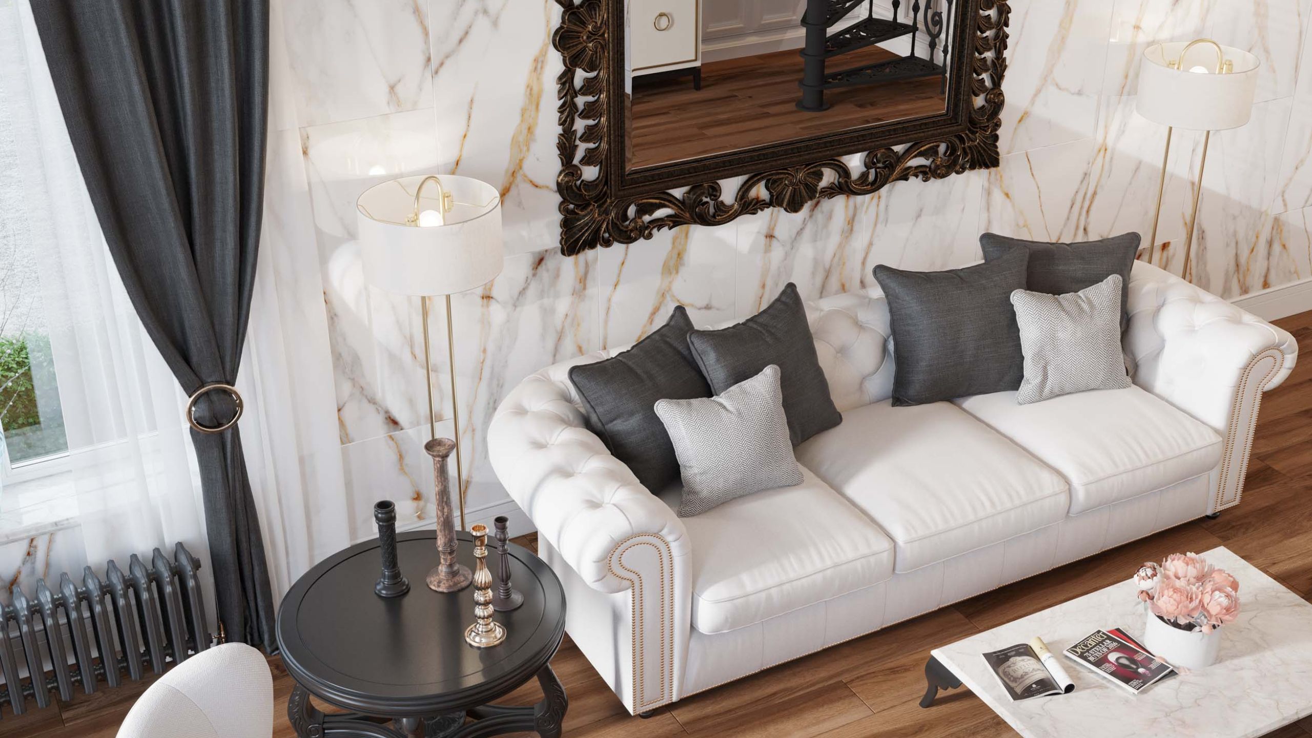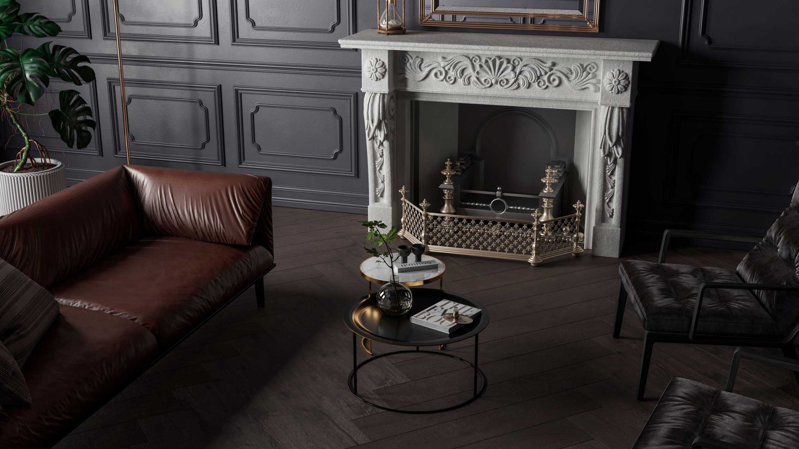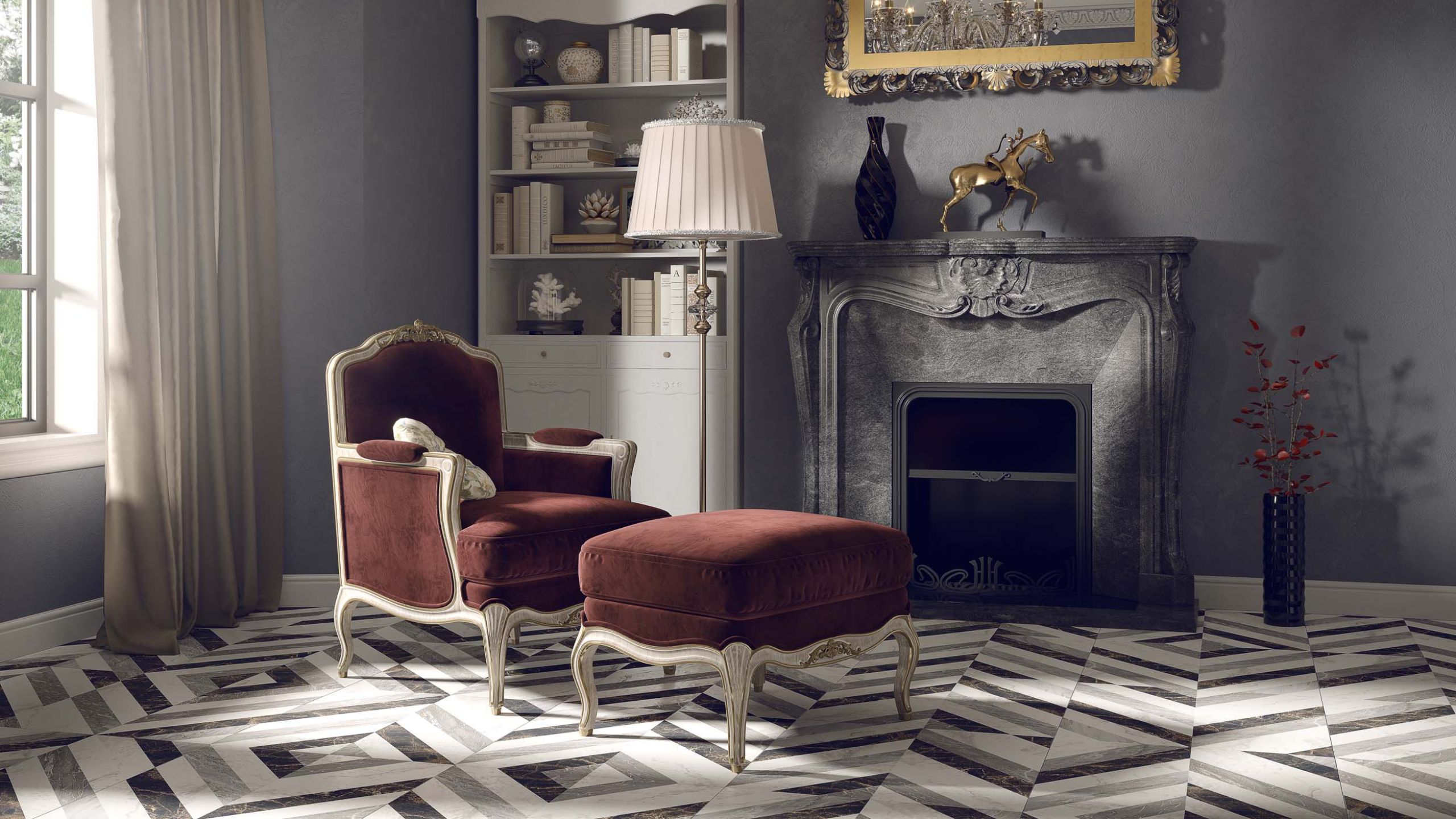 В качестве напольного покрытия, соответствующего викторианскому стилю, можно присмотреться к коллекциям Alavesa, Selection из линейки Ametis by Estima. Этот керамогранит повторяет текстуру дерева с высокой степенью детализации.