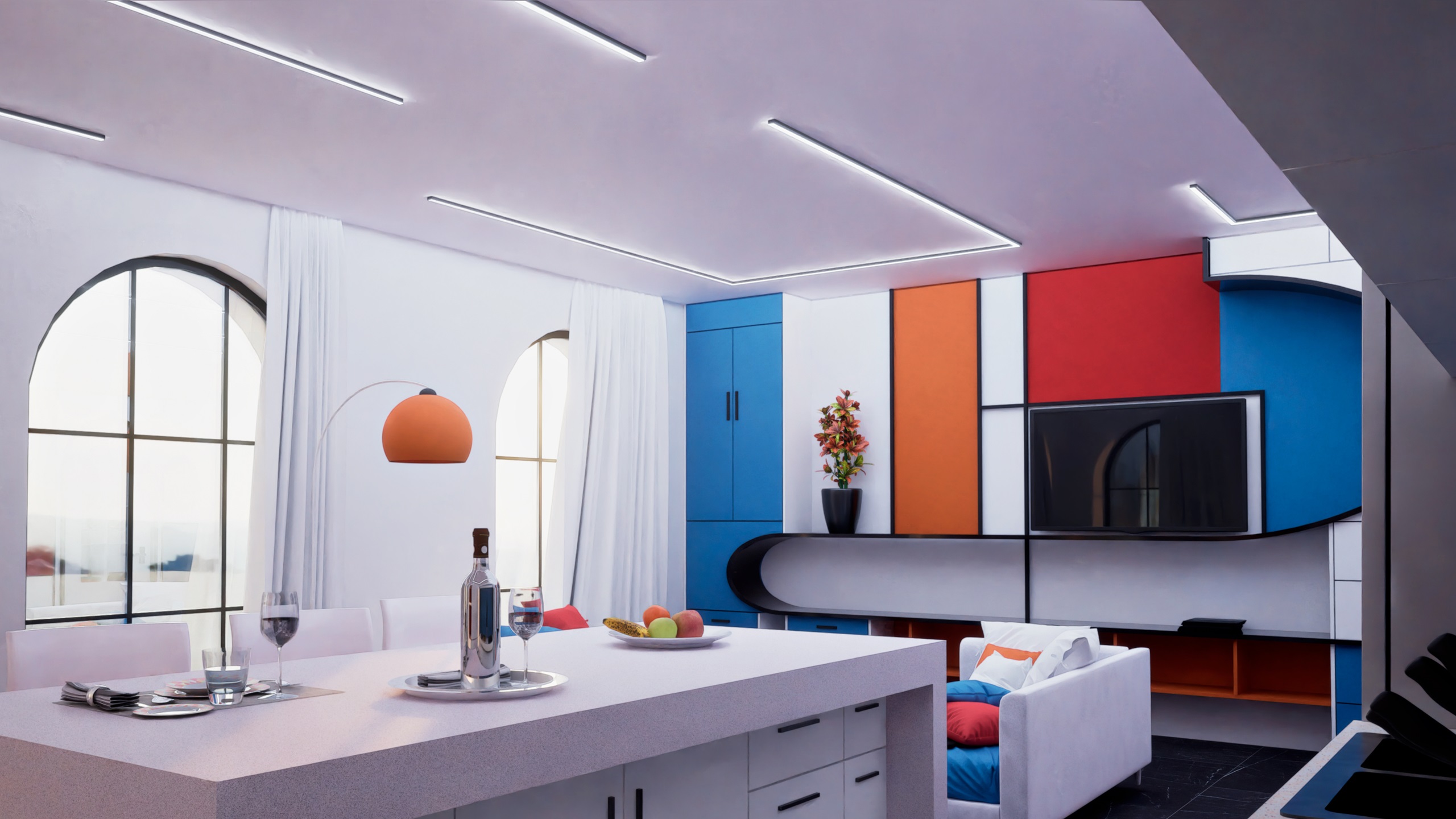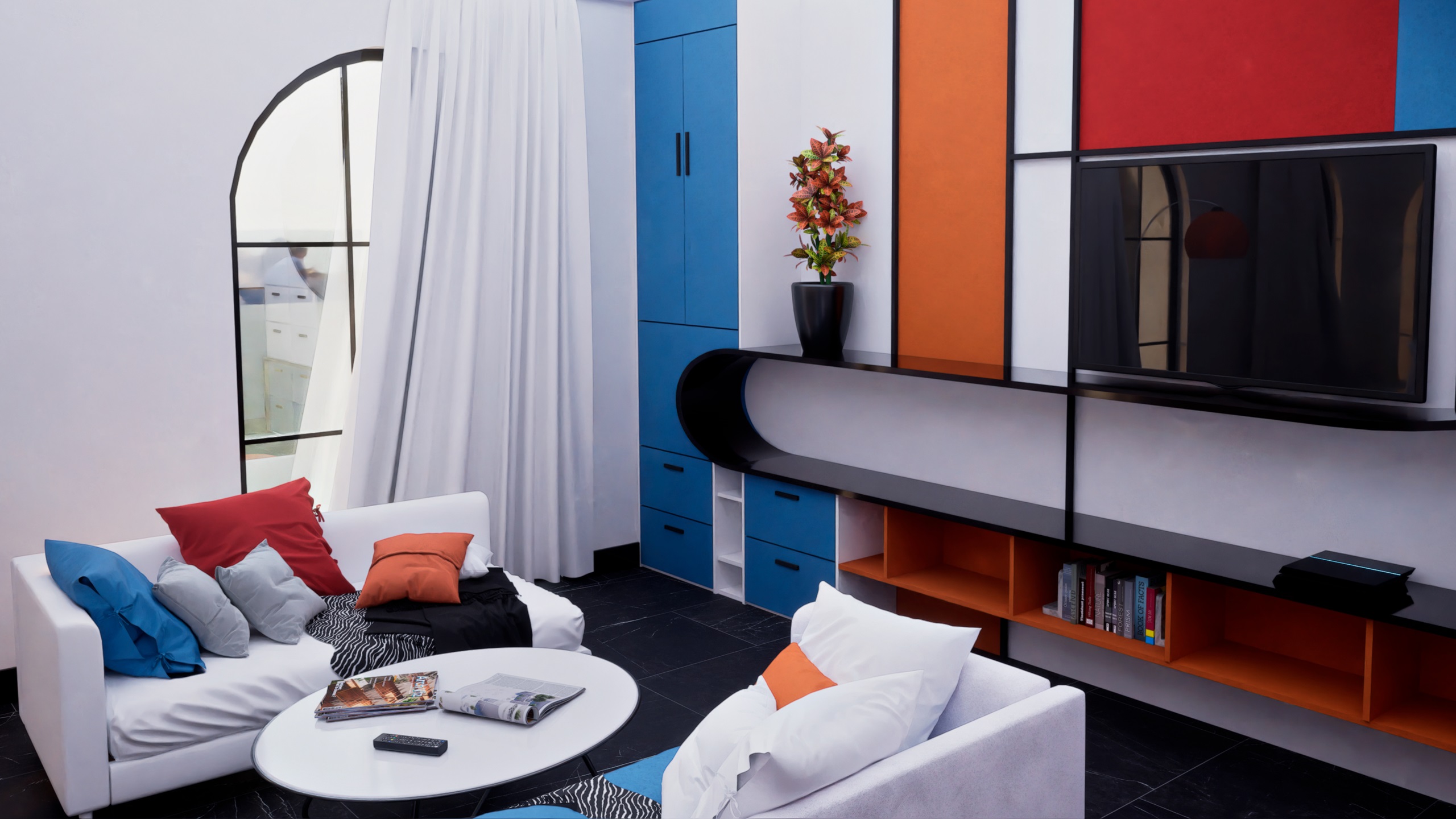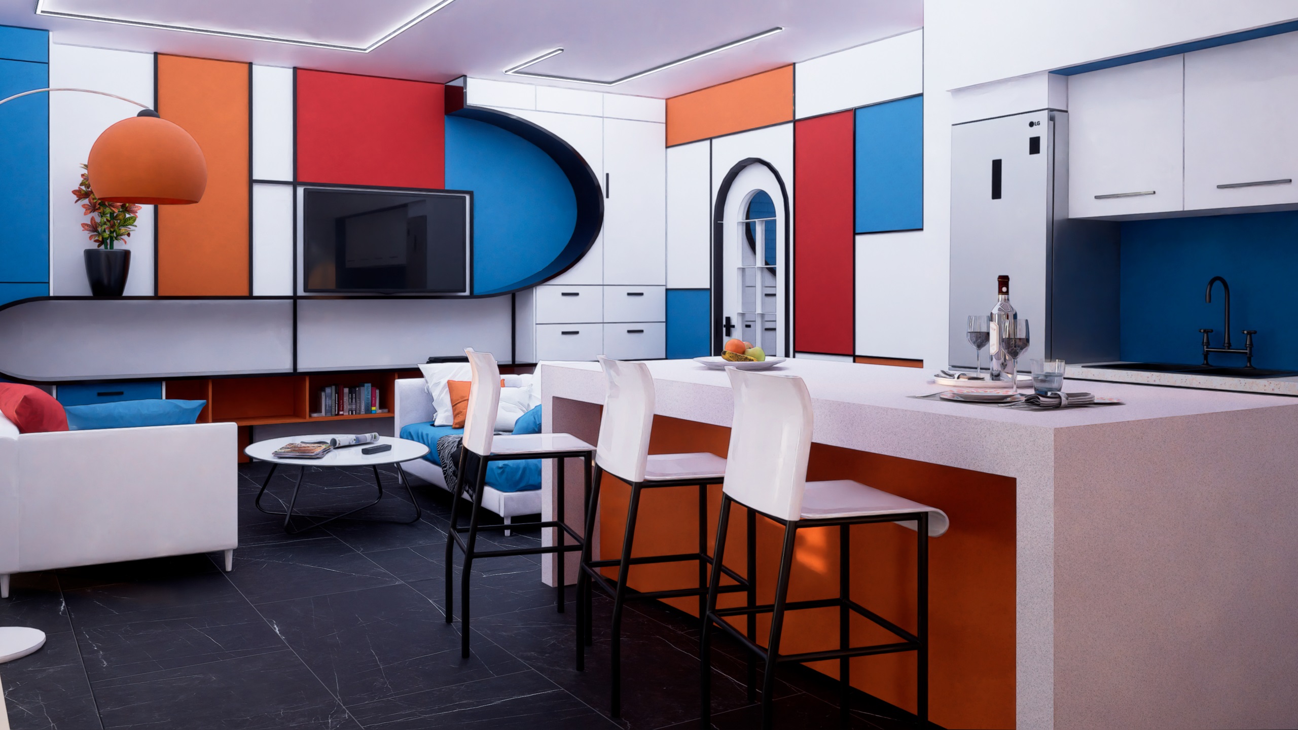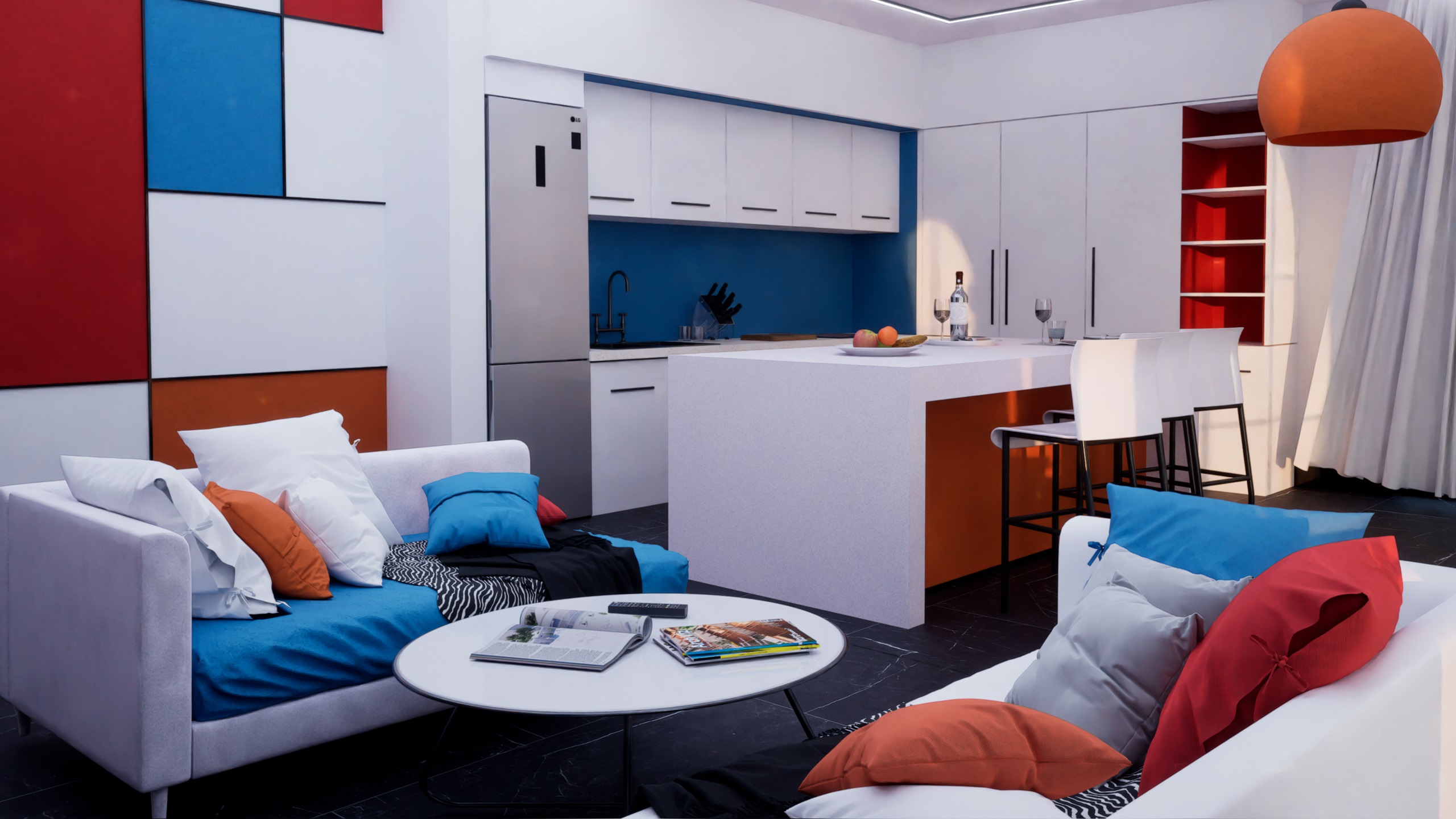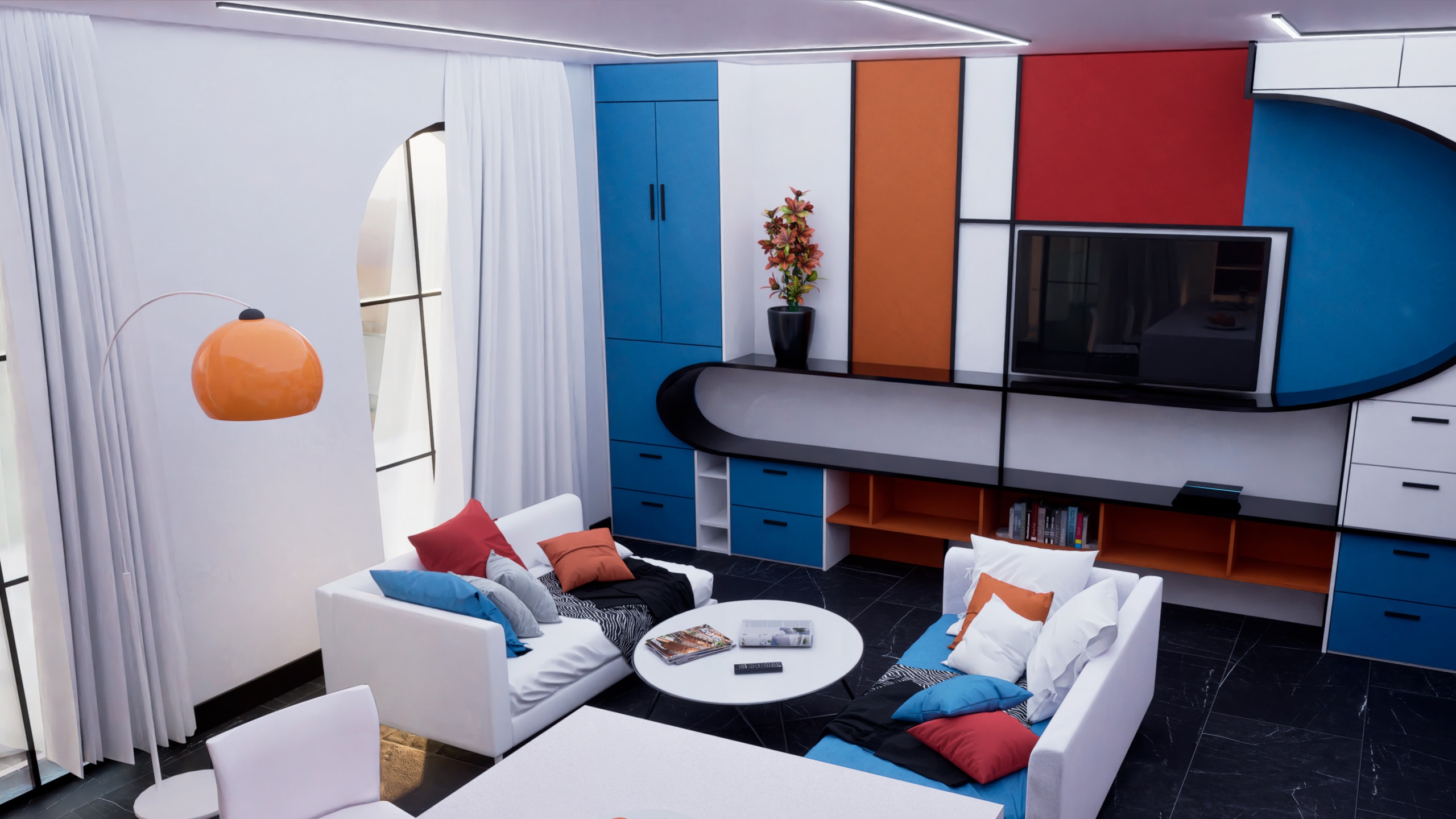 В конкурсе «Керамогранит в архитектуре» участвовал очень необычный проект авангардного жилья. Интерьер, оформленный в контрастных ярких цветах, притягивает взгляд, стимулирует творческое мышление и дарит вдохновение. В качестве напольного покрытия использован керамогранит из коллекции Vision.