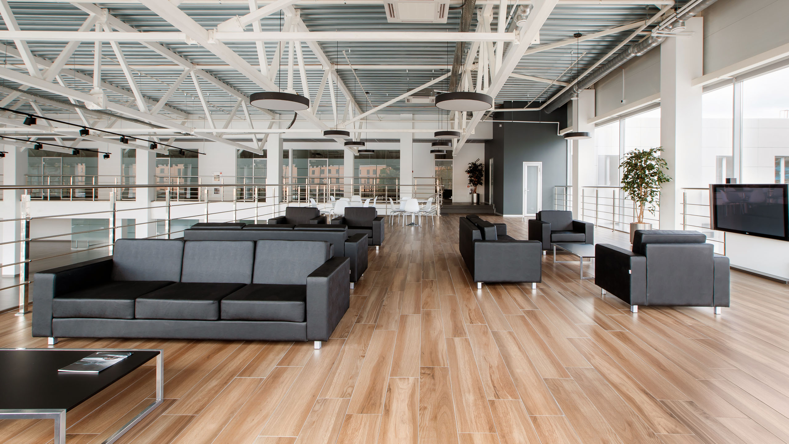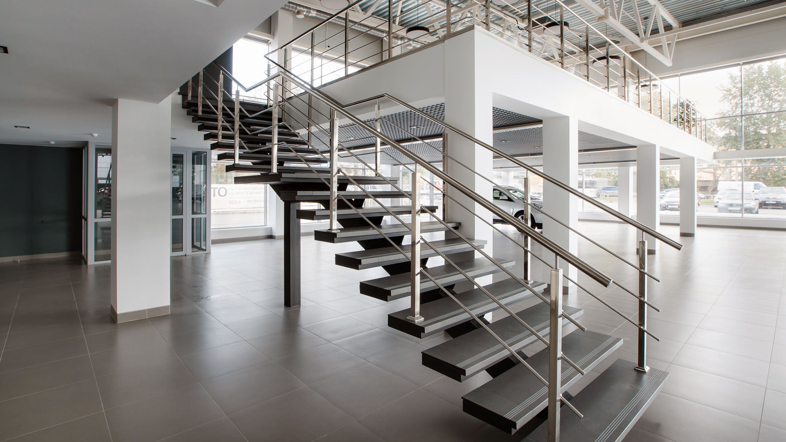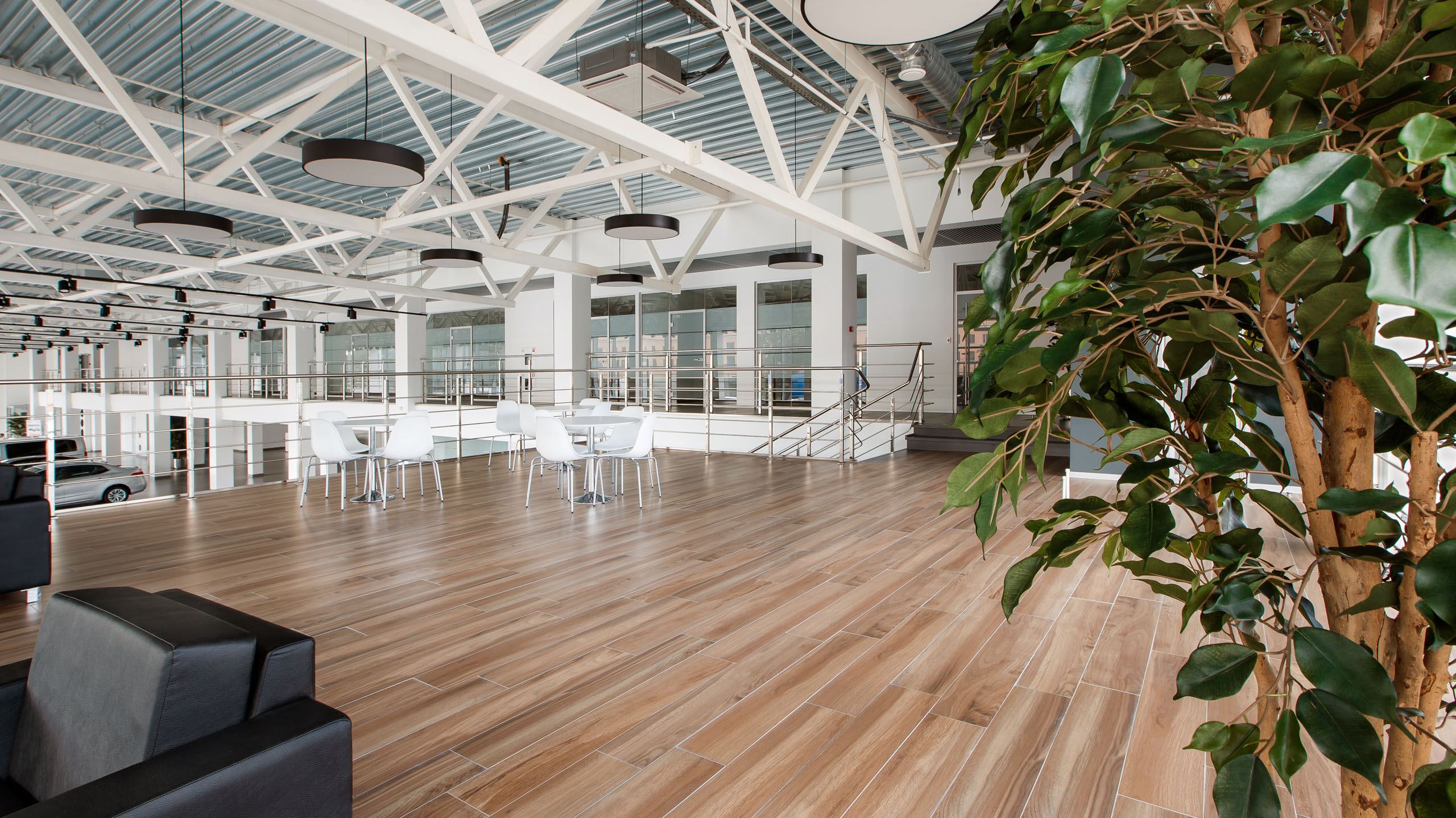 Просторный автосалон с клиентской зоной. Дизайнер проекта — Алексей Копылов.