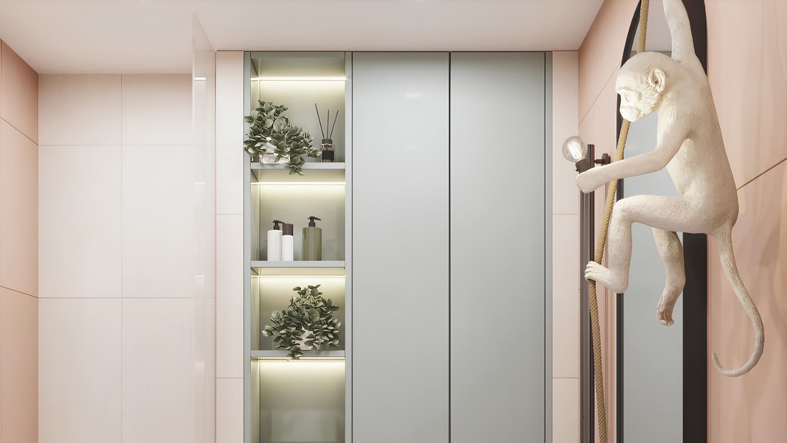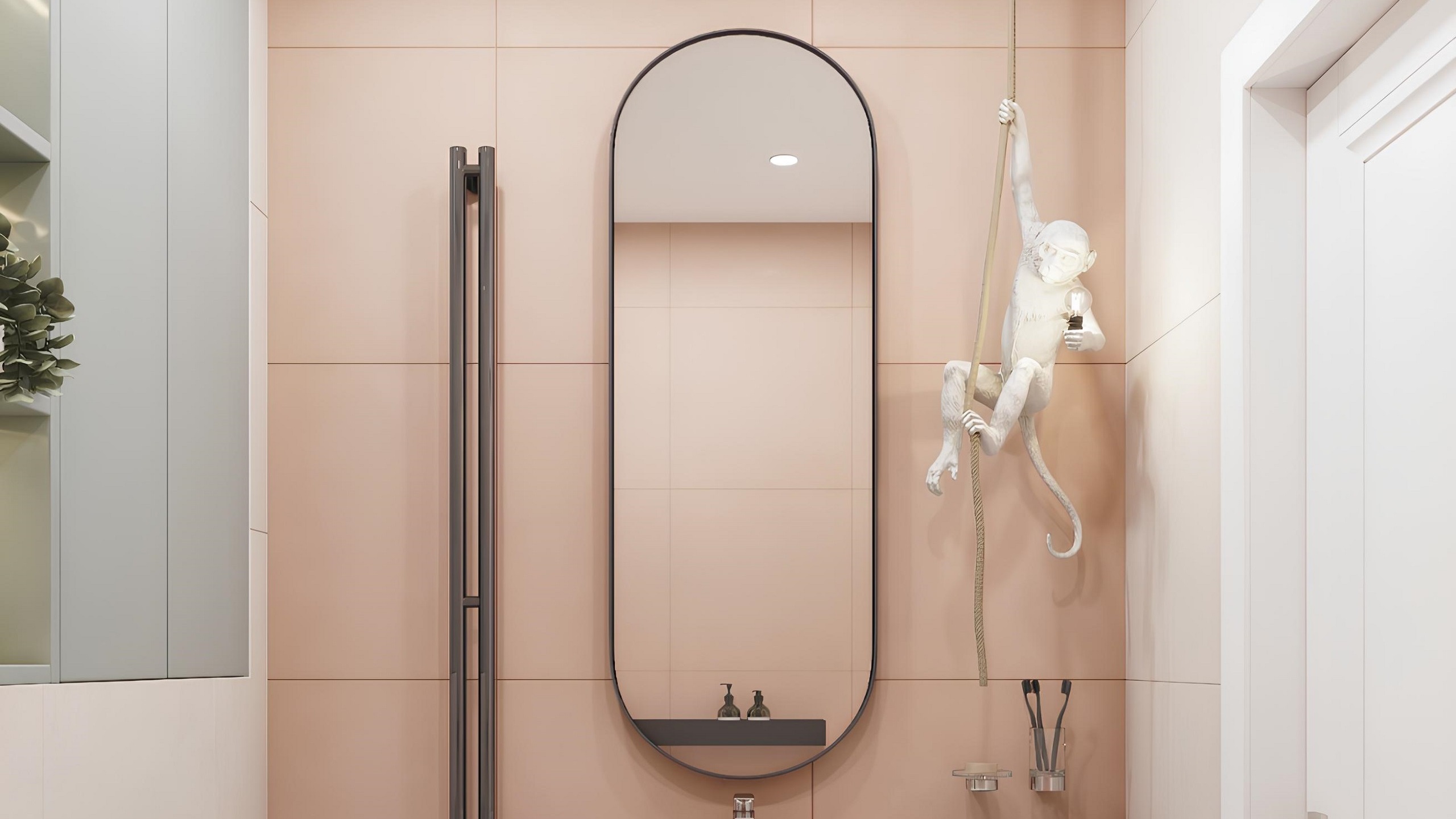 Центральным декоративным элементом комнаты стала фигурка обезьяны, висящей на зеркале. Она же выступила в качестве оригинального светильника.