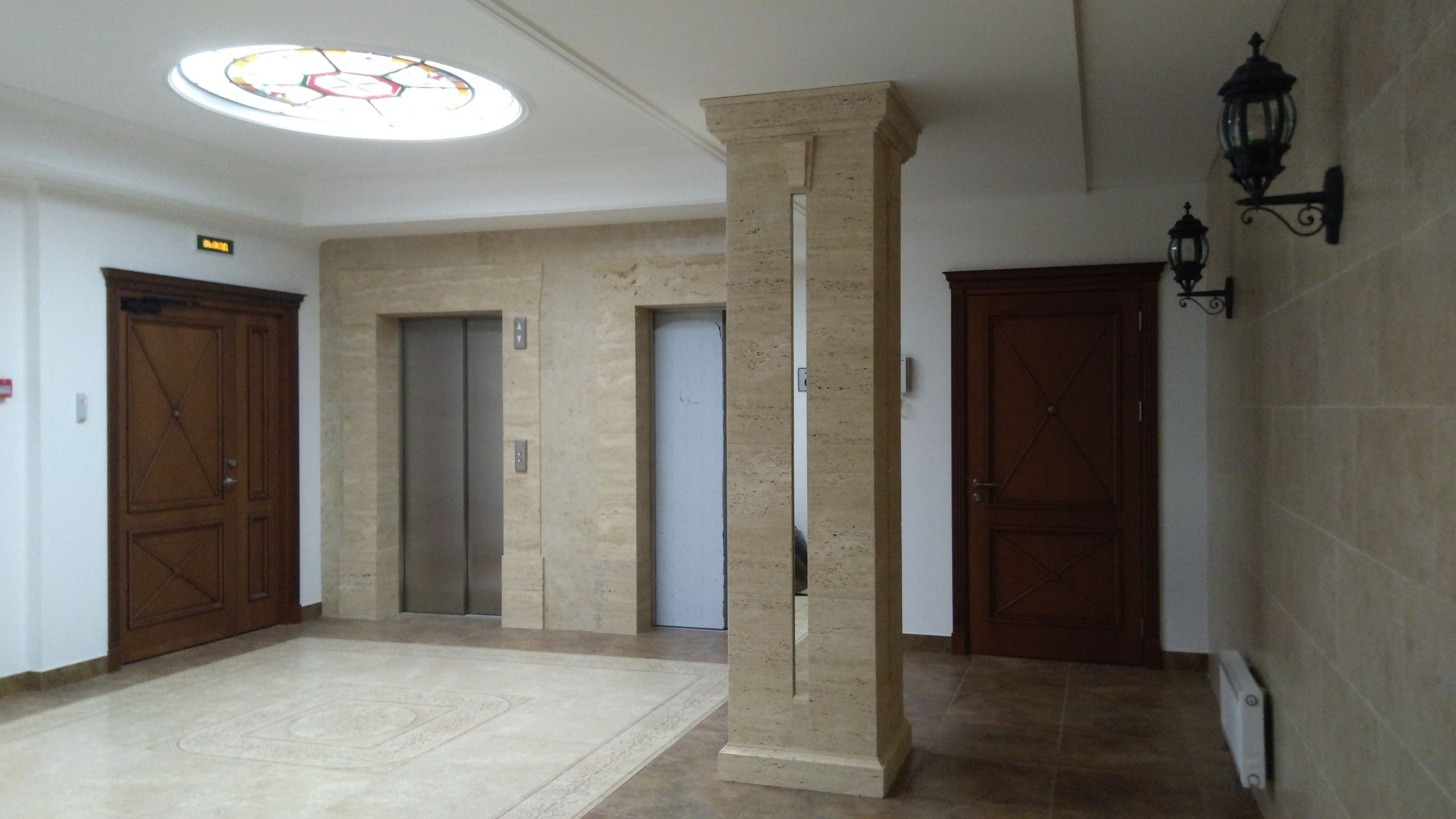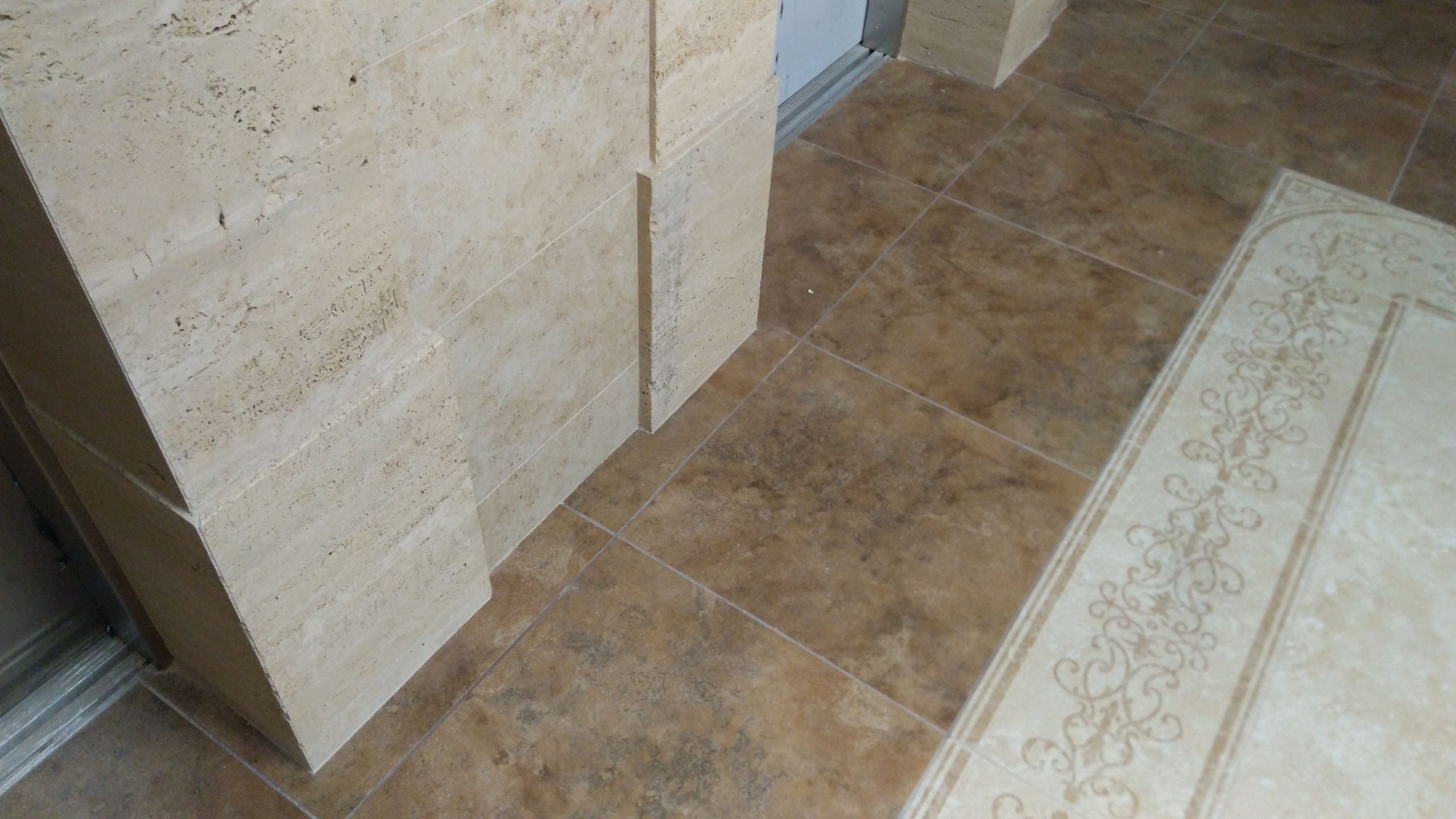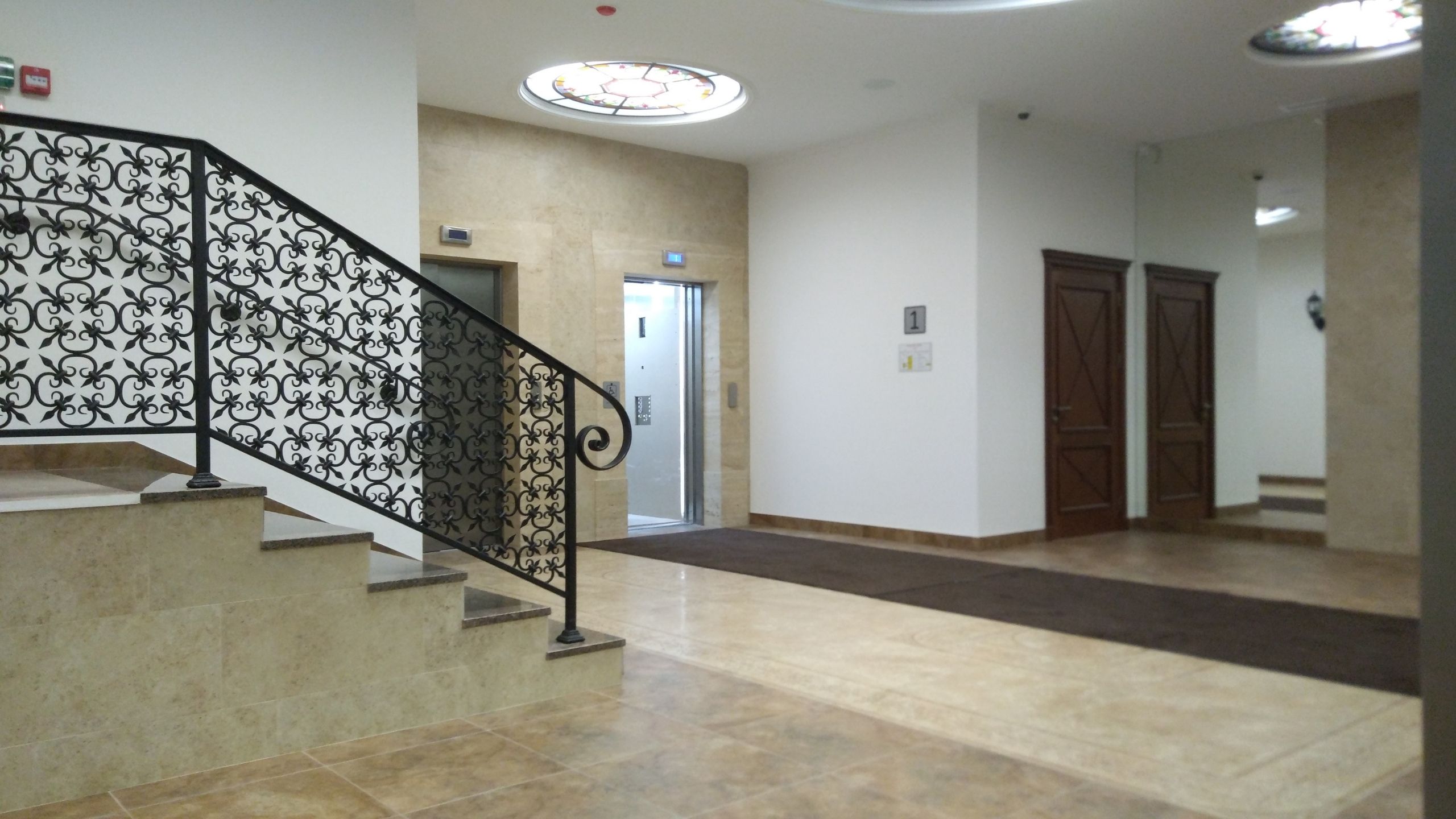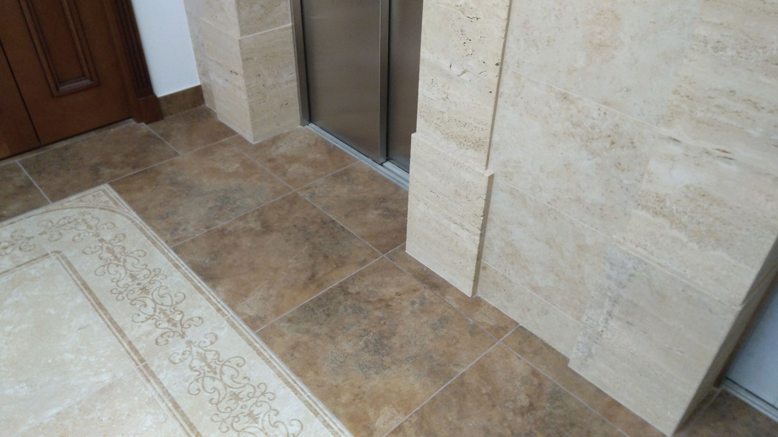 В этот раз была предложена средиземноморская тематика на контрасте с дождливой погодой Северной столицы и офисной рутиной. Отсюда в проекте появился натуральный камень, витражи и теплые оттенки. Специфика проектирования коммерческих помещений всегда подразумевает поиск оптимальных материалов как по качеству, так и по цене. Зачастую приходится долго и скрупулезно сравнивать и выбирать разных производителей. Керамогранит компании Estima из коллекции Jazz 02 300x600 оказался удачным выбором: он идеально подошел к натуральному травертину в обрамлении зеркал и лифтовых проемов, а также акцентировал внимание на стены в коридорах, лифтовых холлах, вестибюле и на лестничных клетках.