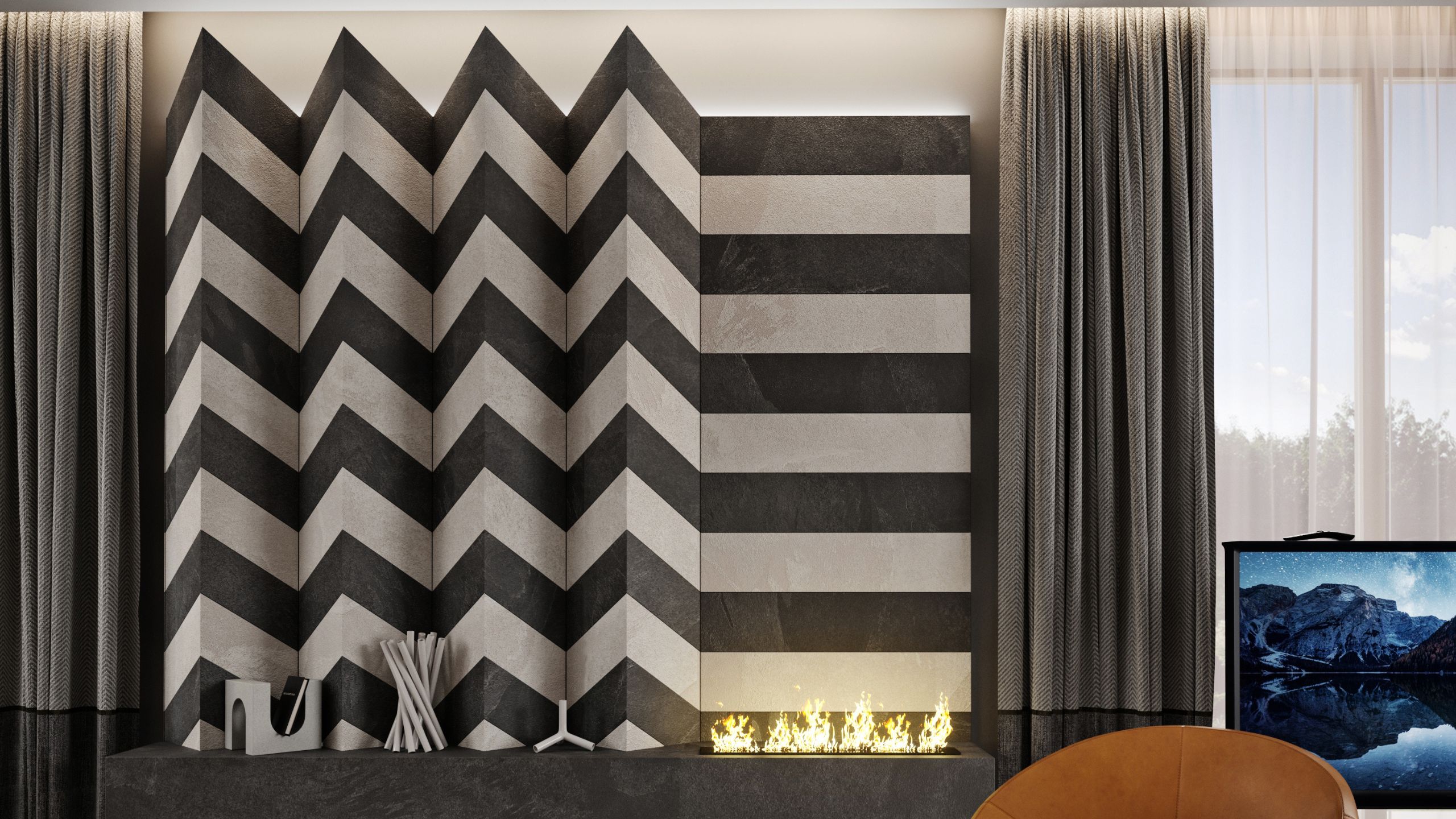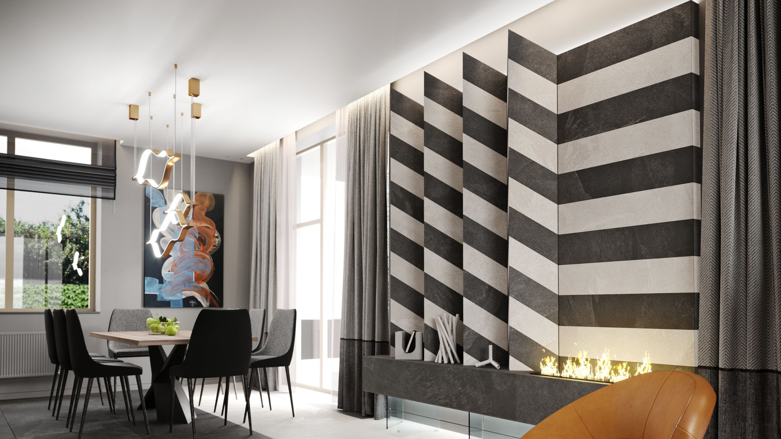 Отделку произвели керамическим гранитом из коллекции Terra. Чтобы сделать стену еще более необычной, дизайнер подчеркнула ее объем при помощи контраста цветов: молочного и темно-серого.Таким же материалом уложили и пол в гостиной, установив изначально систему теплых полов. С такой комбинацией даже в холодное время года по дому можно было ходить босиком.