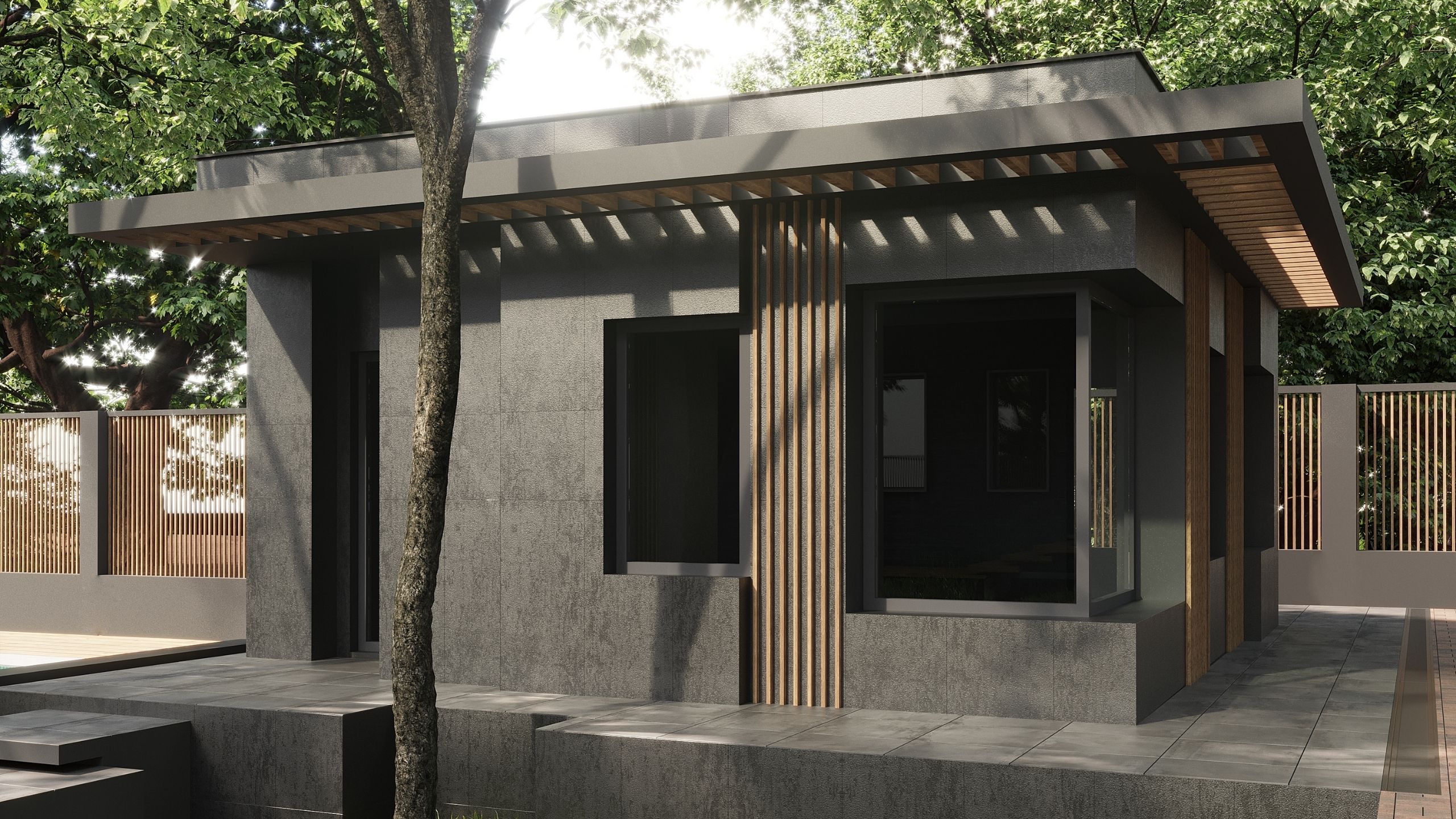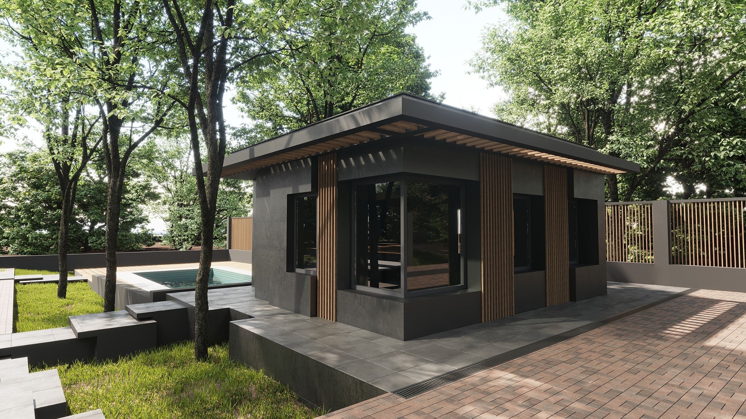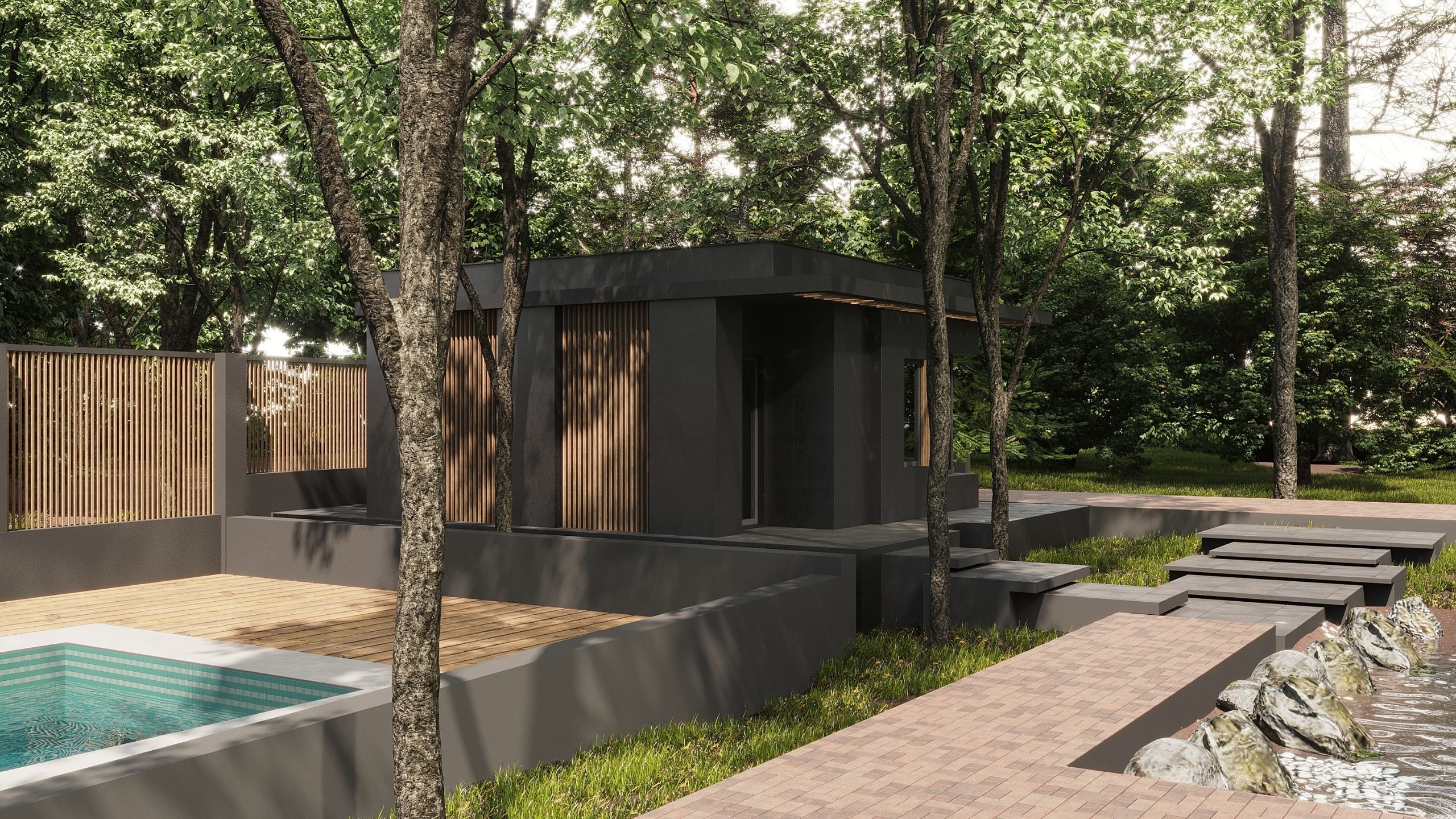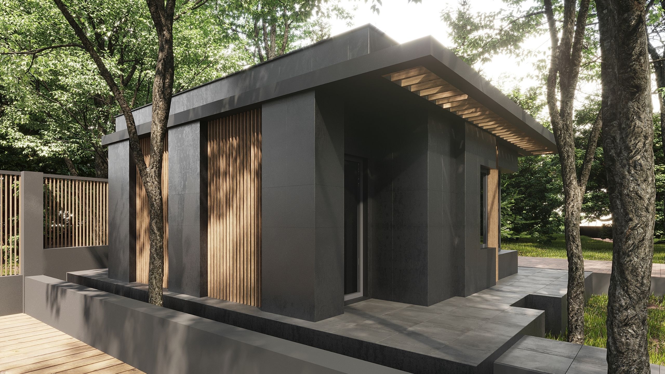На территории 1700 м2 расположился большой жилой дом, мангальная зона и бассейн. Для полной гармонии и удобства хозяевам загородного участка не хватало дома для персонала. Его проектированием и занялась архитектурная студия “А”. Благодаря лаконичным формам, простой геометрии и выверенным линиям дом идеально вписался в окружающий ландшафт. Для отделки фасада дизайнер Алексей Федоров подобрал керамогранит, имитирующий бетонное покрытие — коллекция Luna в цвете 04. В сочетании с термо обработанным деревом получился минималистичный, но в то же время интересный дизайн.