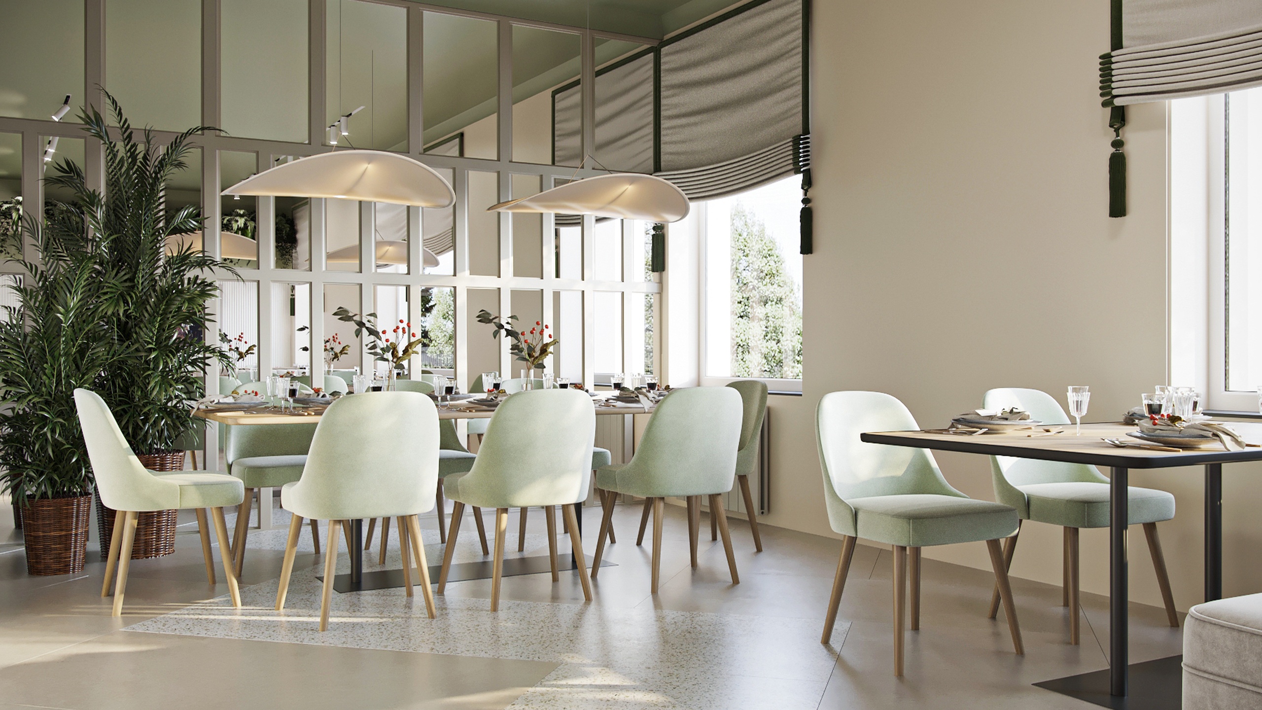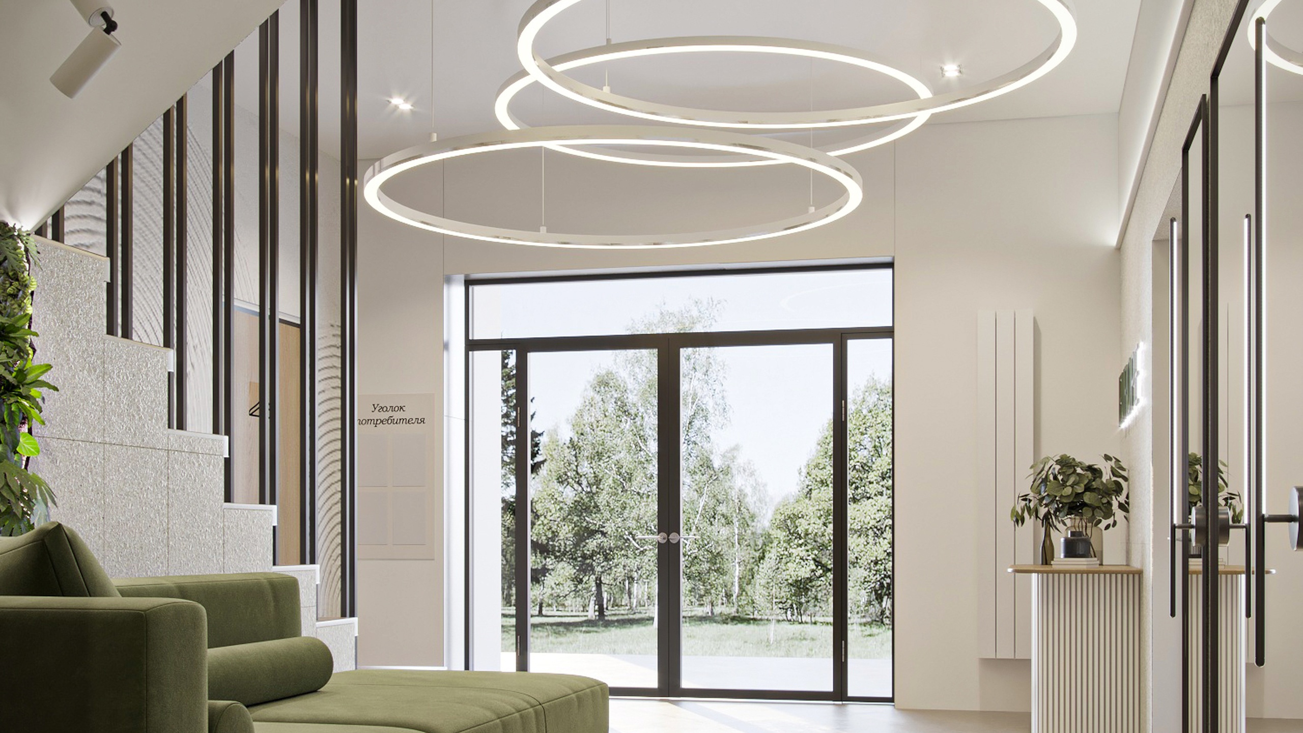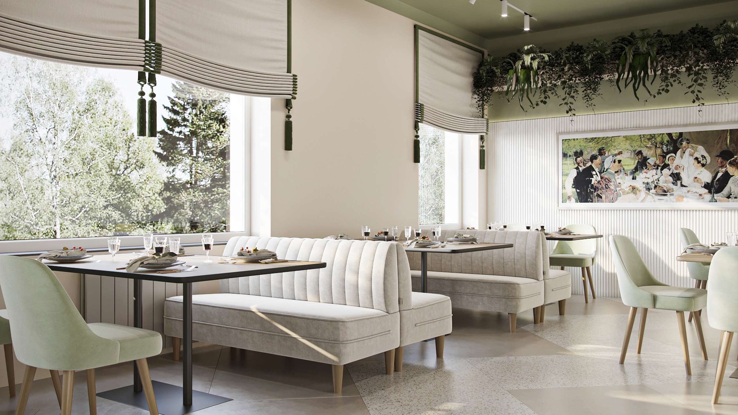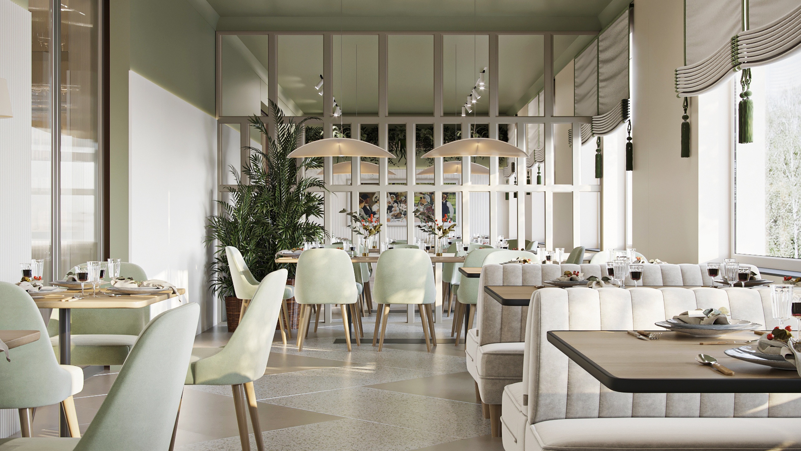 В проекте использовано много пастельных цветов, в качестве акцентного выступает оливково-салатовый. Его выгодно оттеняет богатый природный рисунок керамогранита из коллекций Terra, Cosmos и Luna. Плита легкое моется, не теряет цвет от химических средств — идеальное решение для общественного пространства.