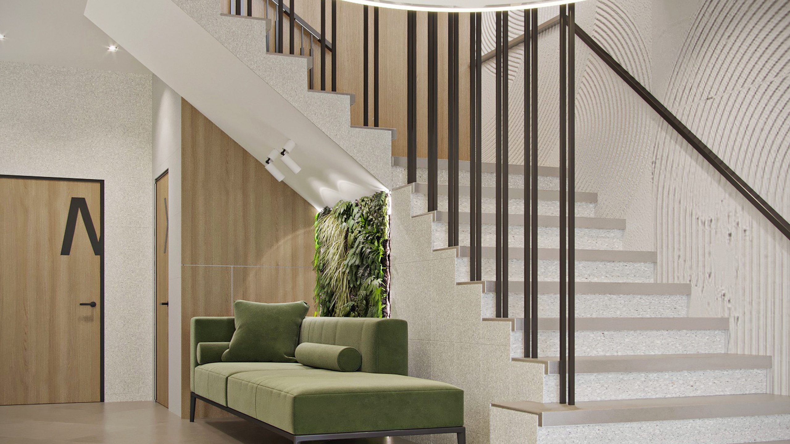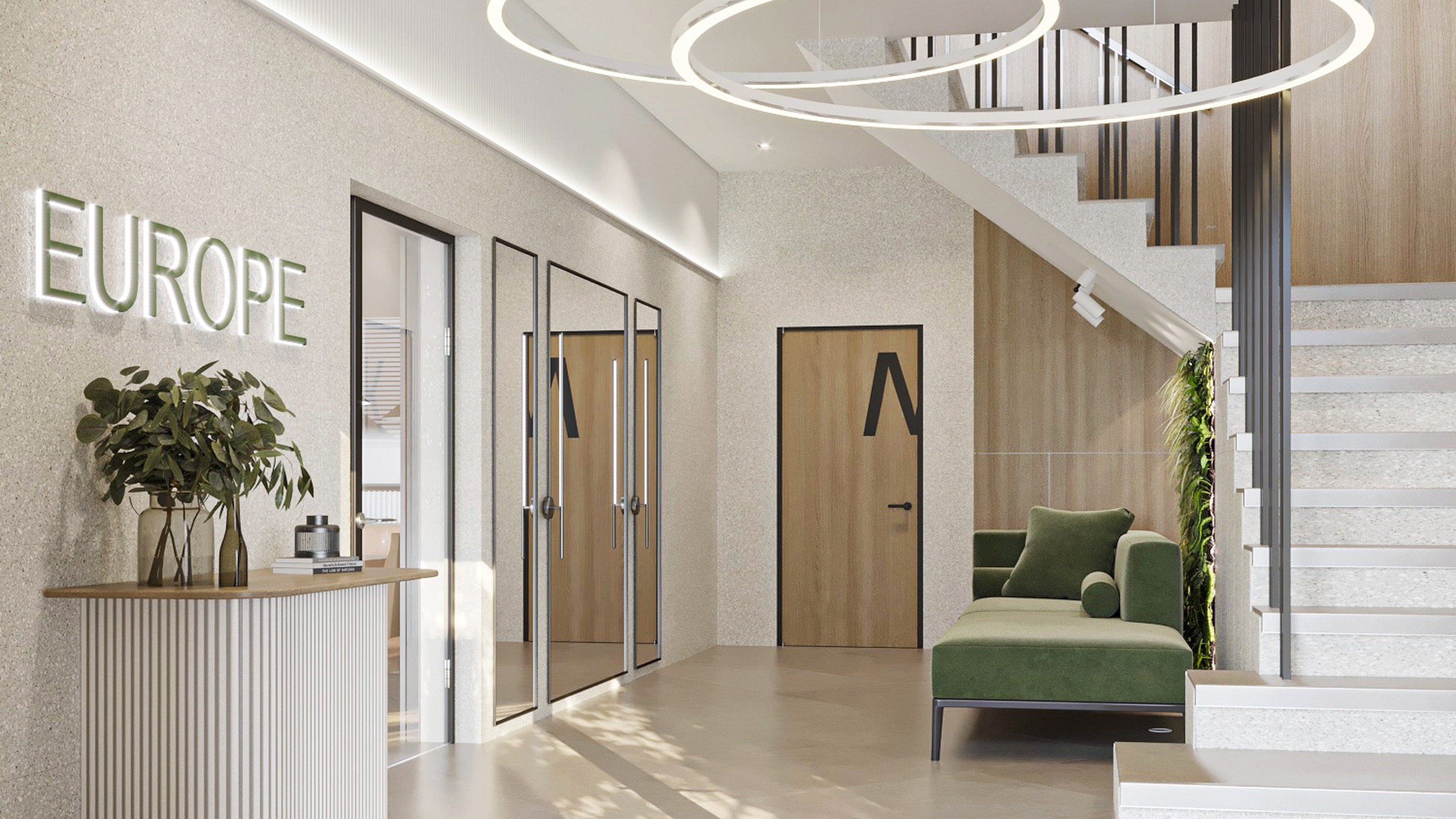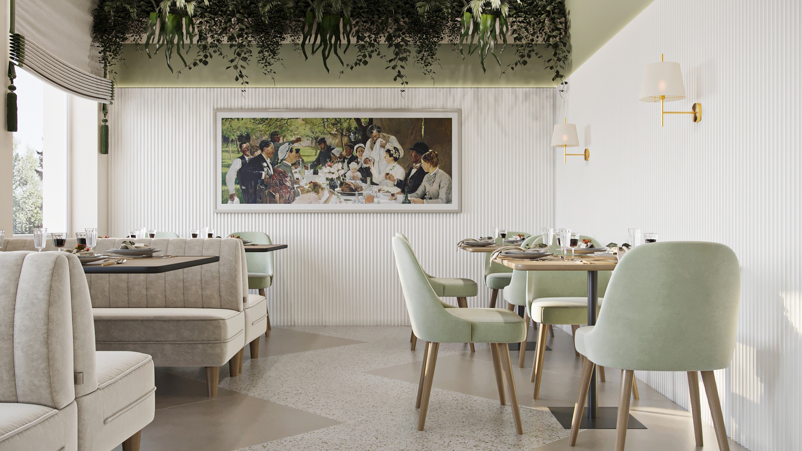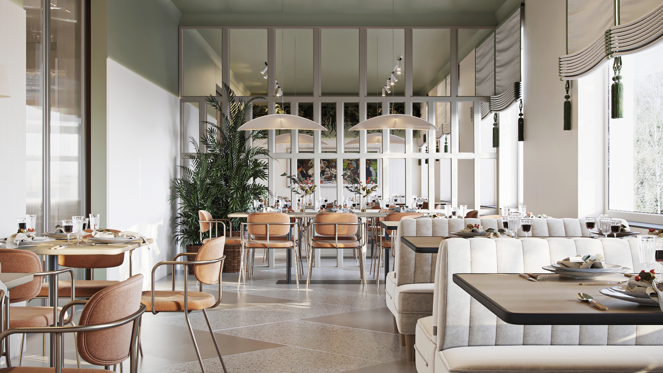 В проекте использовано много пастельных цветов, в качестве акцентного выступает оливково-салатовый. Его выгодно оттеняет богатый природный рисунок керамогранита из коллекций Terra, Cosmos и Luna. Плита легкое моется, не теряет цвет от химических средств — идеальное решение для общественного пространства.
