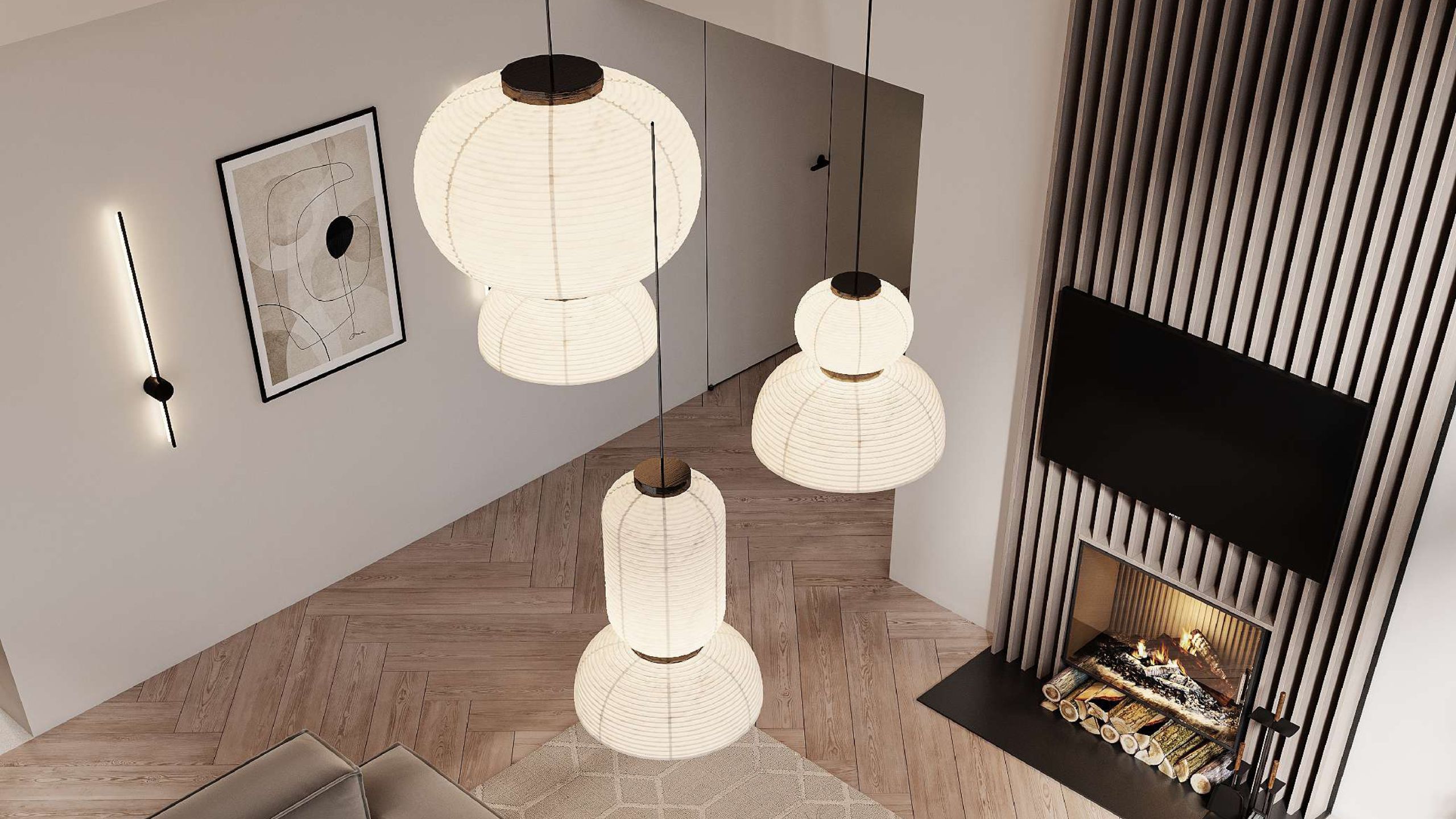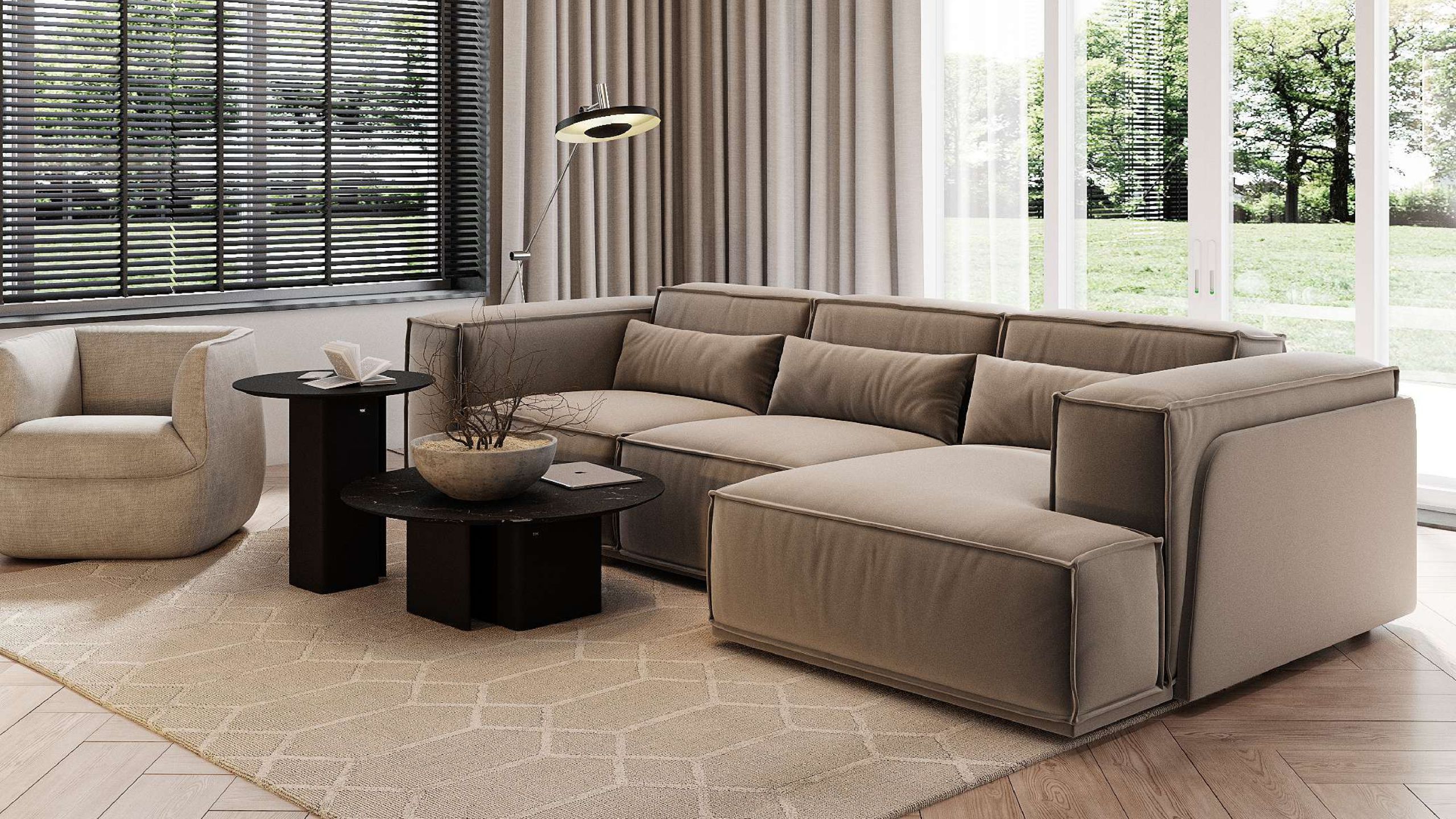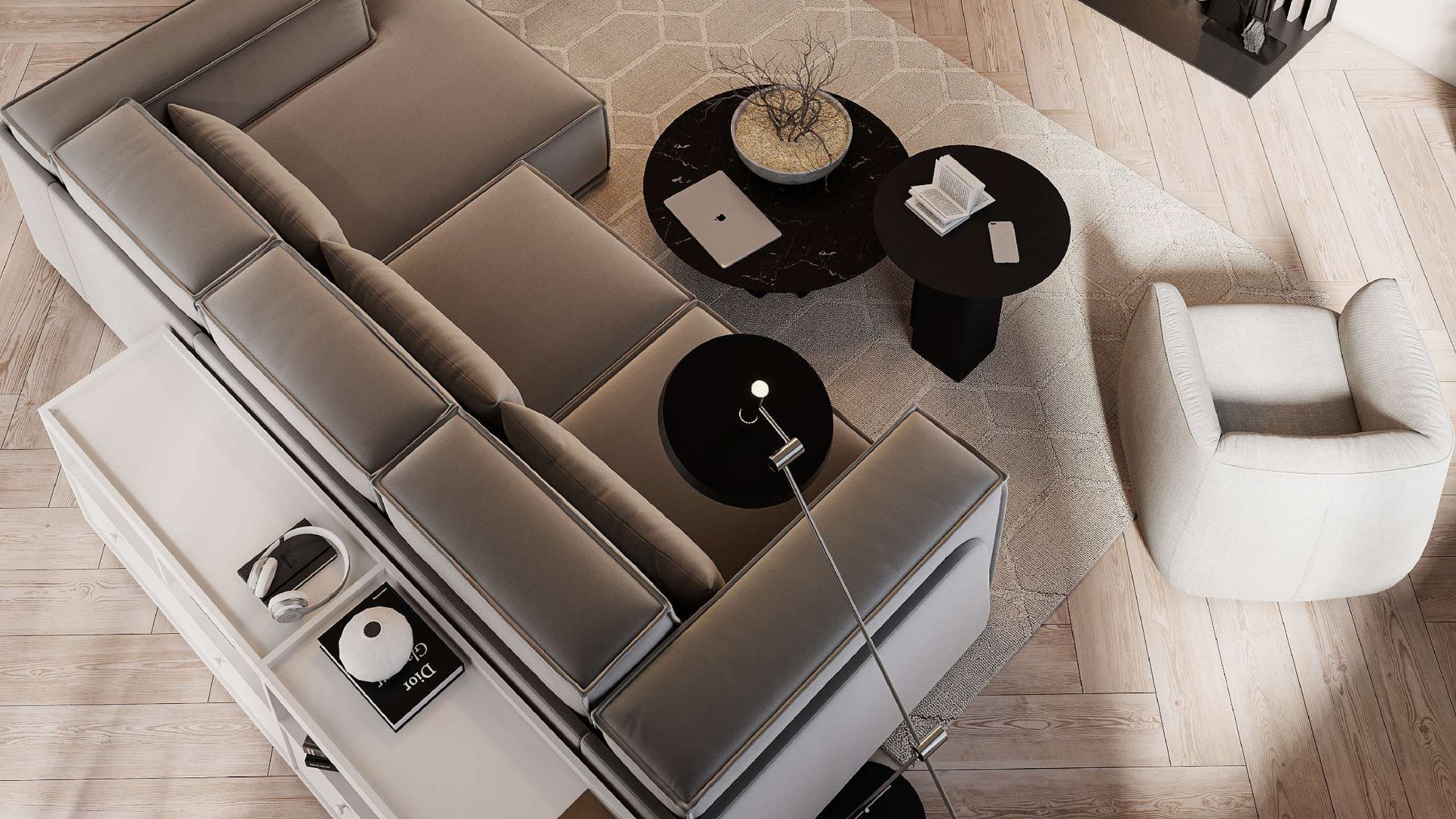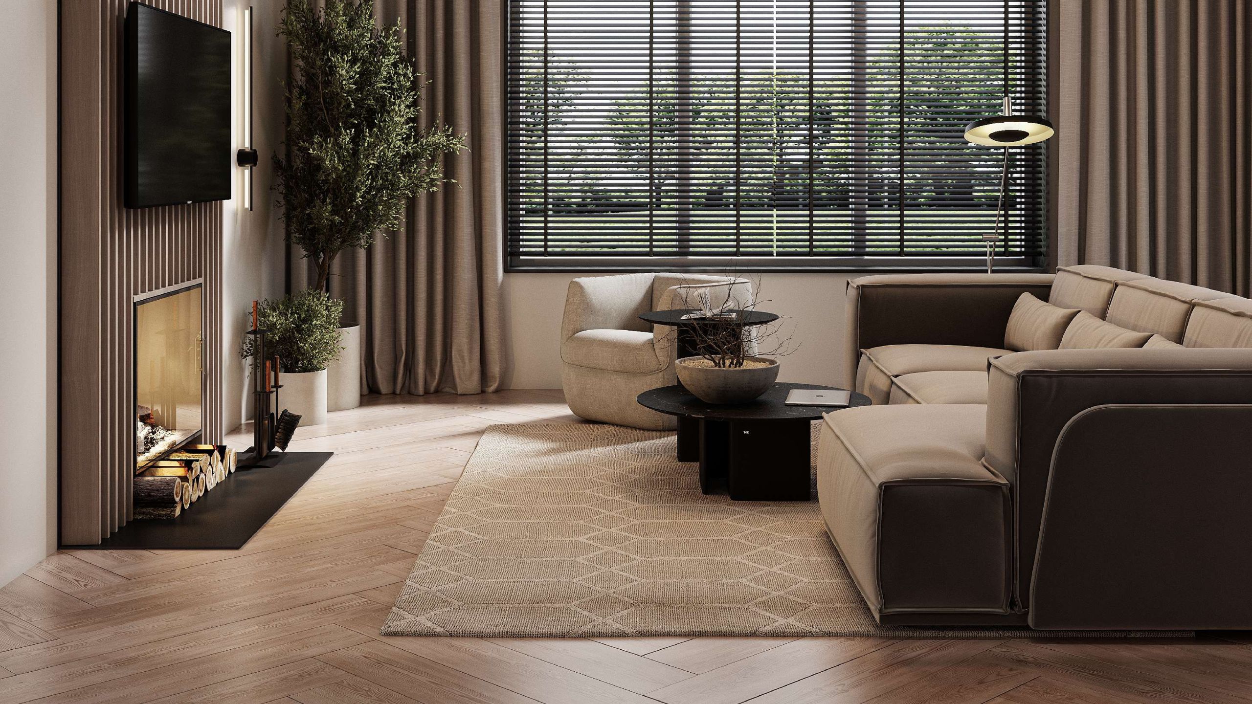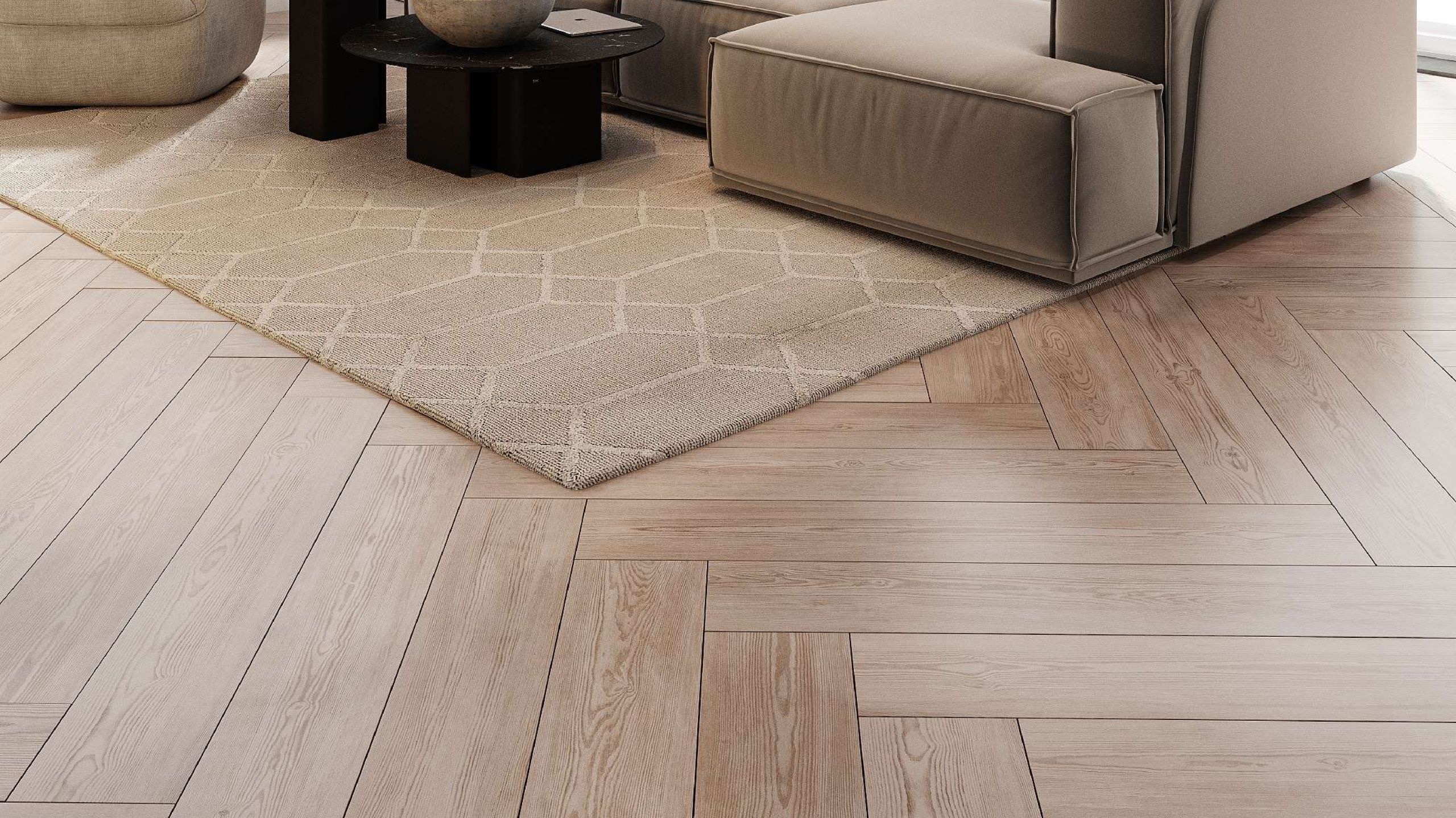 Большие «мазки» в интерьере, такие как тканевая люстра, массивные шторы из натурального льна, керамогранит, выложенный ёлочкой, срабатывают на ура. Они не дают интерьеру выглядеть "пусто", а создают законченную композицию. В таком помещении действительно уютно и есть место для чего-то нового.