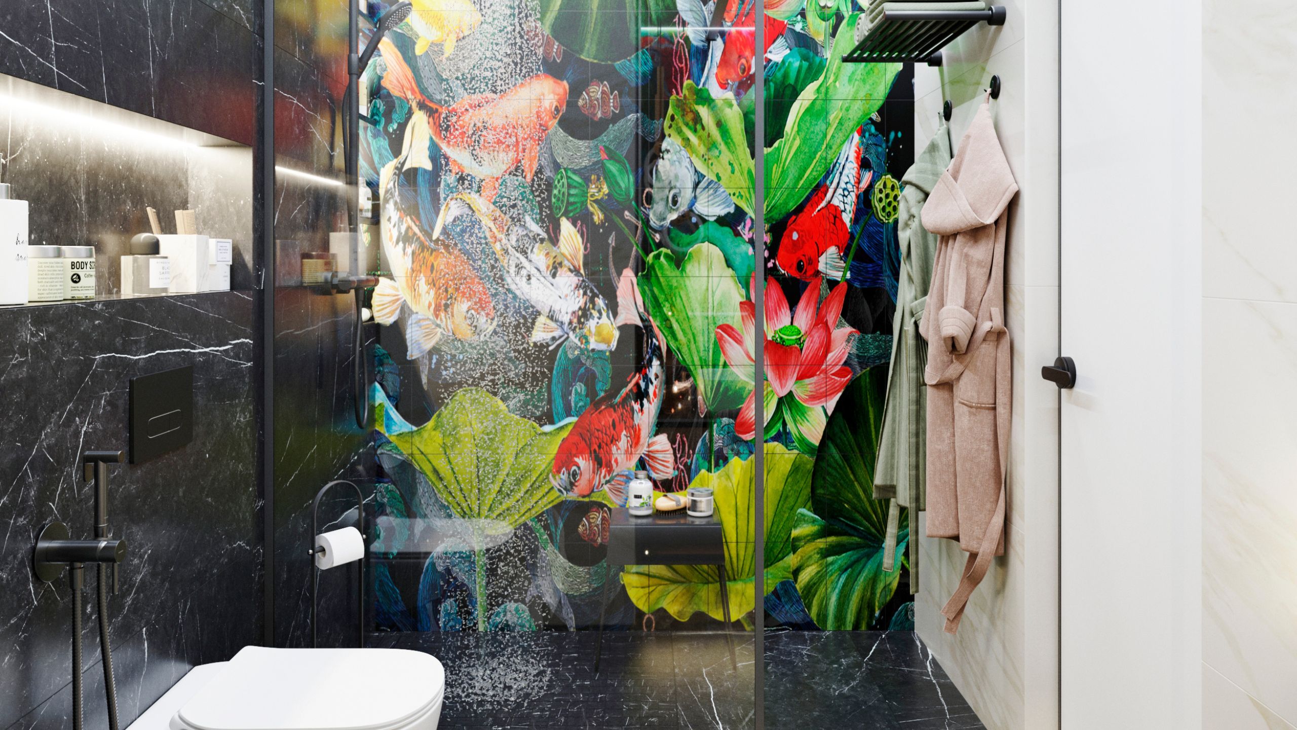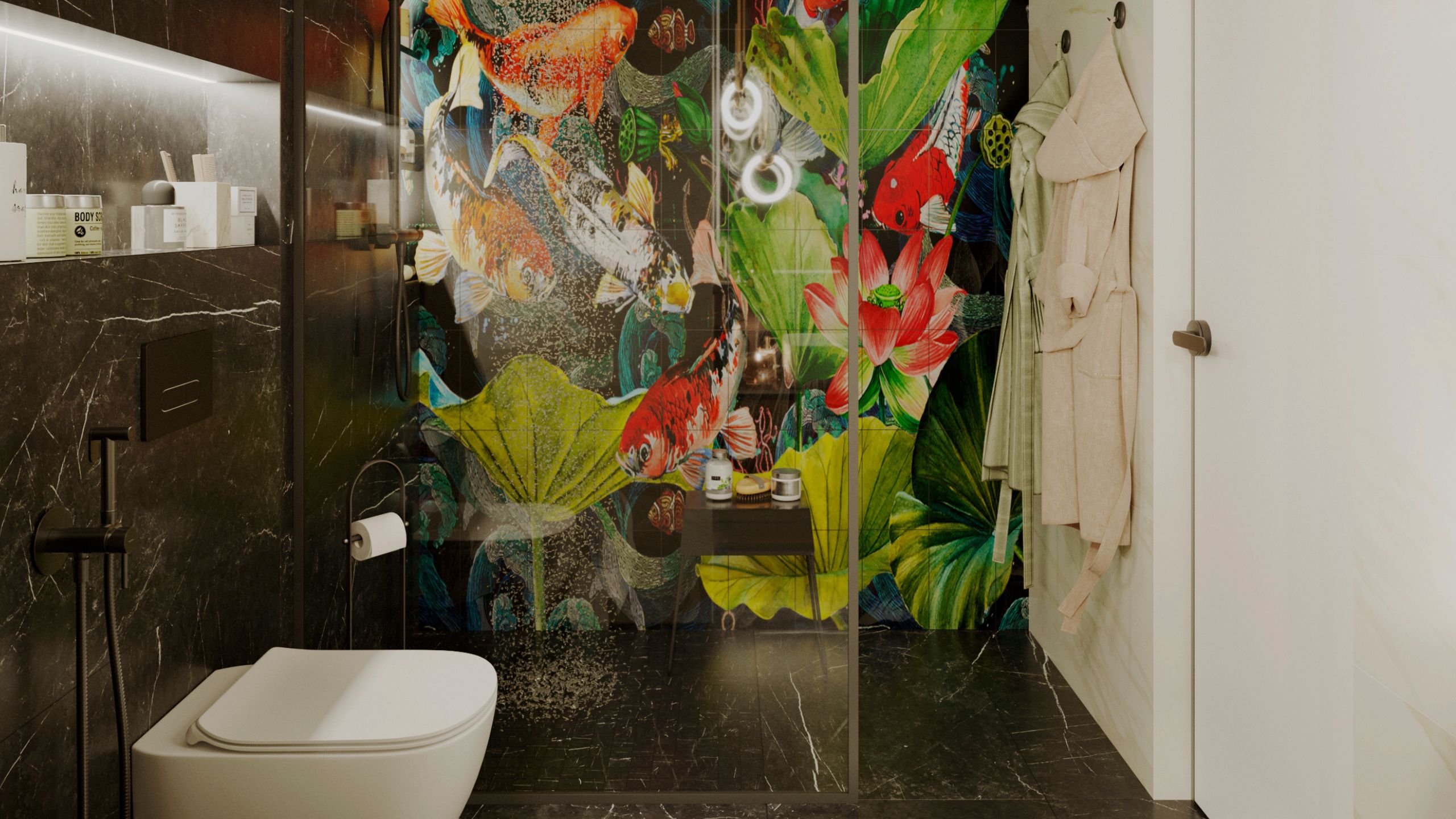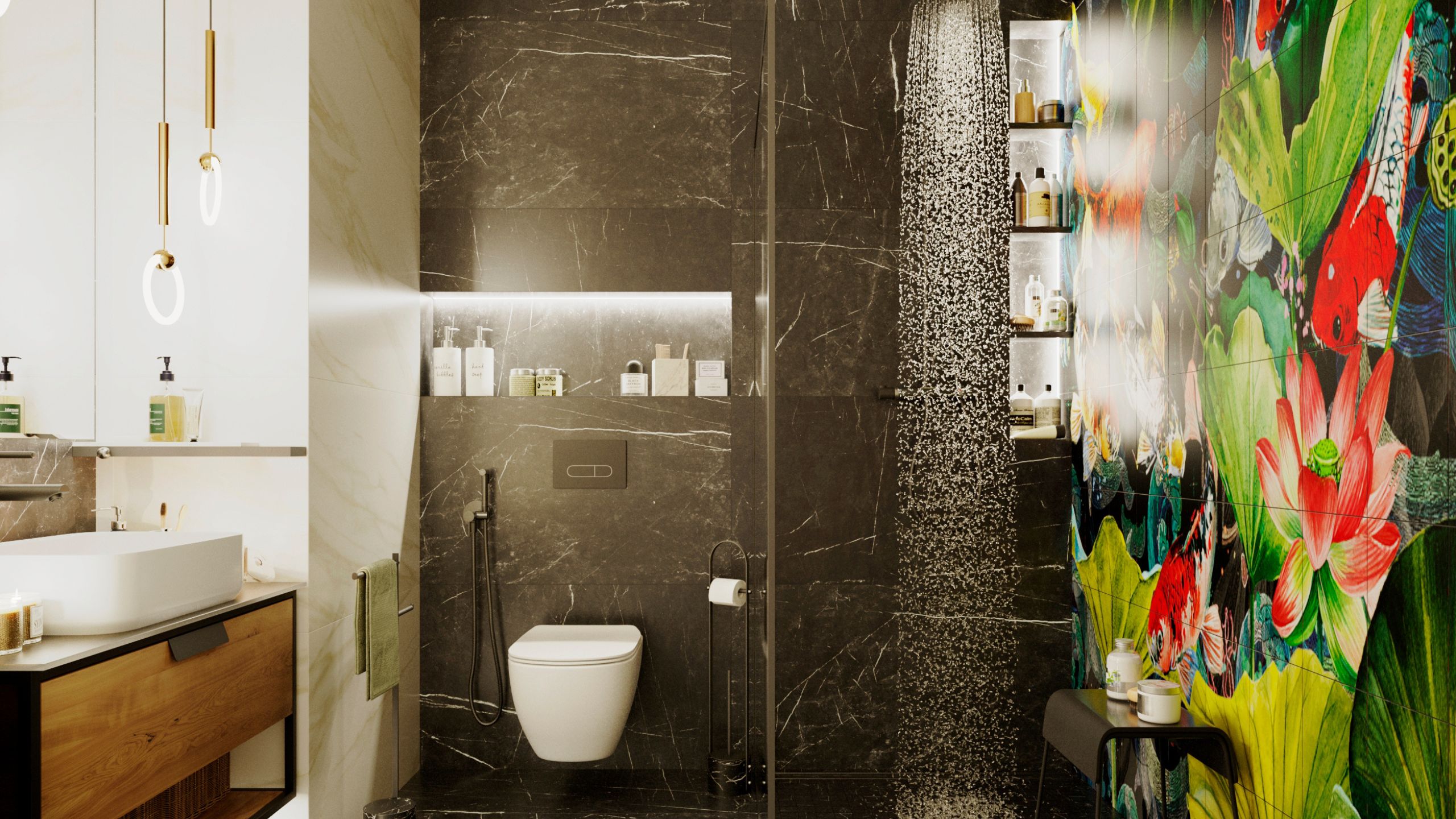 Центральный элемент этой душевой — яркое панно с изображением тропических листьев и экзотических рыб. Для оформления пола и стен дизайнер Ирина Фадеева искала менее насыщенное по цветовой гамме, но элегантное и стильное решение, позволяющее подчеркнуть статус и вкус владельцев дома. Под этот запрос идеально подошёл керамогранит от ТМ Estima из коллекций Ideal и Vision.