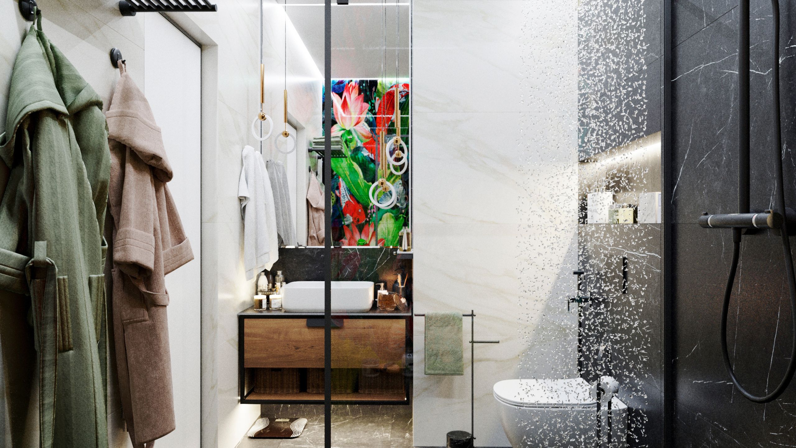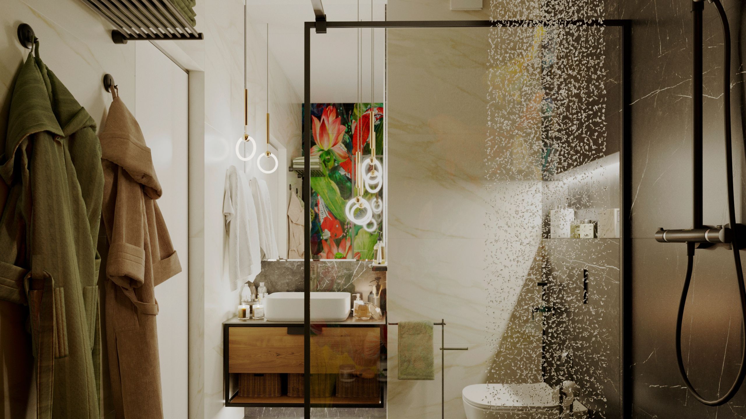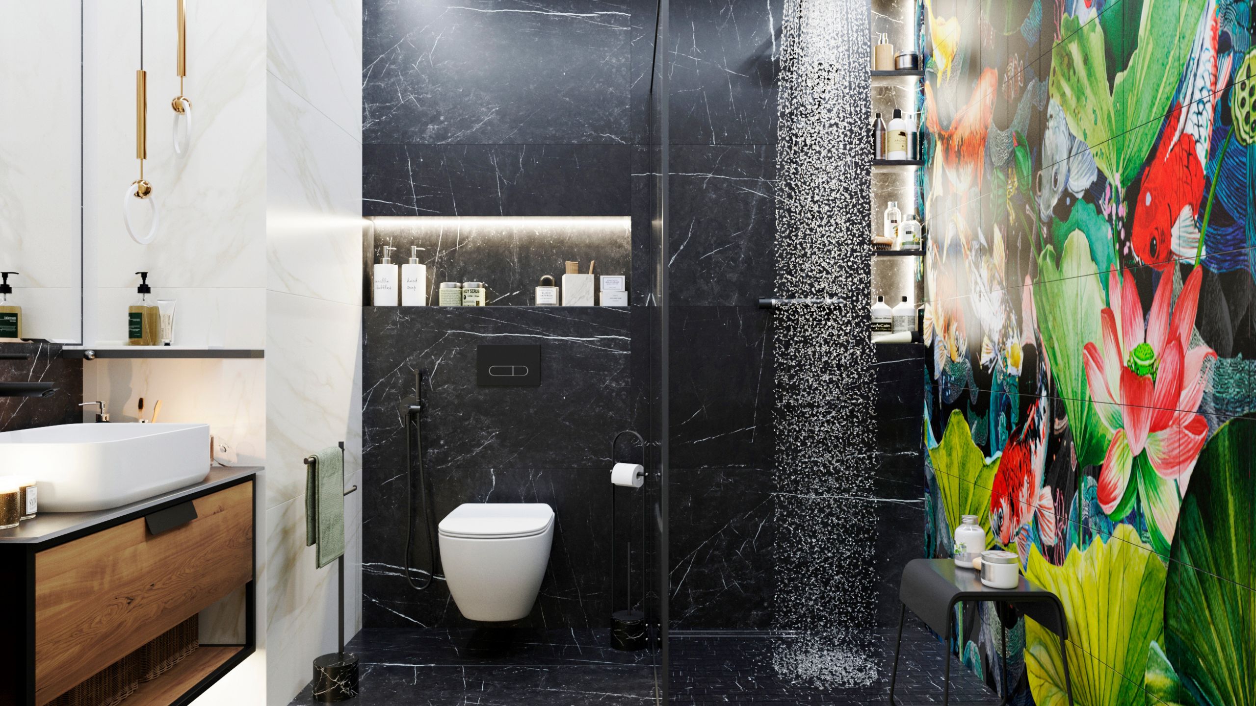 Центральный элемент этой душевой — яркое панно с изображением тропических листьев и экзотических рыб. Для оформления пола и стен дизайнер Ирина Фадеева искала менее насыщенное по цветовой гамме, но элегантное и стильное решение, позволяющее подчеркнуть статус и вкус владельцев дома. Под этот запрос идеально подошёл керамогранит от ТМ Estima из коллекций Ideal и Vision.