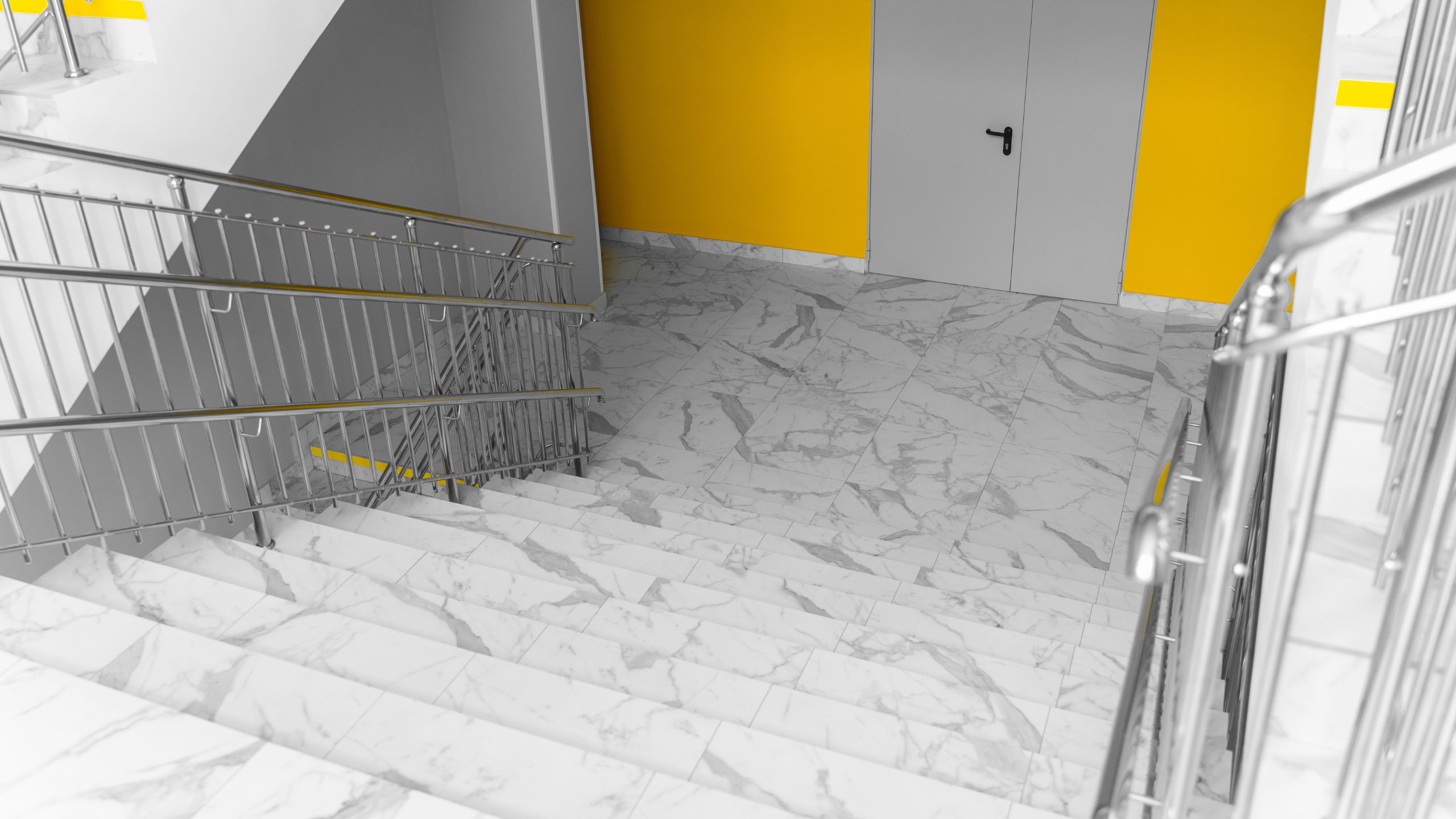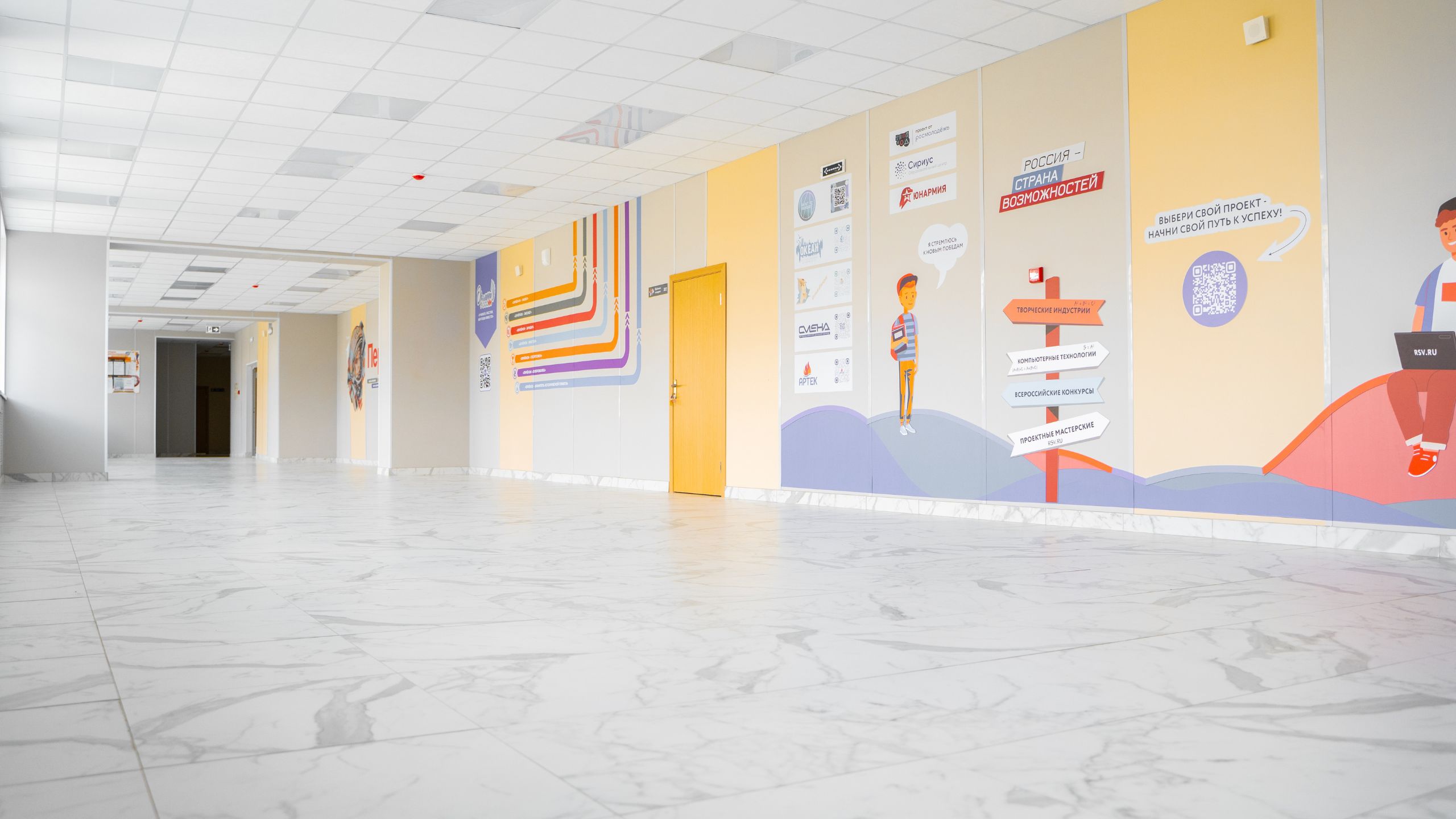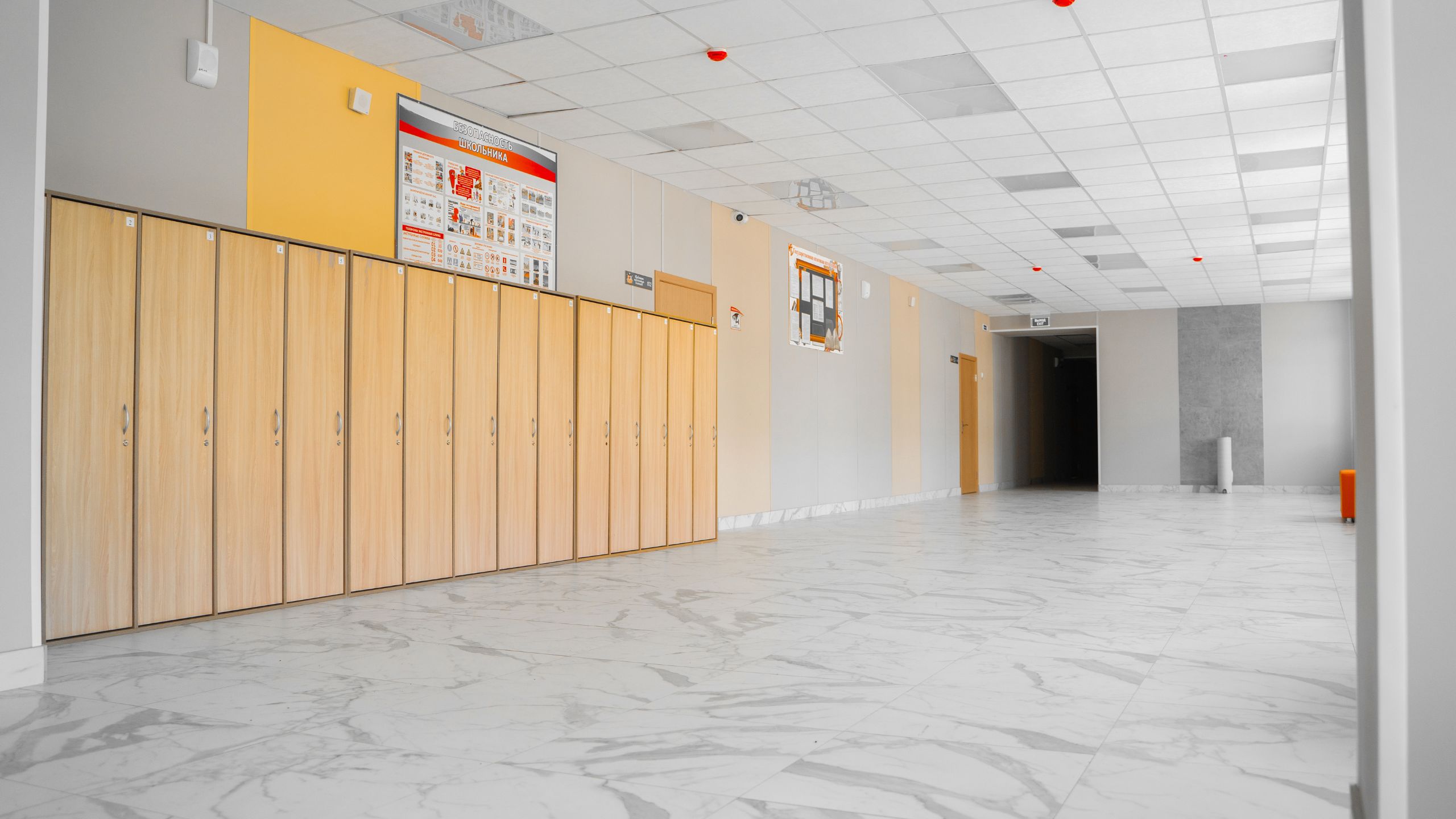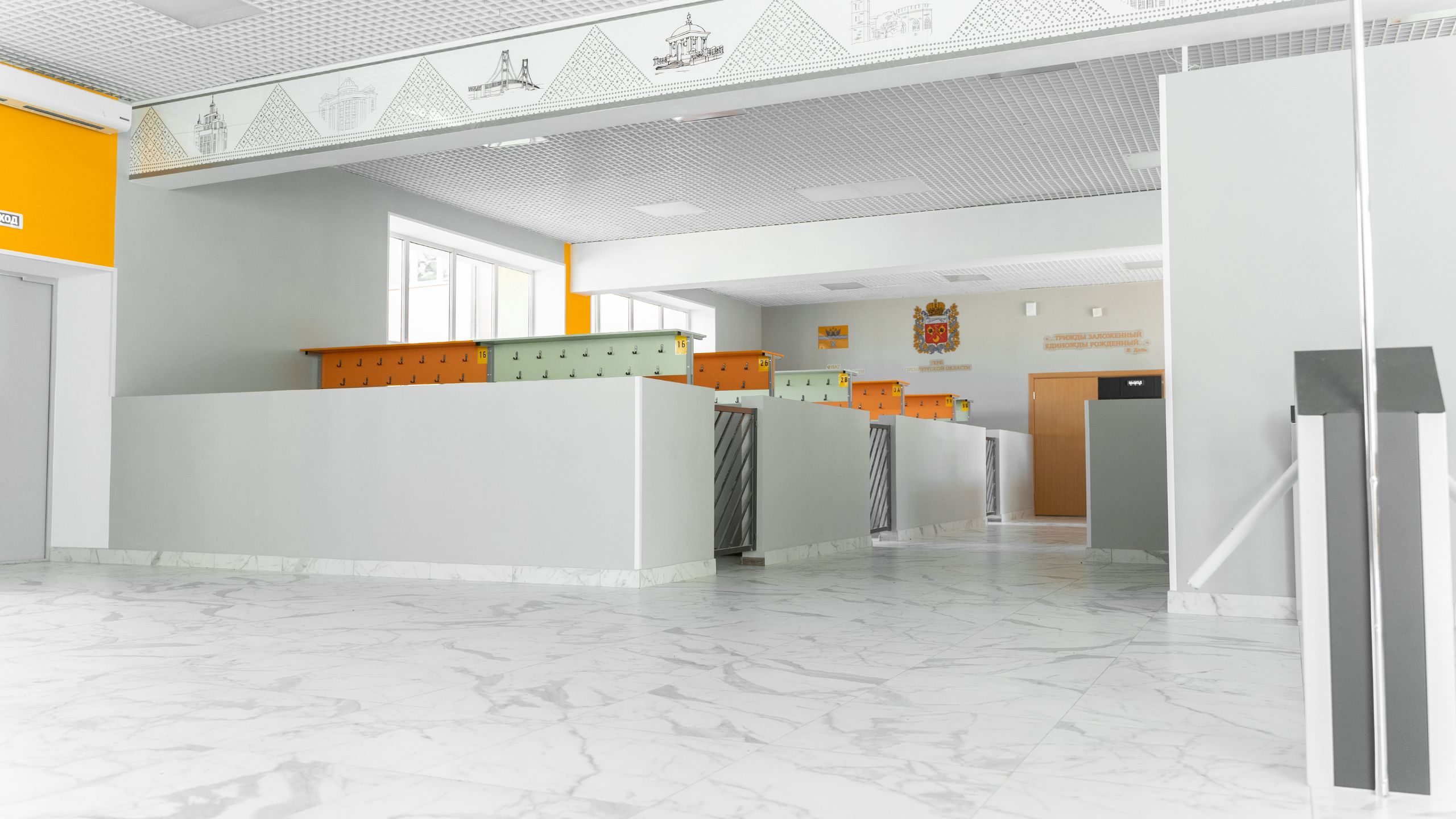 Белоснежную отделку школа в Оренбурге приобрела благодаря коллекции керамогранита с имитацией мрамора Melody. Все лестничные пролеты, входная зона, раздевалки — все выложены керамогранитом Melody. Для отделки санузлов выбрали керамогранит из коллекции Vision в сером цвете.