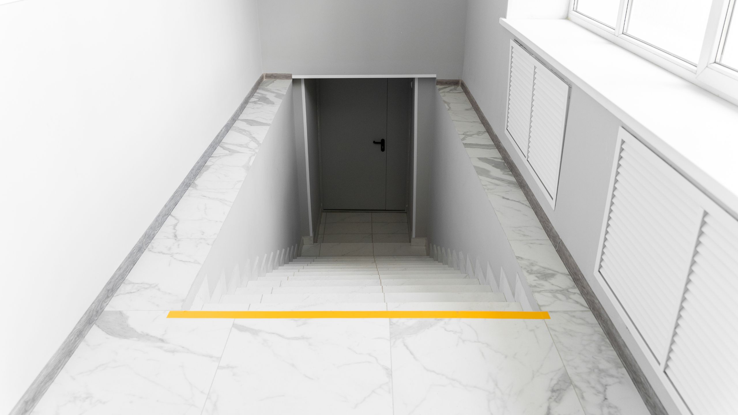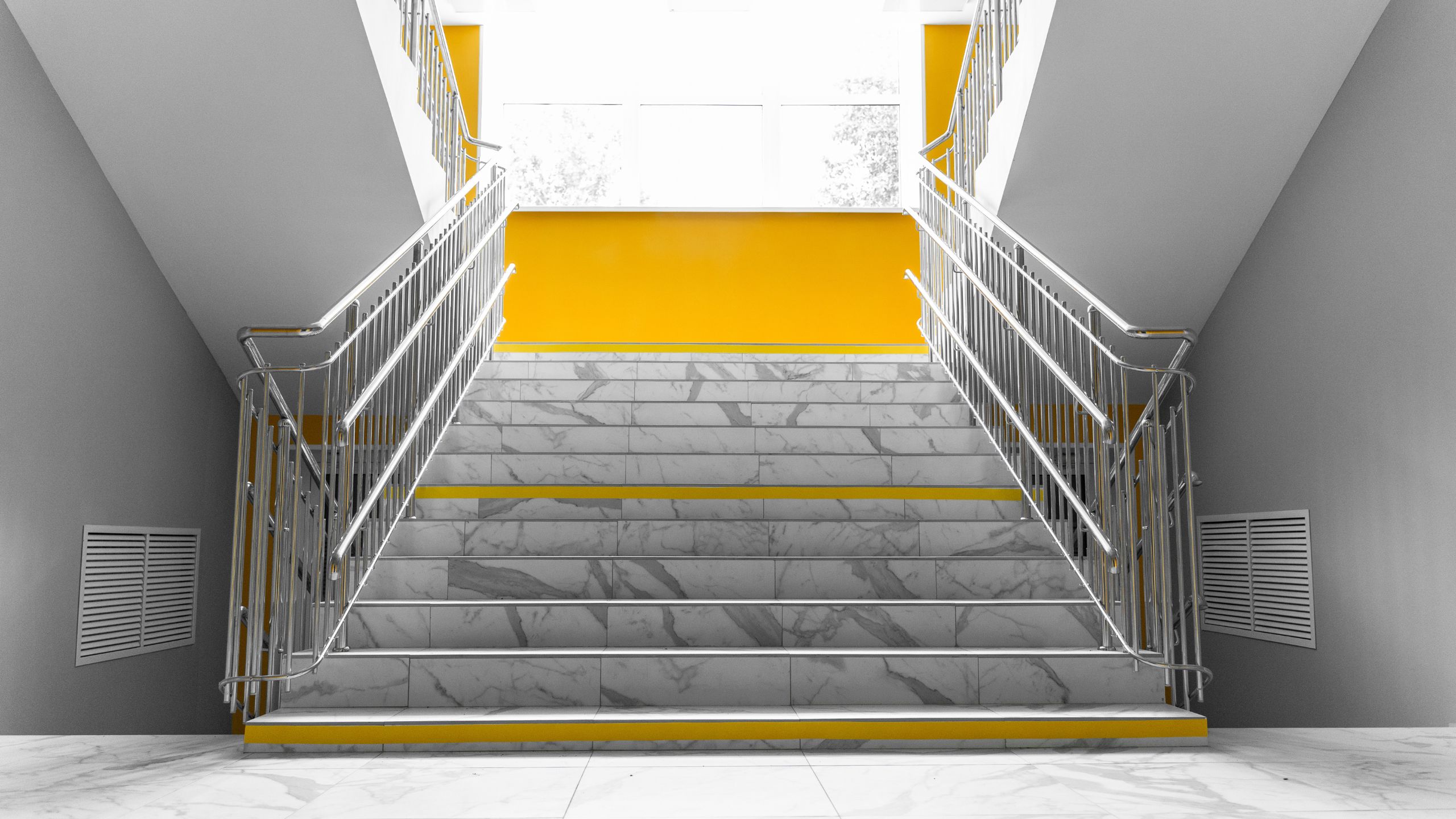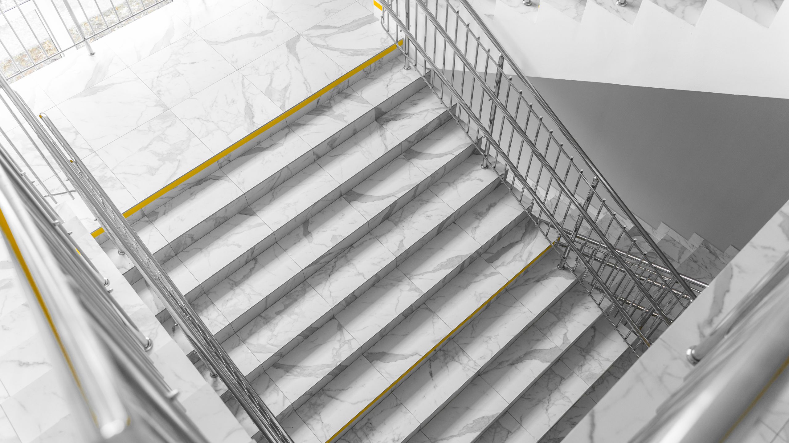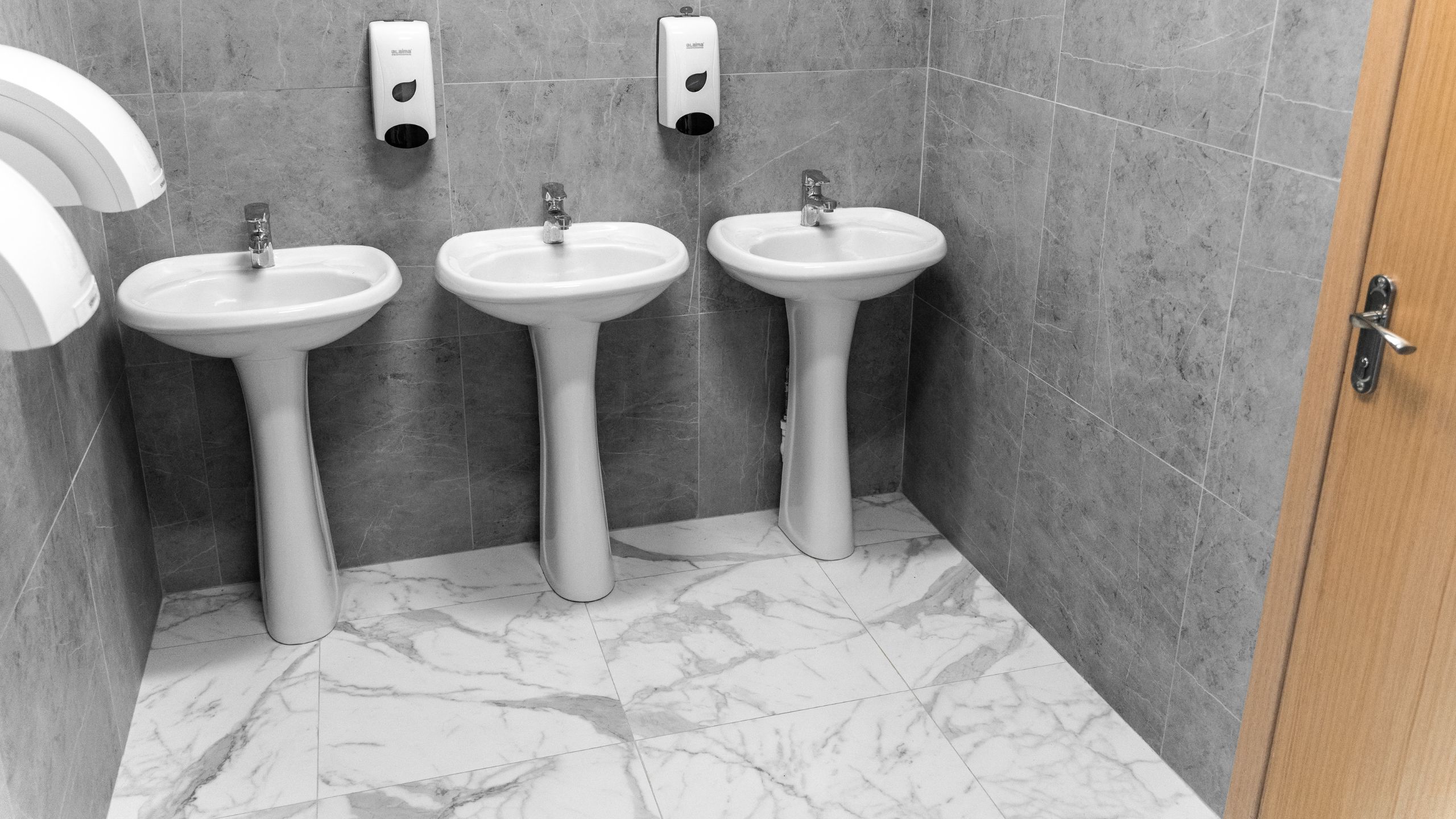 Белоснежную отделку школа в Оренбурге приобрела благодаря коллекции керамогранита с имитацией мрамора Melody. Все лестничные пролеты, входная зона, раздевалки — все выложены керамогранитом Melody. Для отделки санузлов выбрали керамогранит из коллекции Vision в сером цвете.