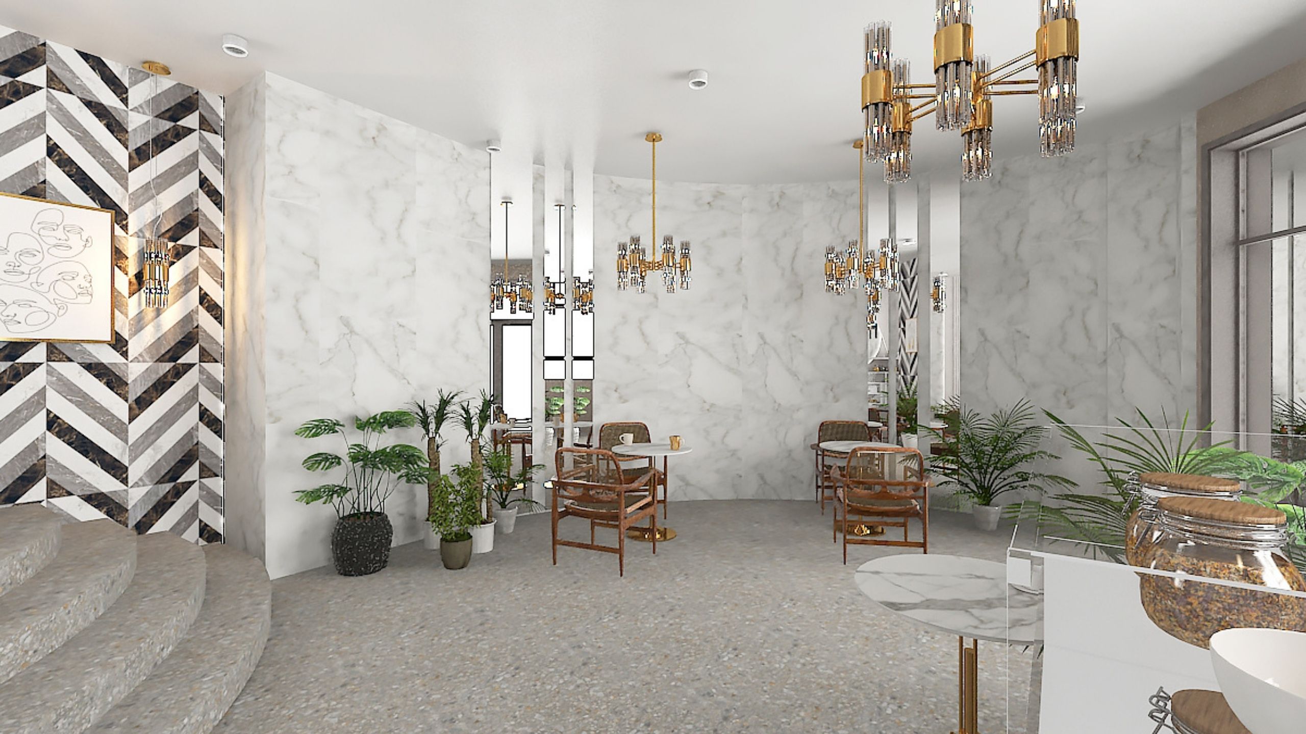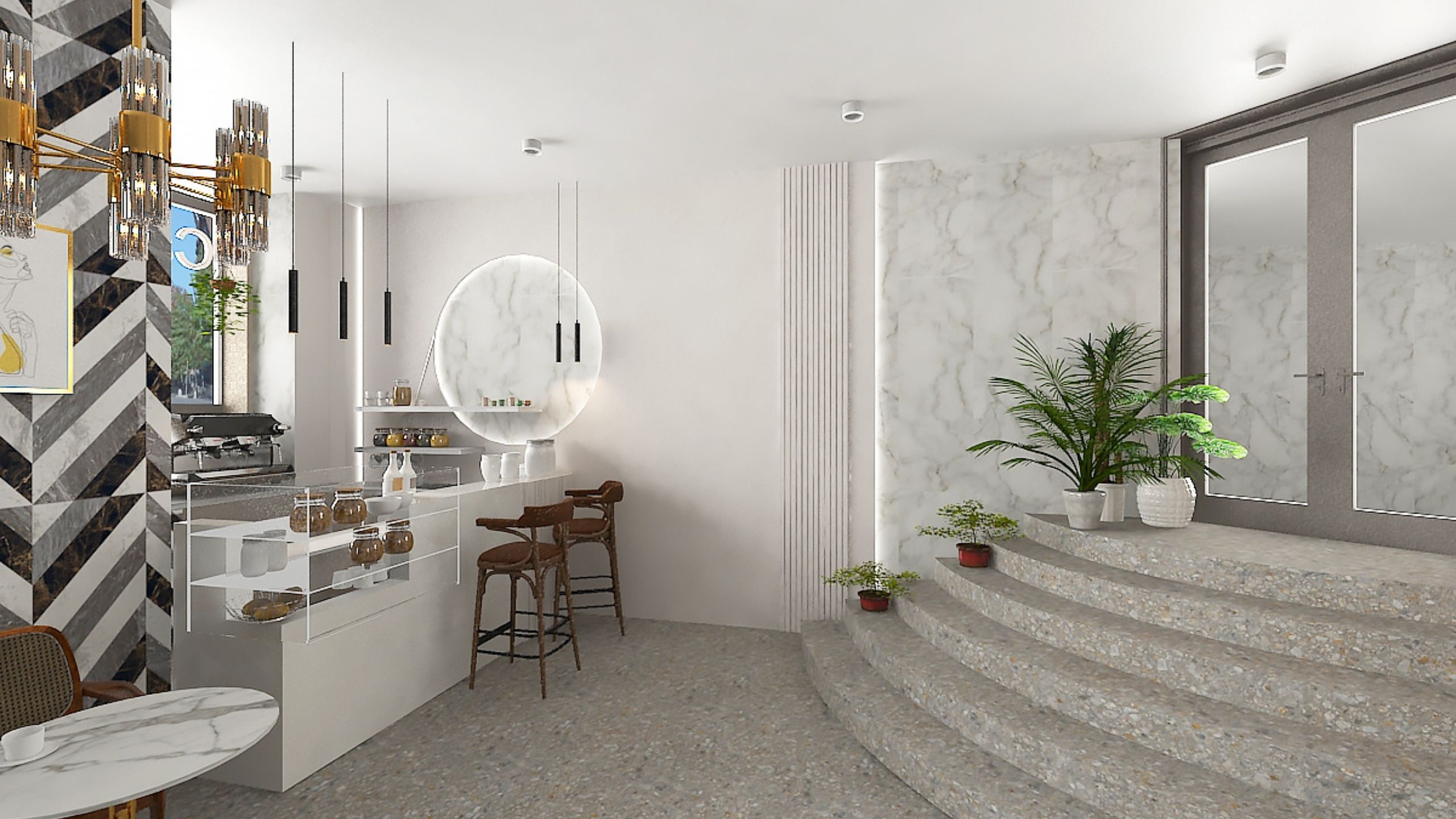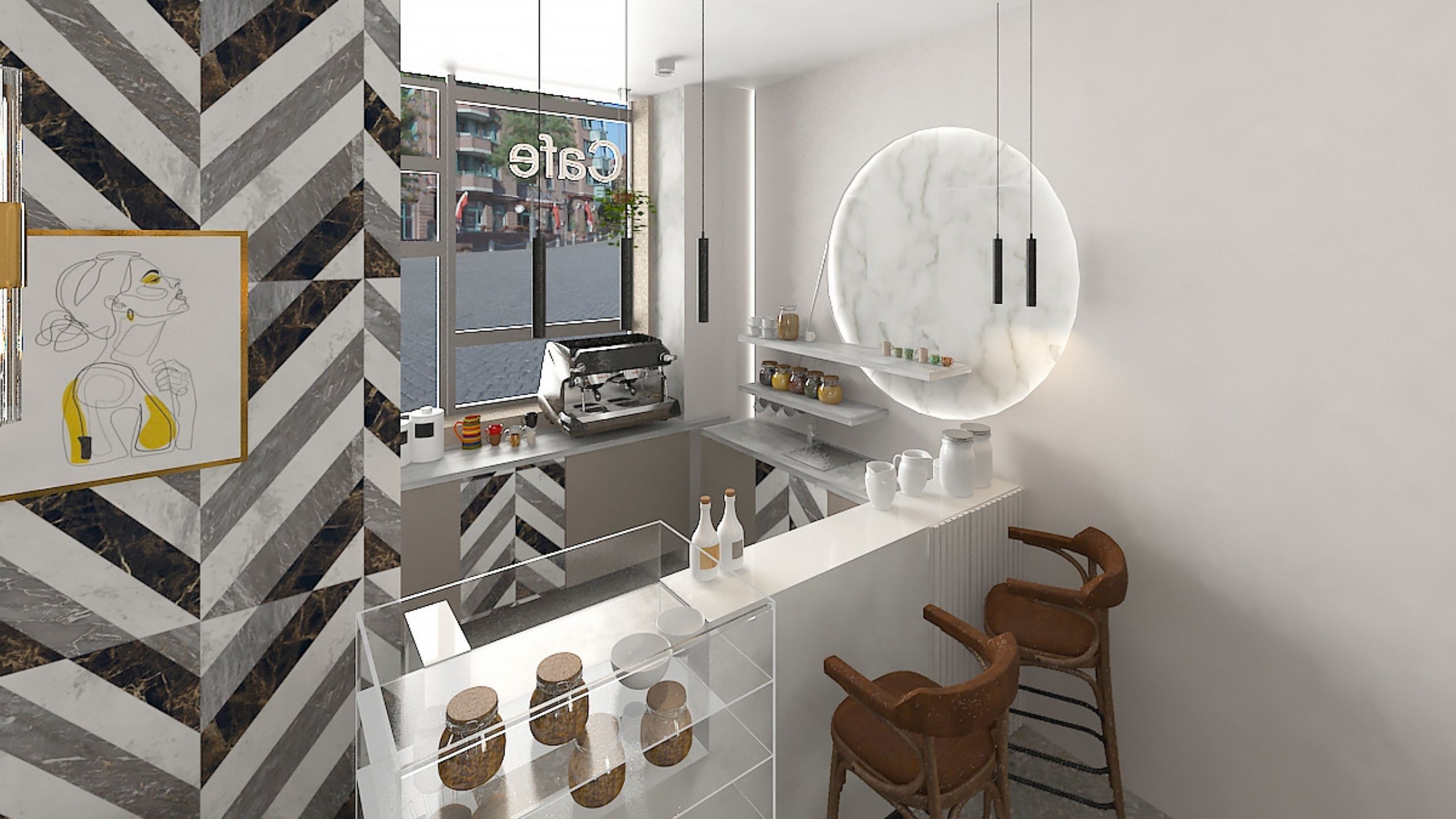 Дизайнер Надежда Смирнова приняла решение создать не просто интерьер кофейни, где будут варить вкусный кофе, но и продумать комфортные места для отдыха, приятных встреч и переговоров сотрудников и посетителей бизнес центра. Автор проекта интегрировала уже существующие полы тераццо из мраморной крошки в концепцию интерьера. Стены также оформили керамогранитом ТМ Estima из коллекции Alba, а колонны — коллекцией Chambord.