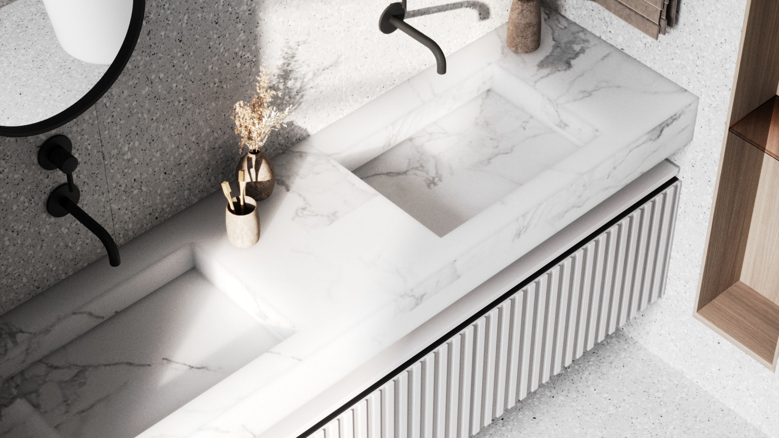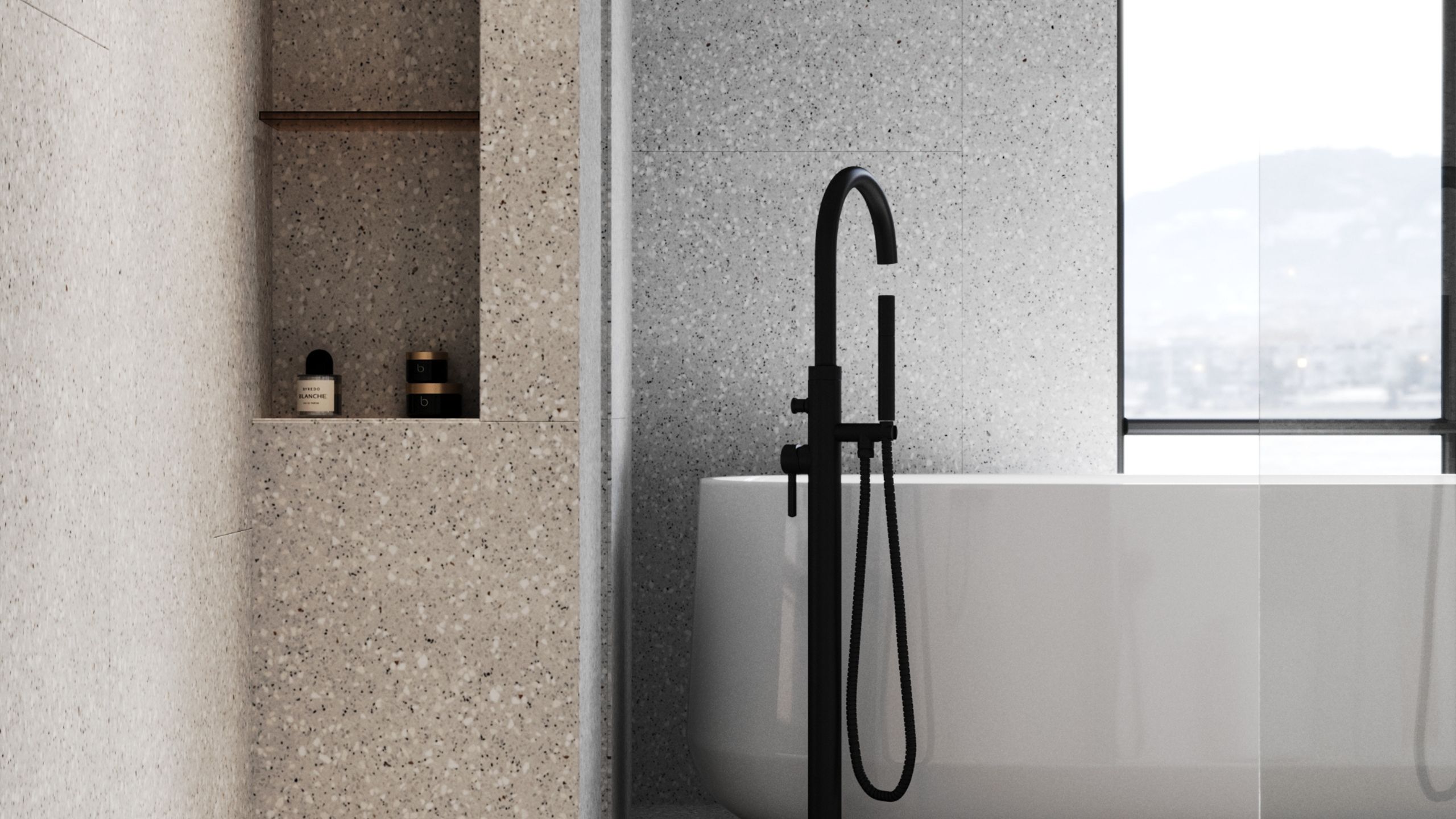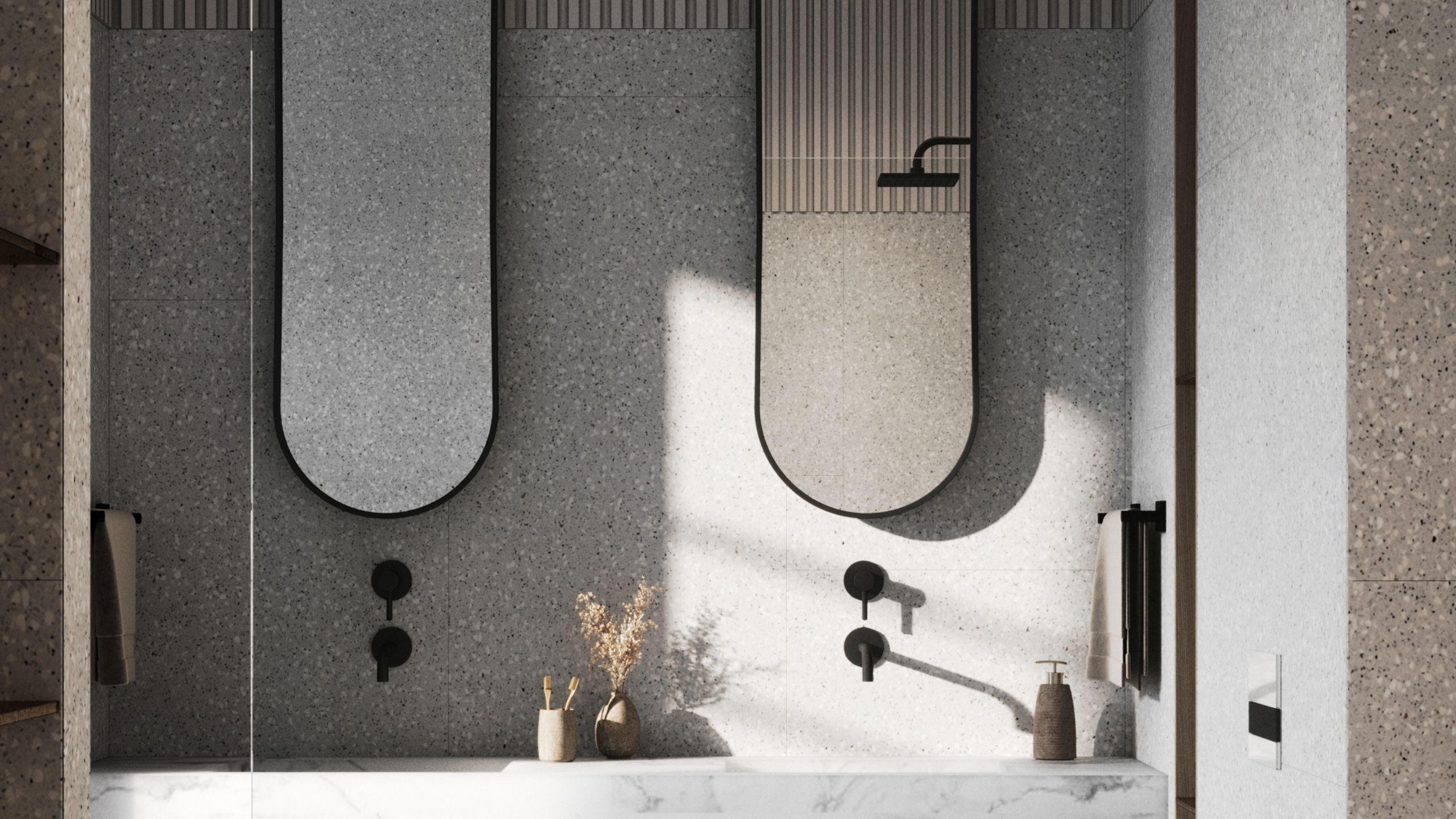 Ванна обтекаемой формы напоминает капсулу, миниатюрный космический шаттл, а иллюминаторы — большие, вытянутые зеркала. Дизайн интерьера выстроен по канонам минимализма. гладкие и ровные поверхности, отсутствие большого количества декоративных элементов, простор и свобода от визуального шума. В такой ванной действительно оказываешься будто бы на другой планете.