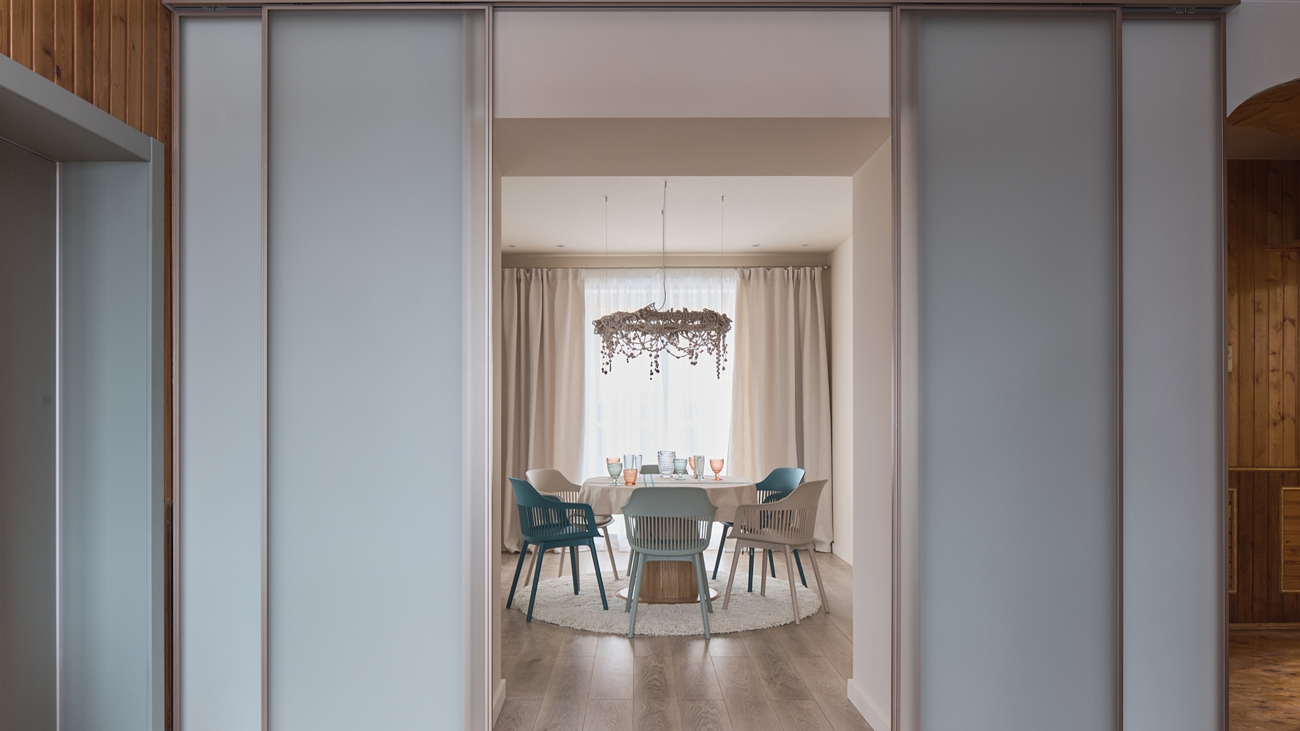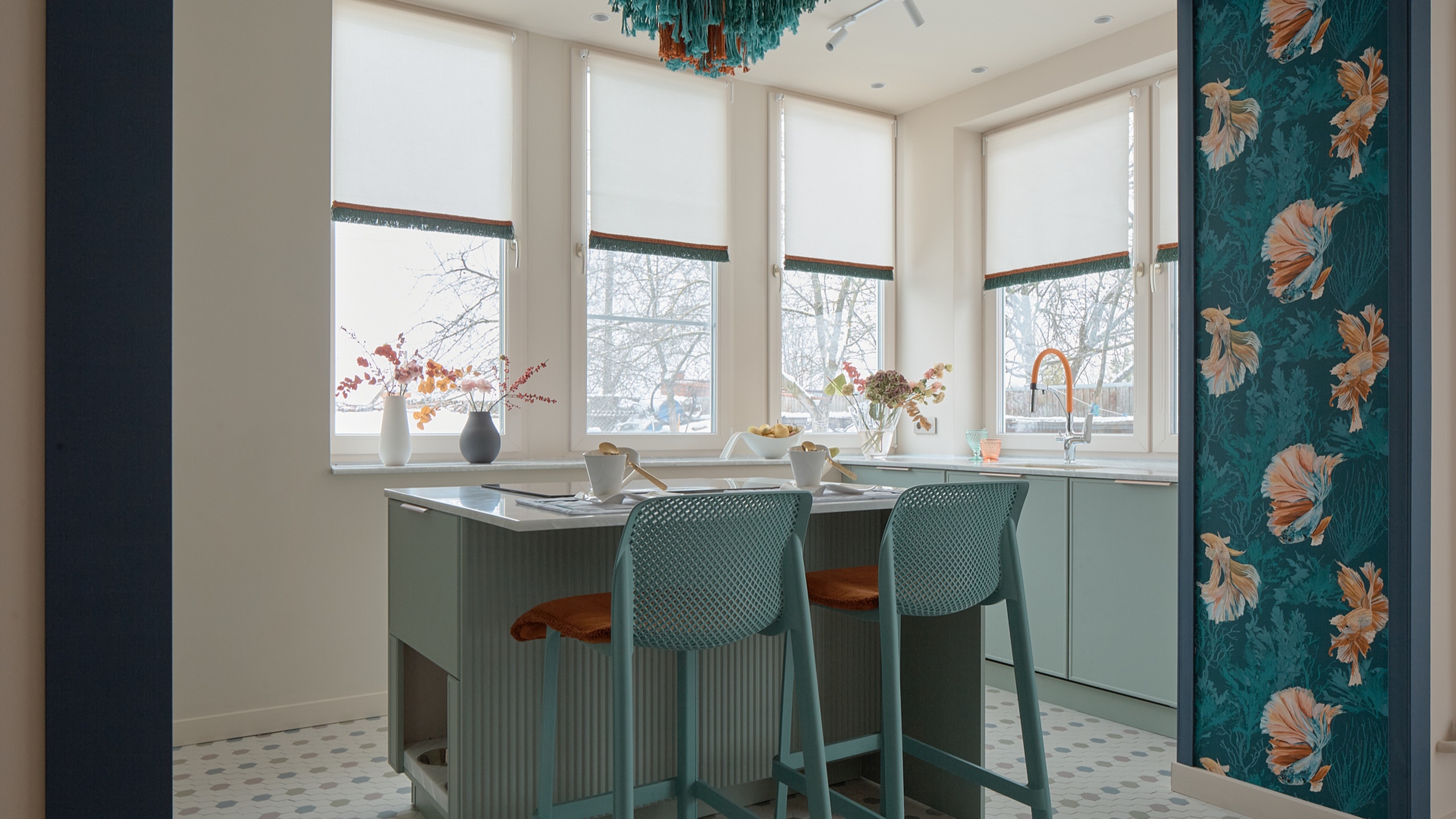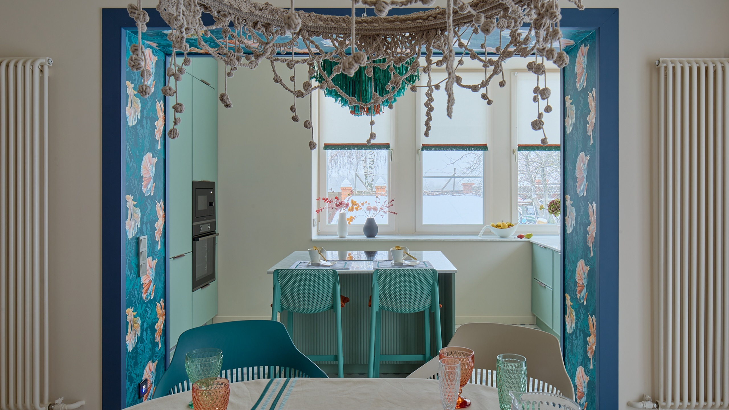 Дизайнер программы «Дачный ответ», Громова Анна, вдохновилась увлечением хозяйки рыбалкой и отразила это в интерьере. Люстры, напоминающие рыбацкие сети, обои с изображением рыб в портале и цветовая палитра, напоминающая подводный мир, создают атмосферу уюта и единения с природой.