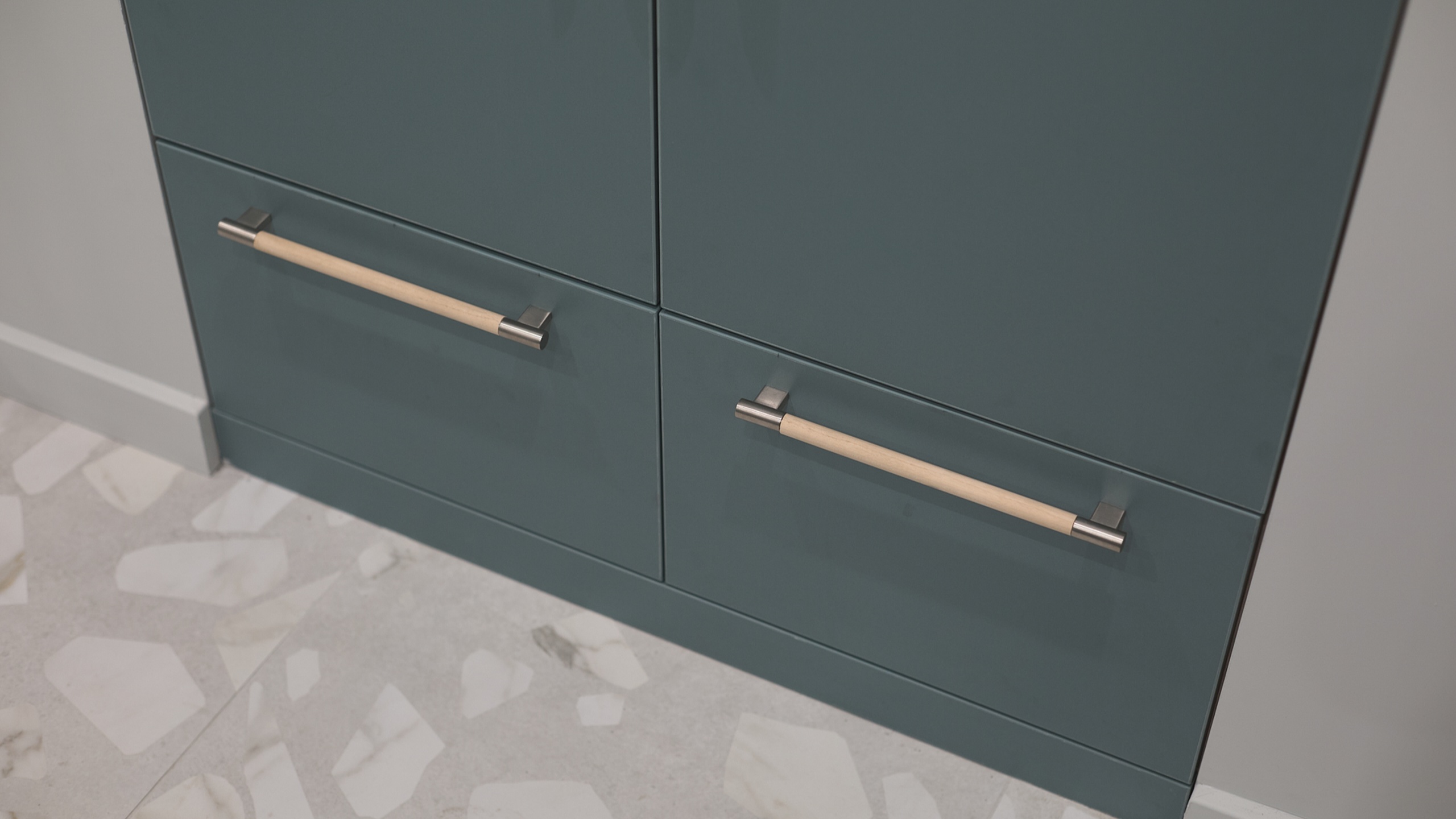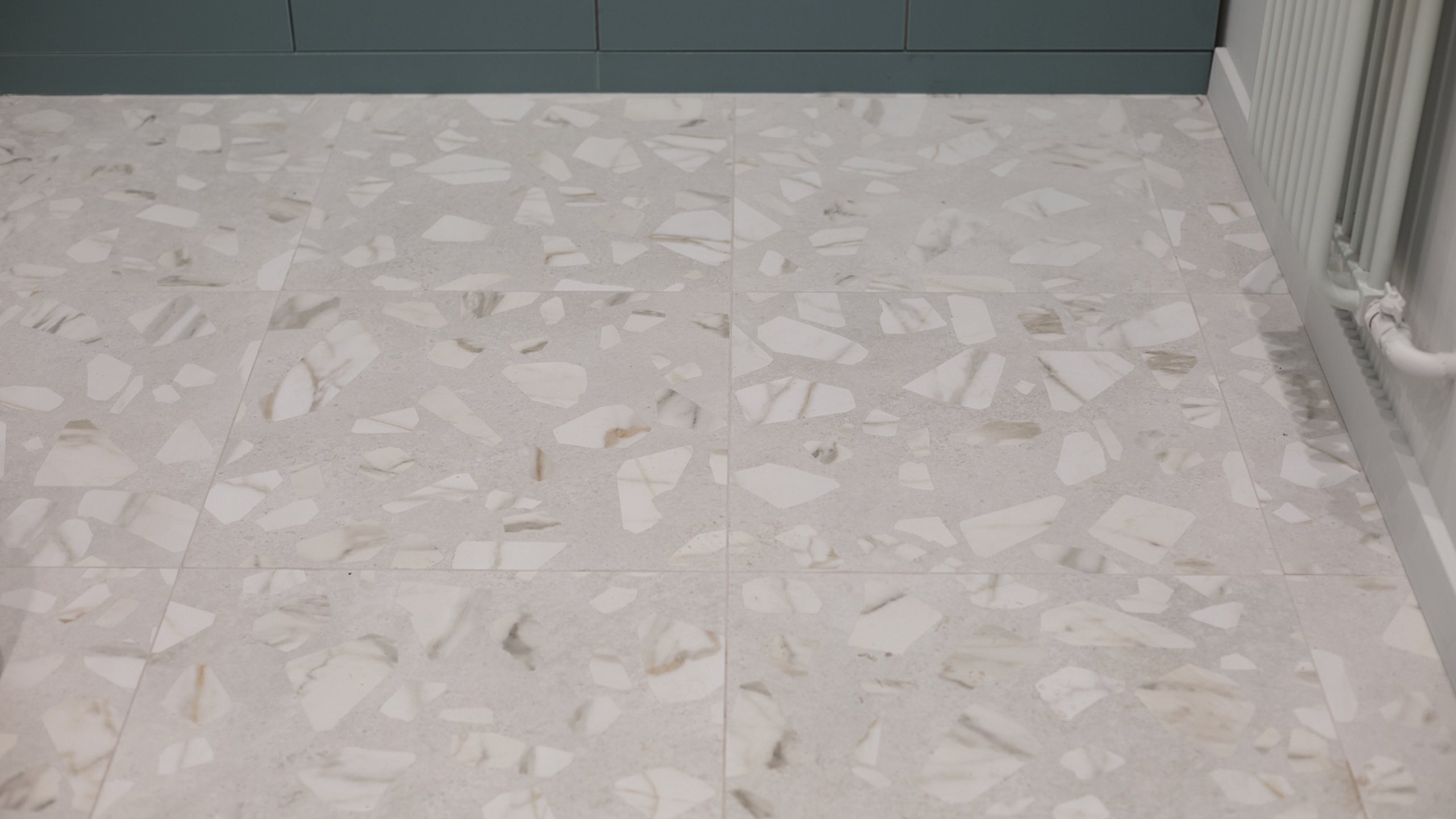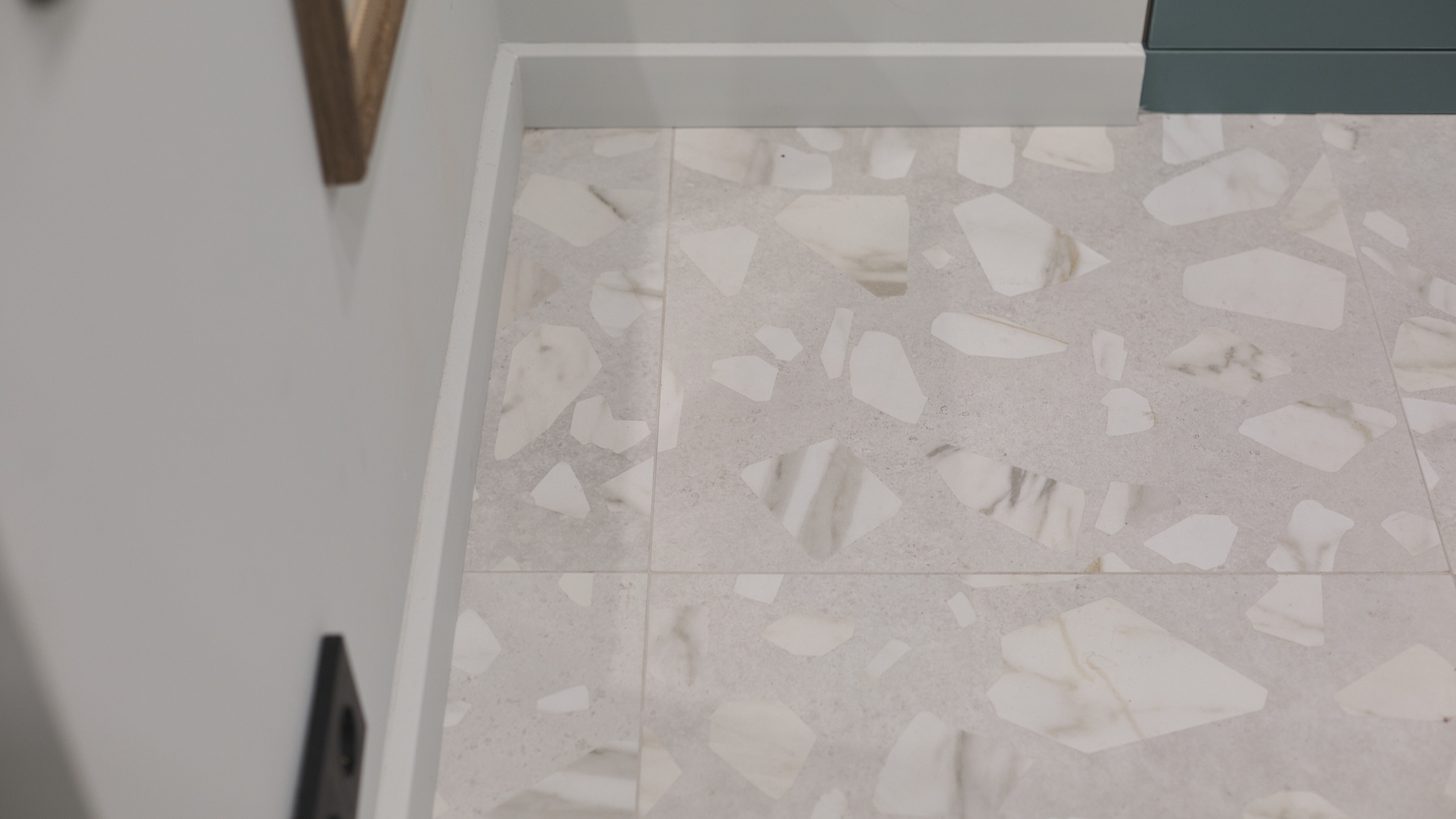 В интерьере использован керамогранит из коллекции Arti, в стиле венецианского терраццо, который добавляет интерьеру элегантности и гармонично сочетается с общей концепцией.