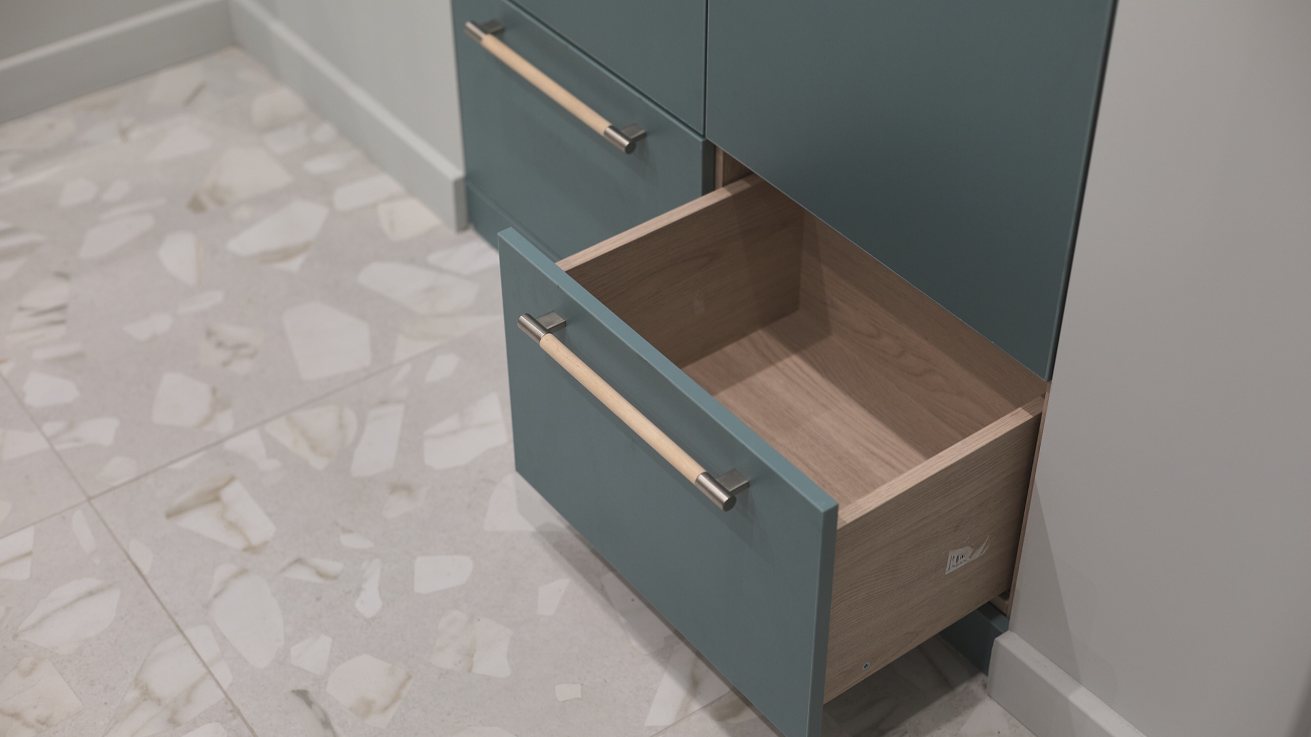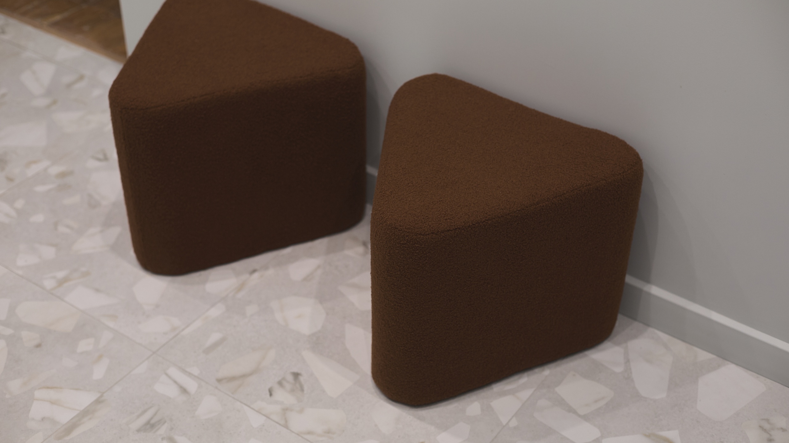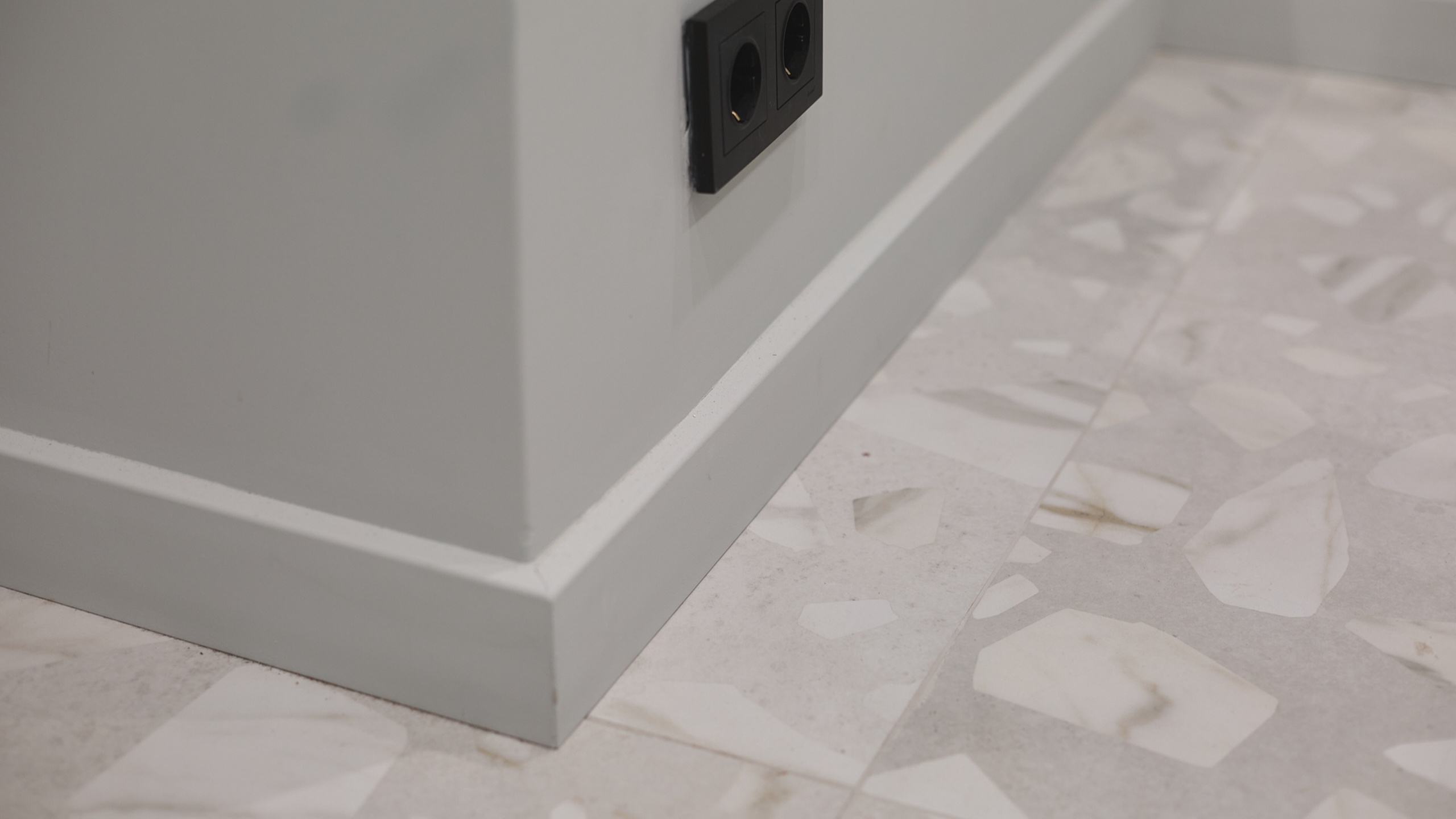 В интерьере использован керамогранит из коллекции Arti, в стиле венецианского терраццо, который добавляет интерьеру элегантности и гармонично сочетается с общей концепцией.